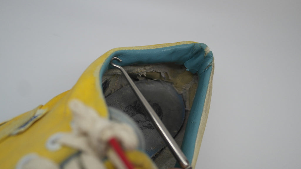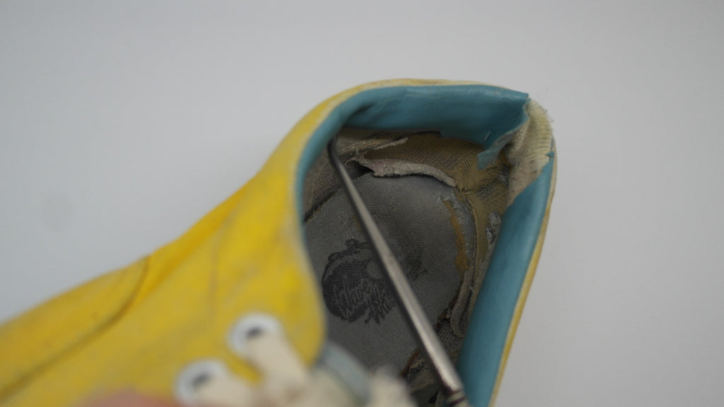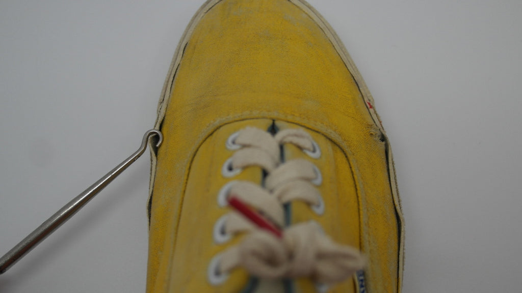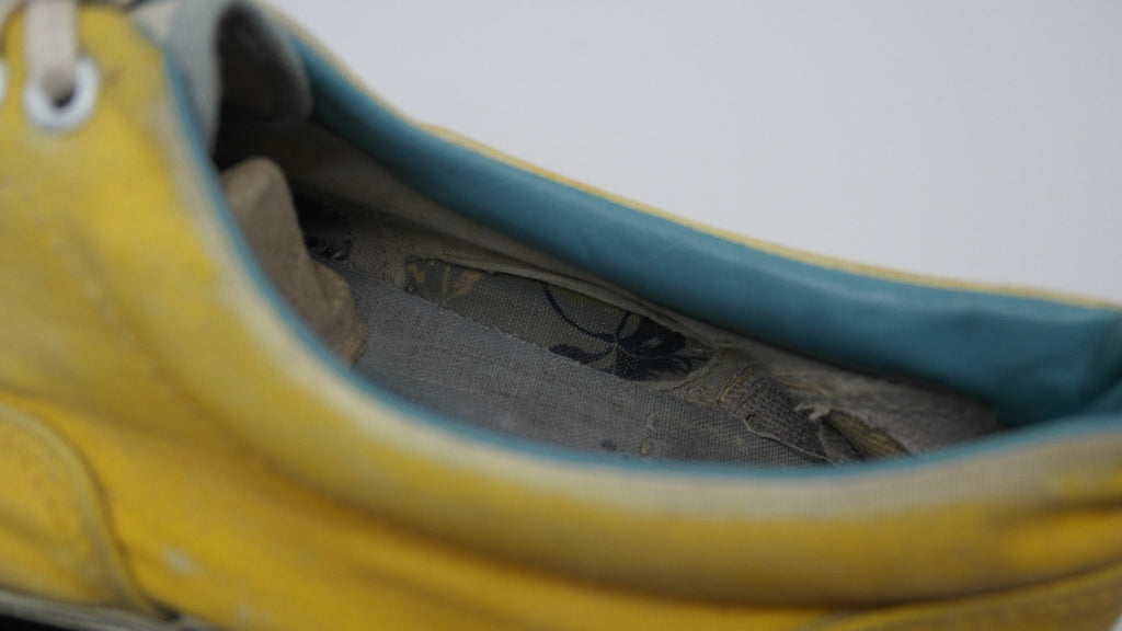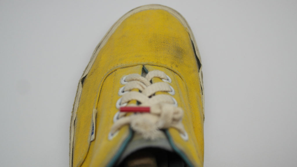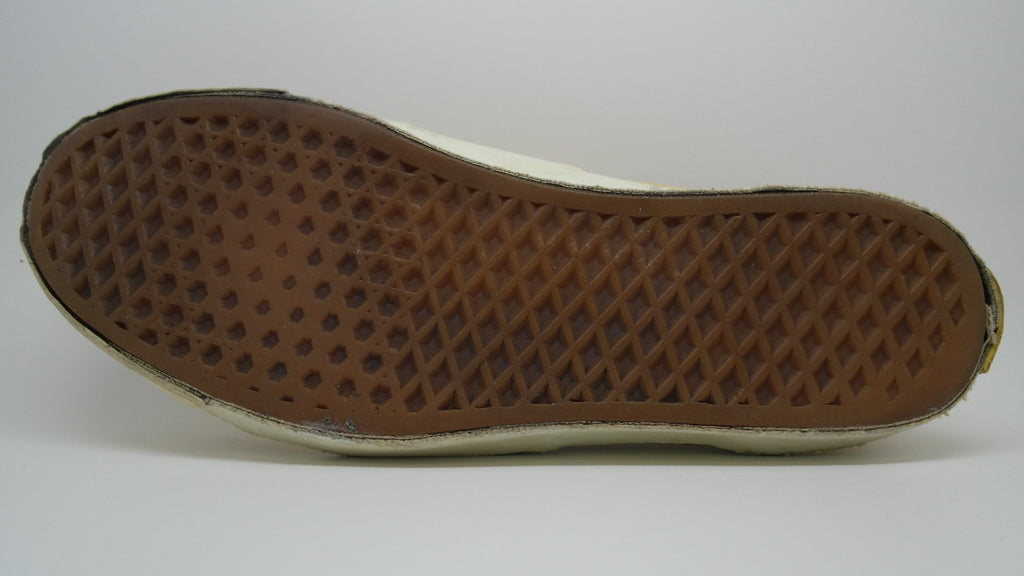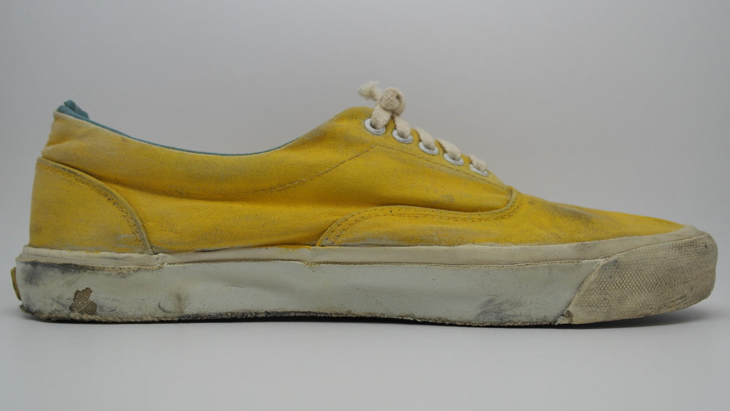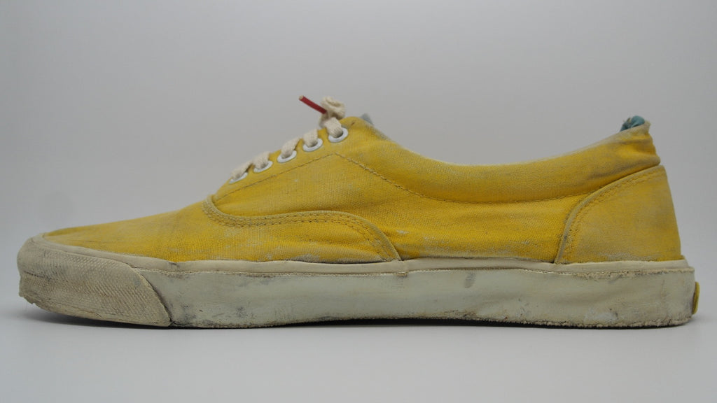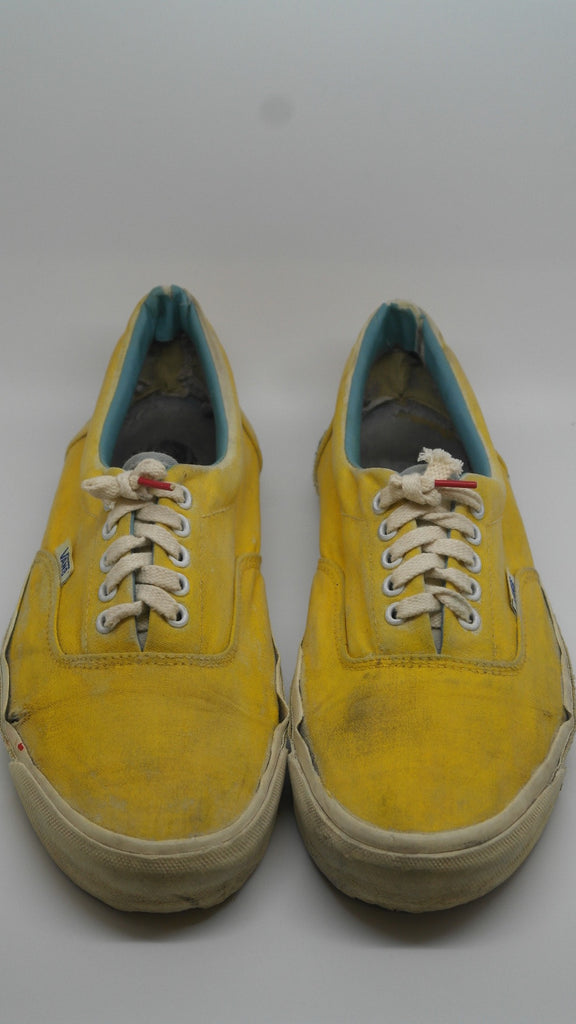 these were originally 'wave-washed' hibiscus printed eras from the 'surf lovers' line however they were diy custom painted with yellow paint. they have seen good wear however rubber remains soft & flex with minor separation between uppers at toe crease area only. the internal heel counters see some wear but mostly superficial to the canvas lining, & minor splits to the plastic. the vinyl collar shows some splitting & loss & there is wear to the internal heel cap through to the canvas. still plenty life left! the size is not visible however im confident they are US11.5 if not US11. check measures!