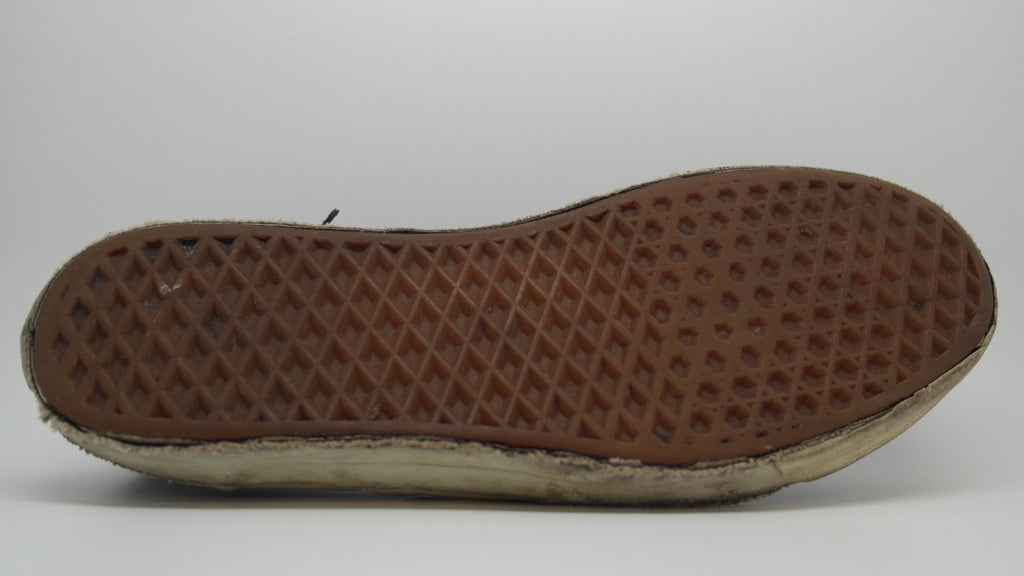 good used condition. have seen wear but remain structurally sound. rubber shows very minor dryness & small separation from uppers in areas. there is some separation between bumpers & foxing & small splits to the vinyl collar on the inner right shoe. size is not visible however im confident they are US10. saying that slip-ons fit large & therefore may suit better US10.5. please check measures.