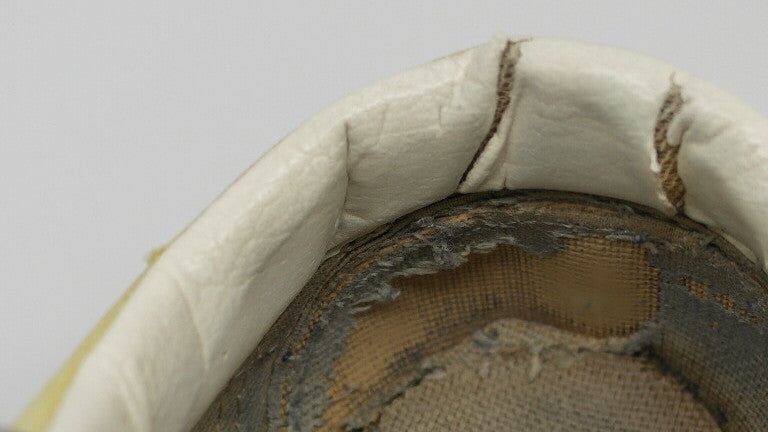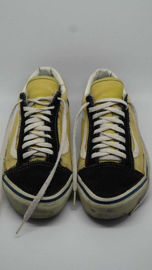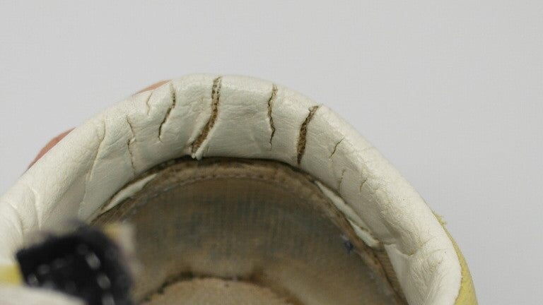 these have seen good action. the rubber has hardened in places & split at the toe crease including 1 small tear to the lateral canvas on the right shoe. widespread micro-cracking to midsole, several splits in the inner vinyl heel & wear to the inner lining at the heels.