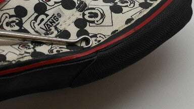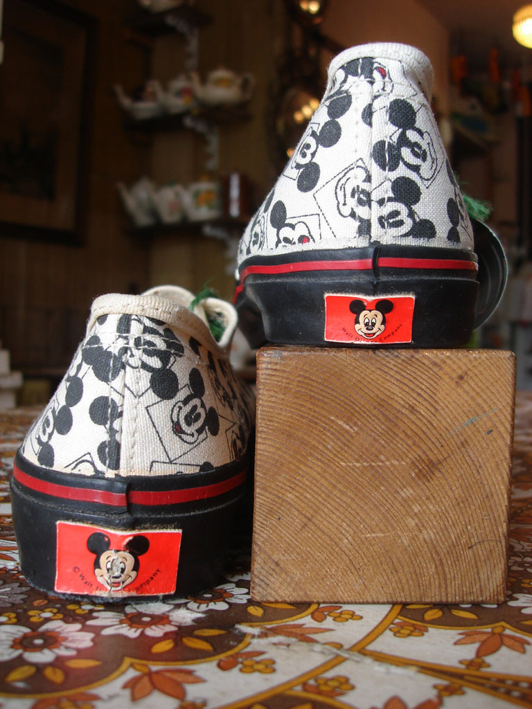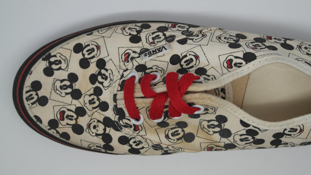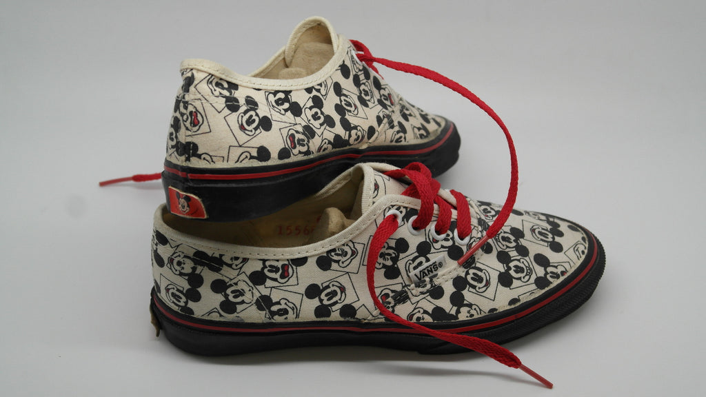 please note disney vans were produced in womens sizing only with resulting narrow width more suitable for the female foot. the mickey mouse models were available with a standard thick sole or thinner sole. the above are all thinner b soles except for the 1st pair pictured. resulting from this the heel tabs came in 2 sizes (see last pic) & did have the tendency to peel away & dislodge . wear at own risk!