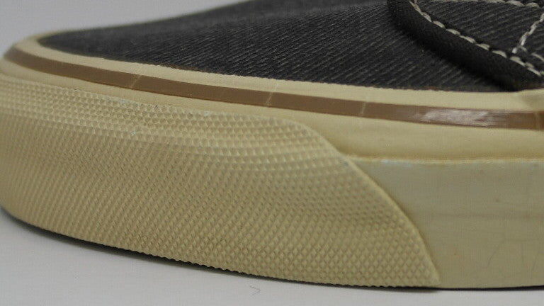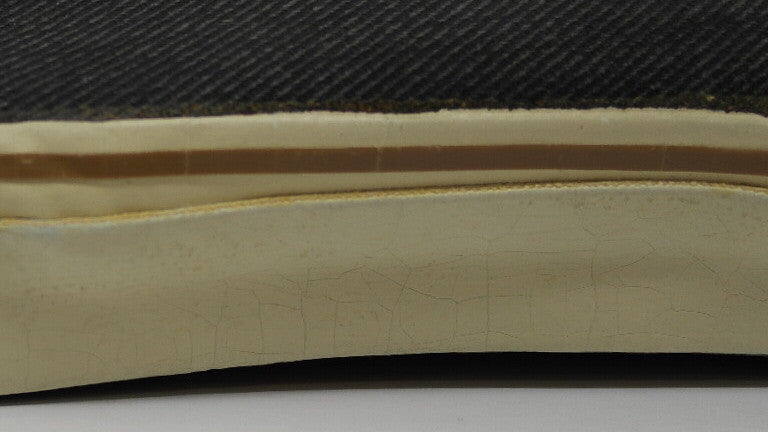 new with defetcs. both shoes show widespread discolouration from exposure to light. the left toe & lateral side is worst with some dryness & stress cracking. from experience the rubber normally holds up. if anything the harder compound of the tan foxing stripe may crust away. wear at own risk!