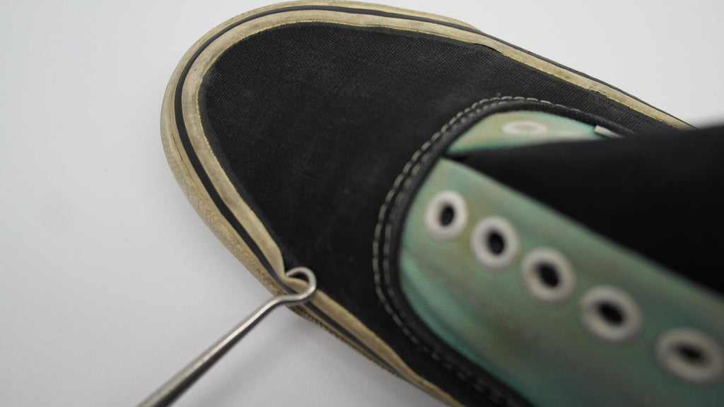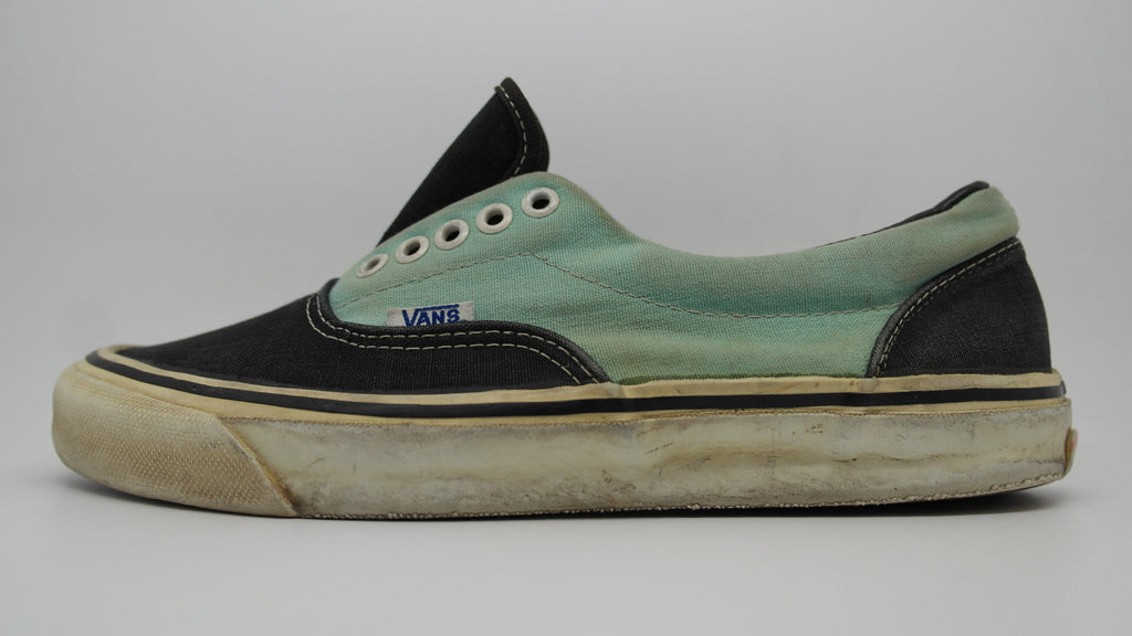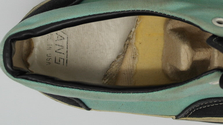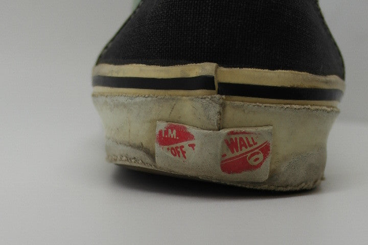 these have seen some good wear however remain structurally sound. rubber is soft & flexible with minor separation between uppers & rubber at toe crease. canvas is faded with minimal staining. the inside toe cap does show wear through to the canvas at both big toes. the muslin surface to the footbed has been torn away to the vinyl heel pads however will not effect wear. laces missing. wear at own risk