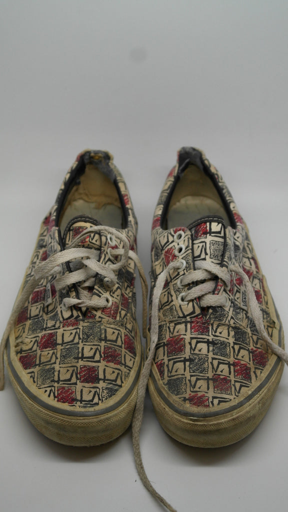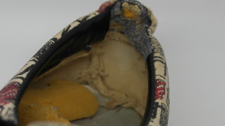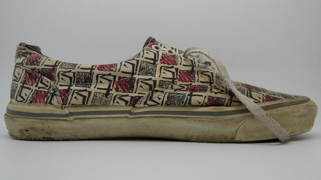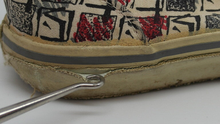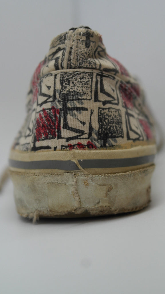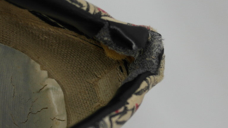 well worn with decent external appearance however considerable structural wear. widespread micro-cracking above & below foxing stripe, including 1 split at the toe. hole in canvas at right little toe. several areas of separation between rubber & uppers. extensive blow out to inside right heel with missing foam from padded collar. hessian surface of footbed has been torn away to vinyl heel pads with resulting wear into the foam at the toes. inside toe cap & inner lining wear. laces dog-eared. wear at own risk