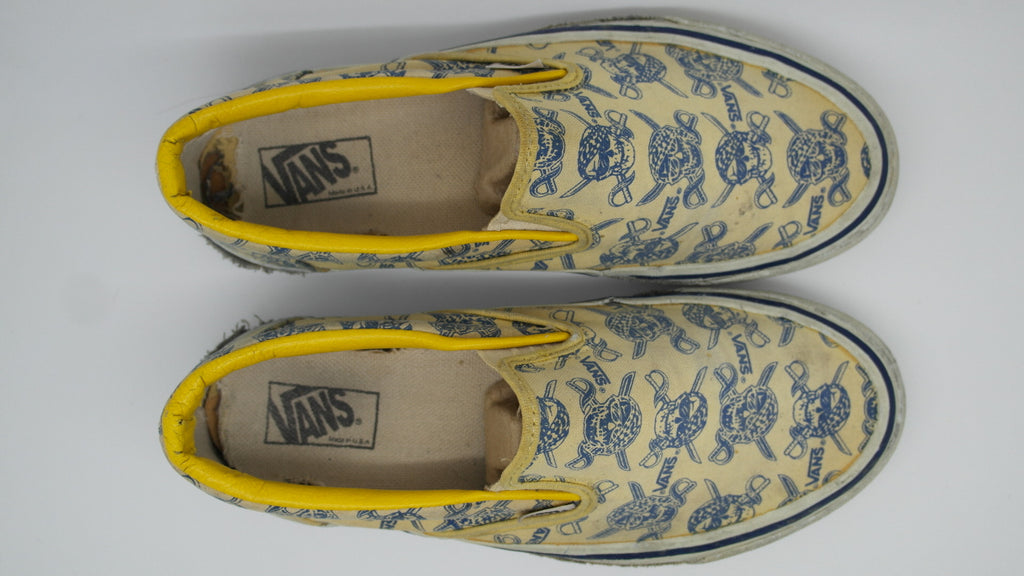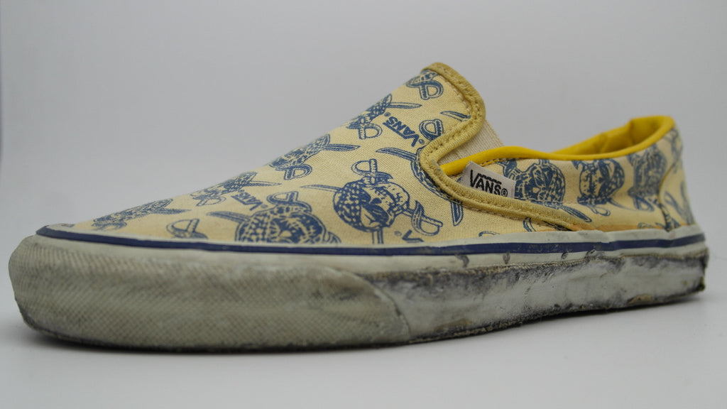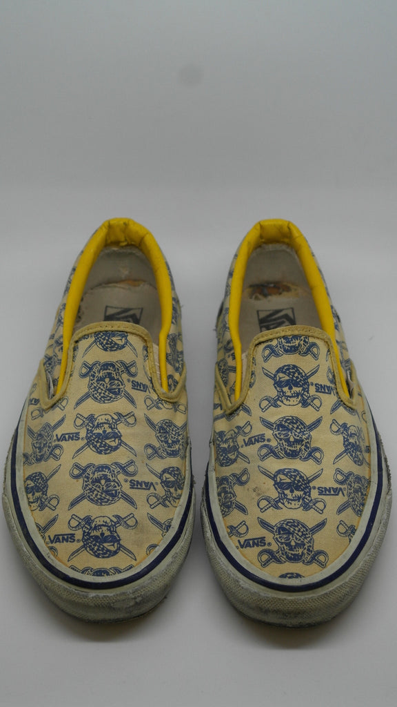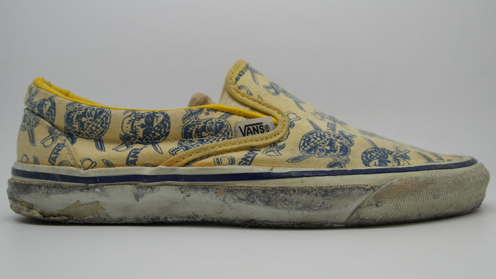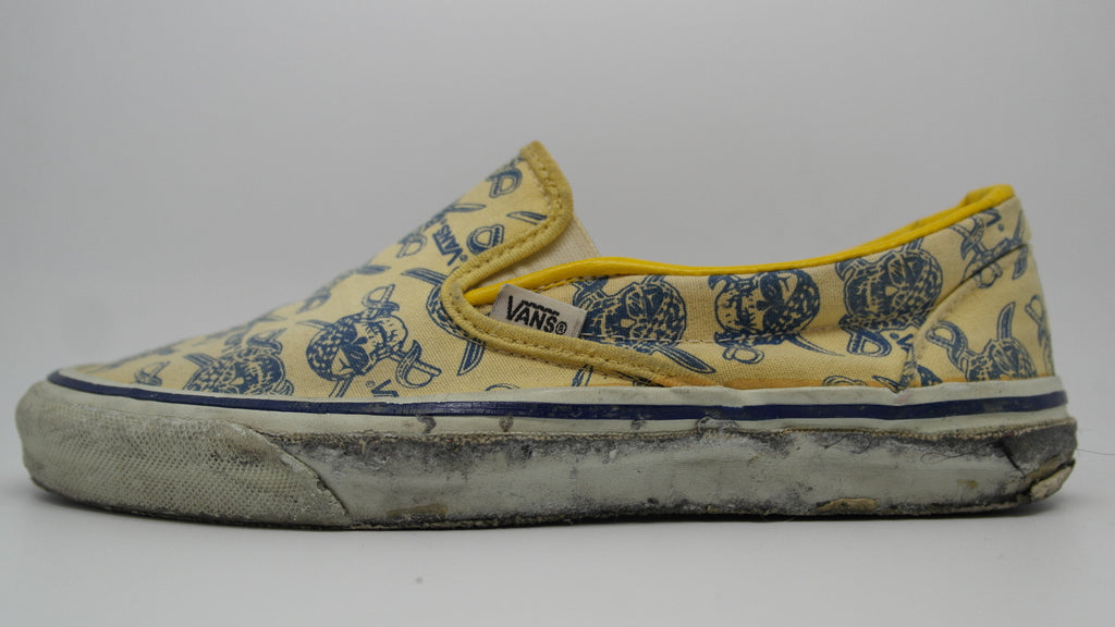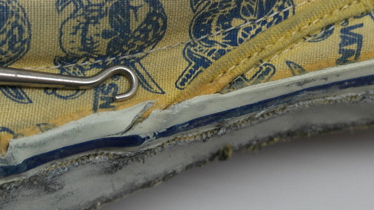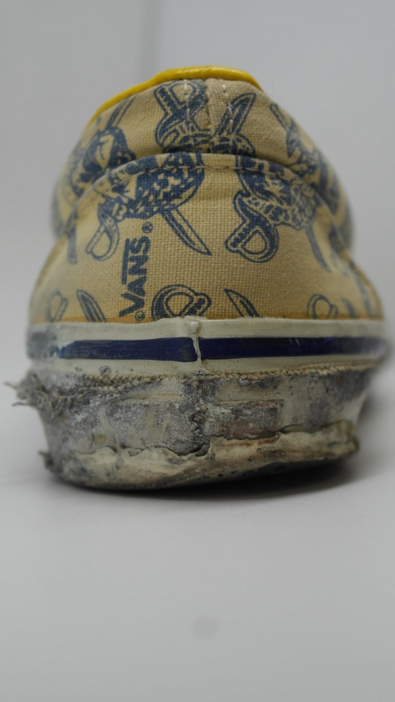 these show extensive wear inside & out. the rubber remains soft & flexible on the whole however does show stress cracking, splits & areas of wet rot. shoe goo repairs to the external heel are only signs of outsole wear. several splits to vinyl collar & wear to footbed at heel & toe. inside toe cap shows wear through to canvas on right shoe. still life left in these. wear at own risk