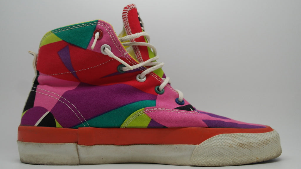 excellent used condition. the foam fiber-fill in the ankle supportive collar has persished with minimal black residue inside the shoe. the original owner wrote happy honey in magic marker on the heels.