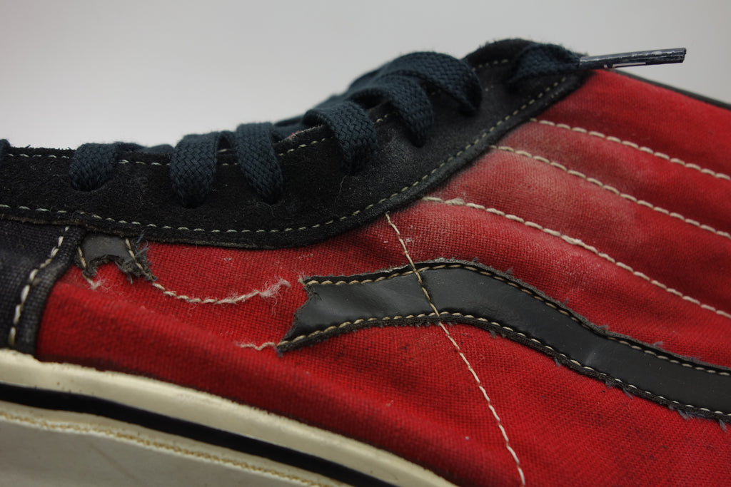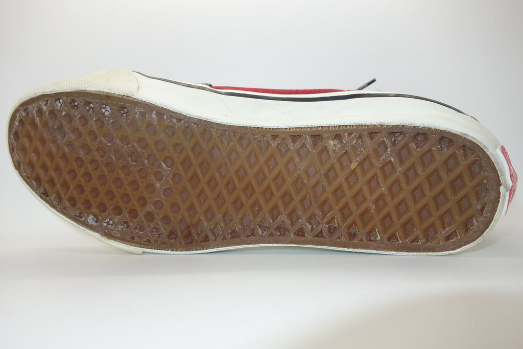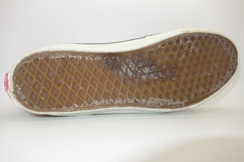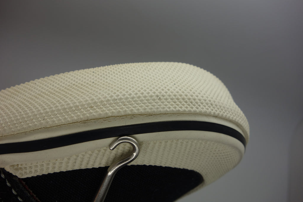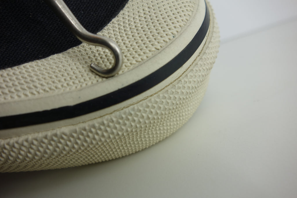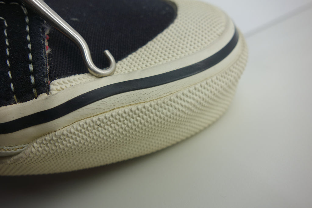 unworn & all rubber remains super soft & near flawless. the foam fiber fill in the tongue has perished & may leave a dry residue on insole & socks. the heelstay & medial jazz stripe shows wear & minimal water damage rsults in canvas blemish.