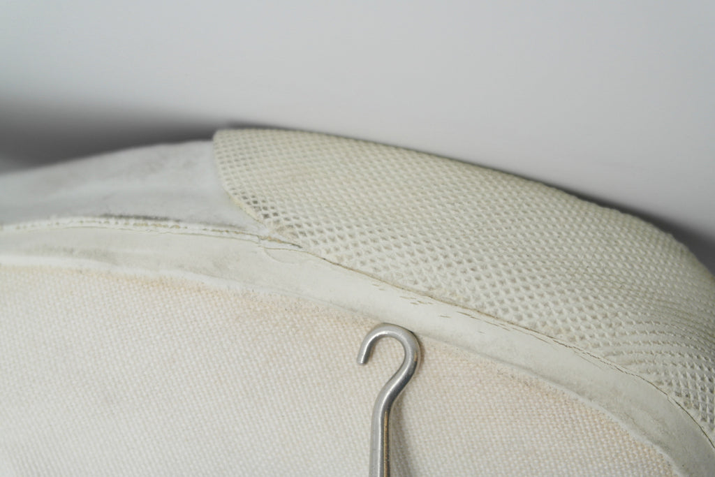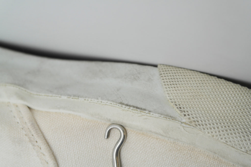 very minor stress cracking from crush injury. despite little difference in waffle length the right shoe is bigger than the left but only marginally. a light dusting of storge wear. the left heel shows yellowing & dryness however will not effect wear