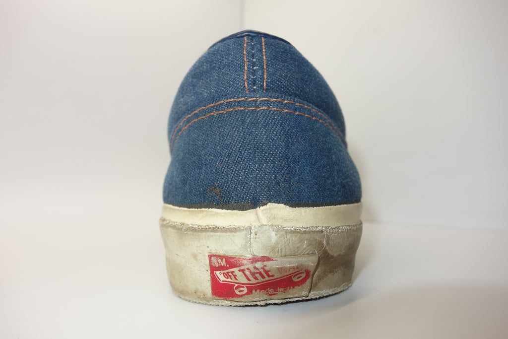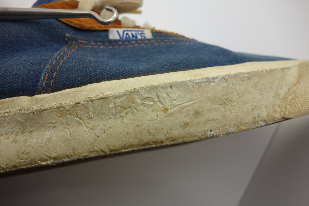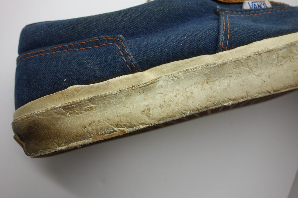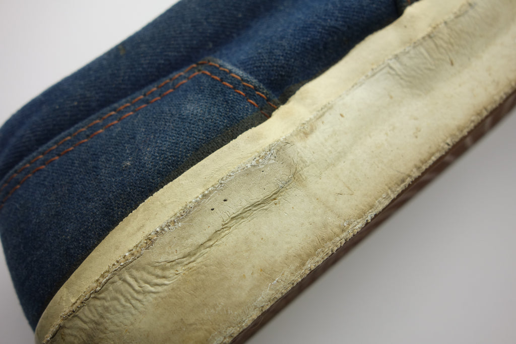 very good used condition. all rubber & the denim remains super soft & flexible. the friction does show impression marks from storage which can be a bad sign.... however in this case not. the vinyl inserts are curling & stiff but can be re-glued. the previous owner stuffed the toes with newspaper which stuck to the internal toe cap which became detached. the denim at the toe is now exposed but i can feel no wear.