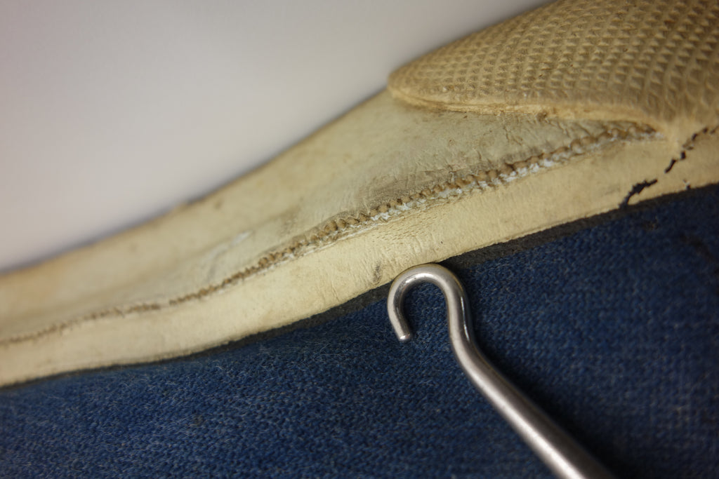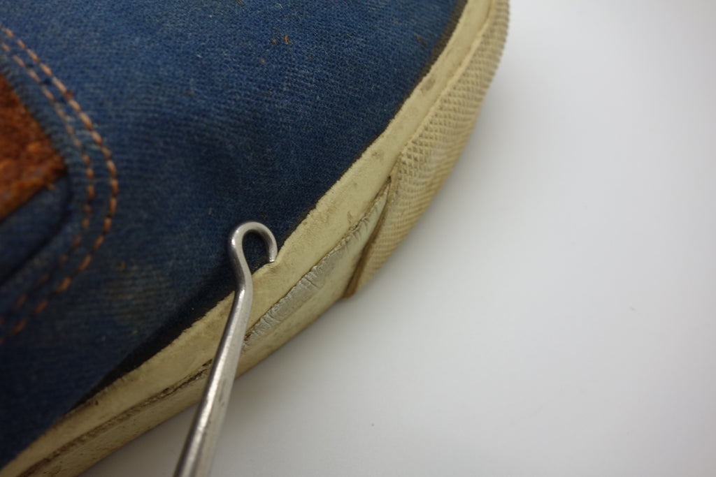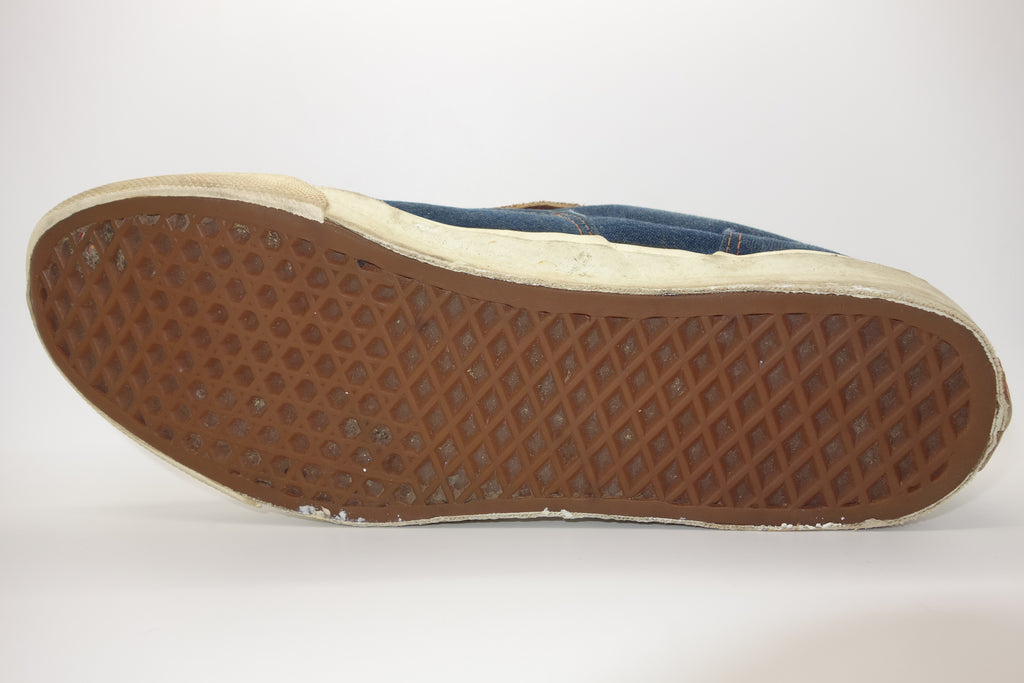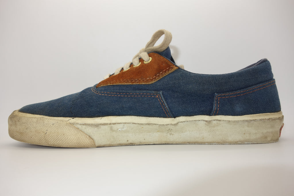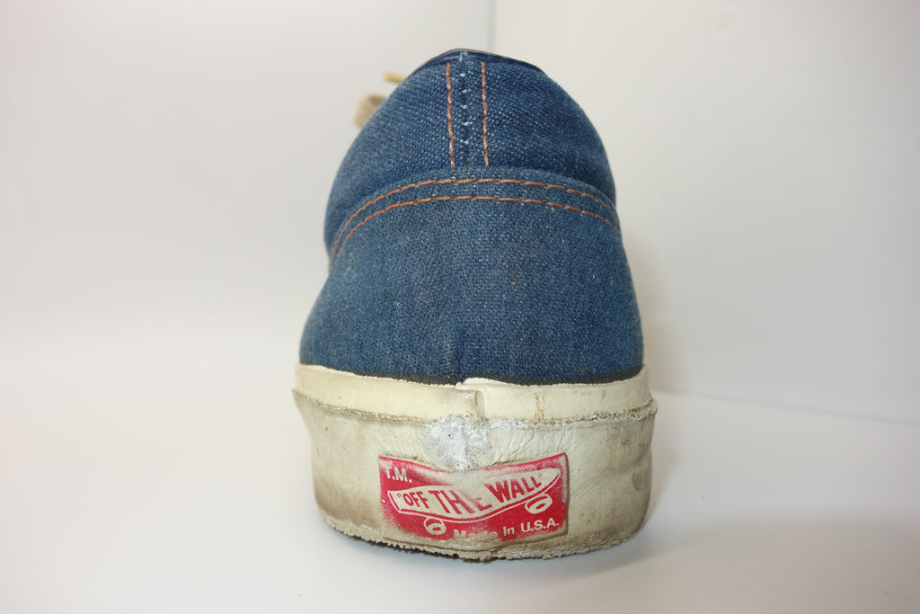 very good used condition. all rubber & the denim remains super soft & flexible. the friction does show impression marks from storage which can be a bad sign.... however in this case not. the vinyl inserts are curling & stiff but can be re-glued. the previous owner stuffed the toes with newspaper which stuck to the internal toe cap which became detached. the denim at the toe is now exposed but i can feel no wear.