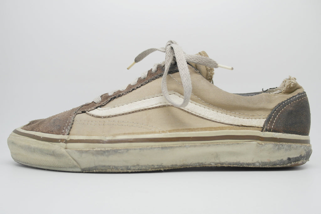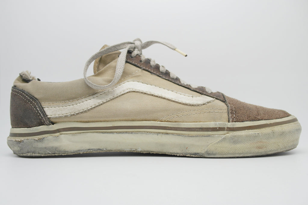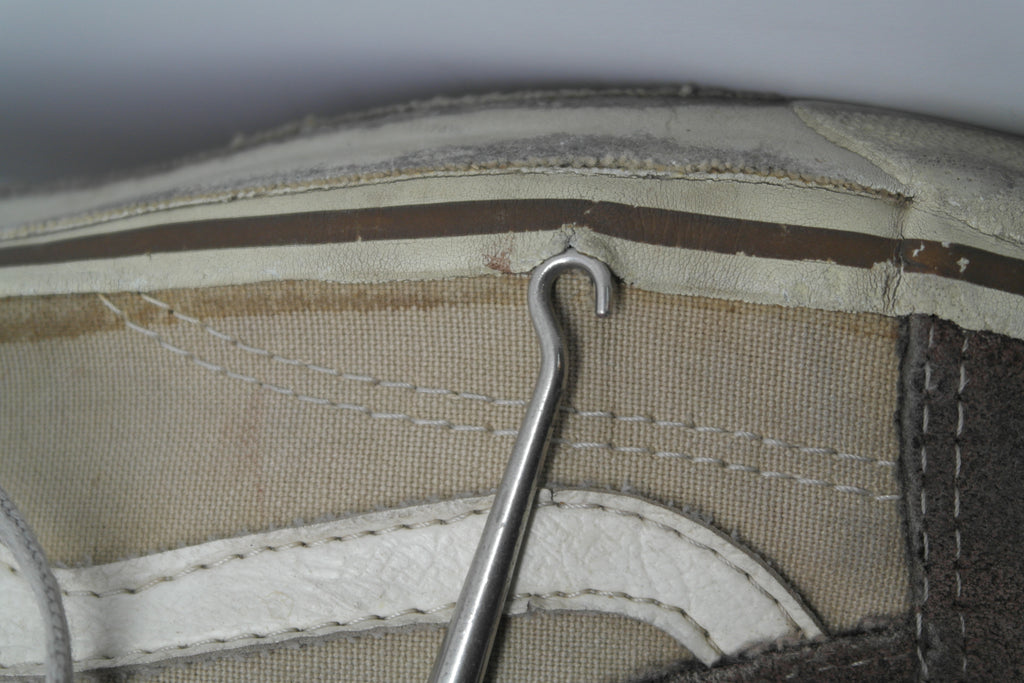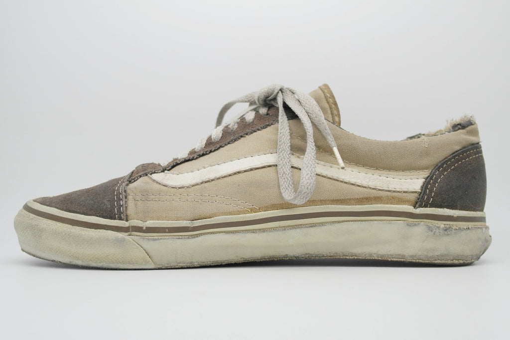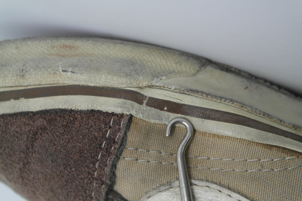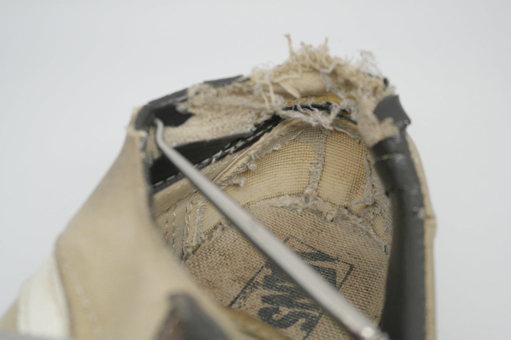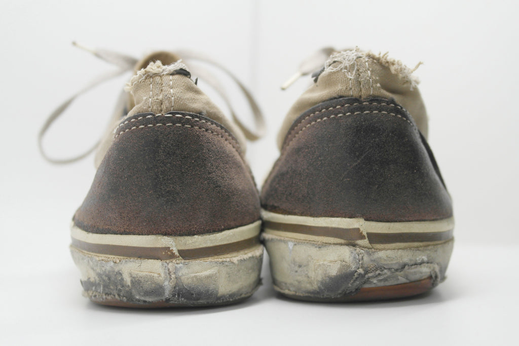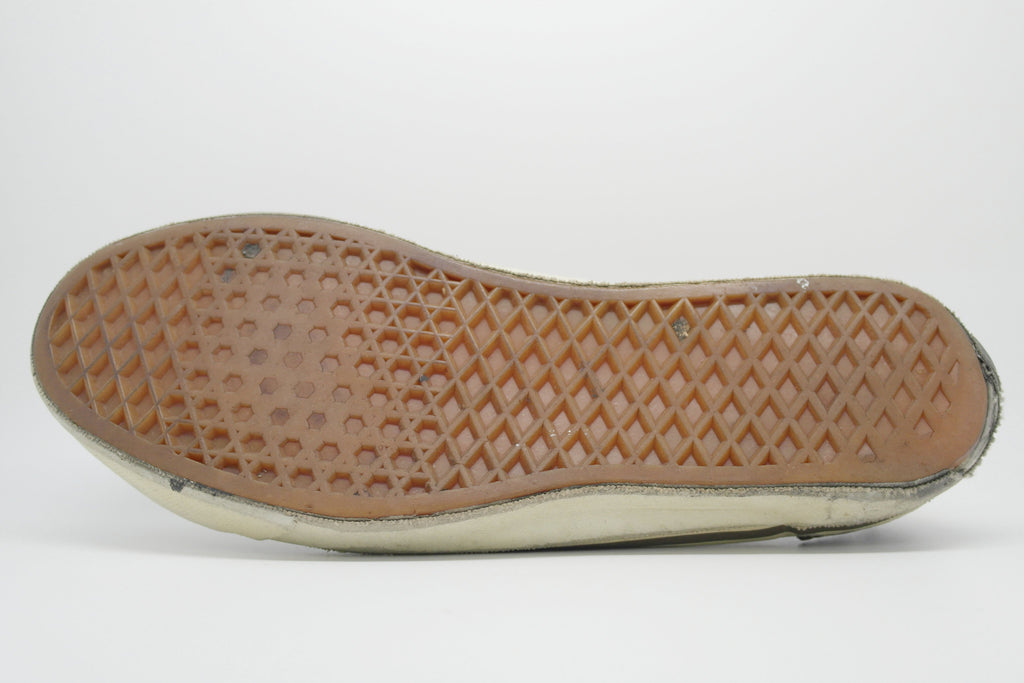 good used condition. the rubber remains soft & flexible despite showing widespread micro-cracking & dryness. separation from uppers is minimal. the vinyl collar on both shoes is smashed. the foam is gone from the lateral half of the right shoe & is otherwise exposed & threadbare. saying this, only the lining of the internal heel counter is worn away & the interior plastic remains intact. there is wear to the backing of the suede at the toe through to the suede, almost perforating a hole at the left big toe