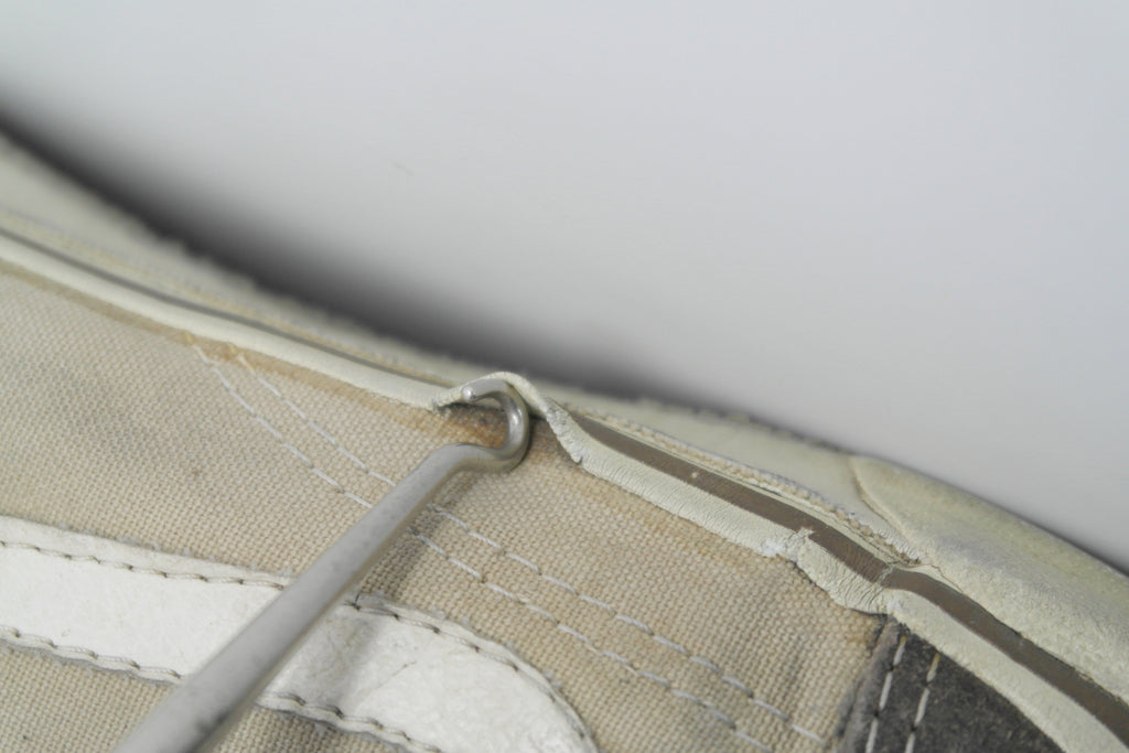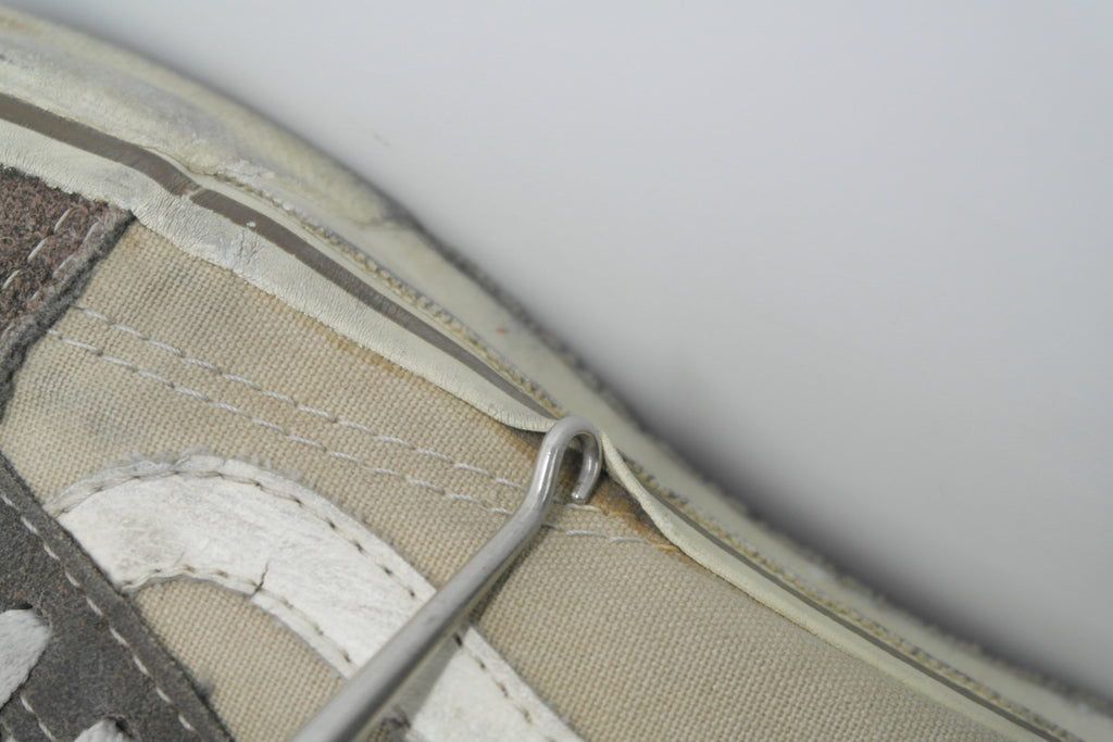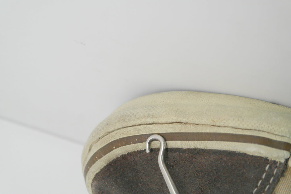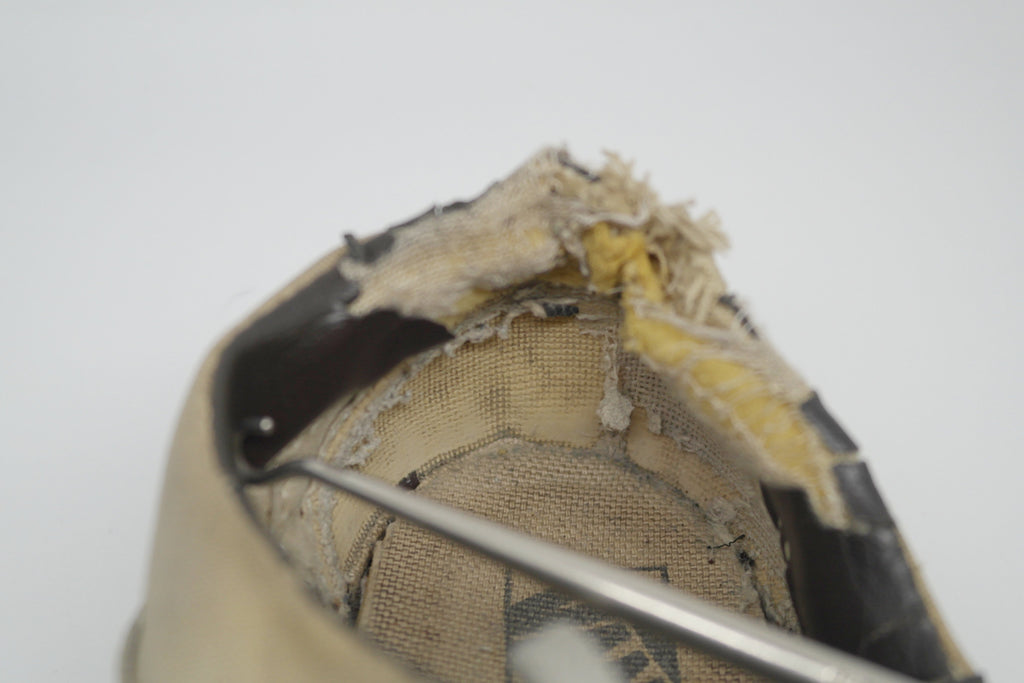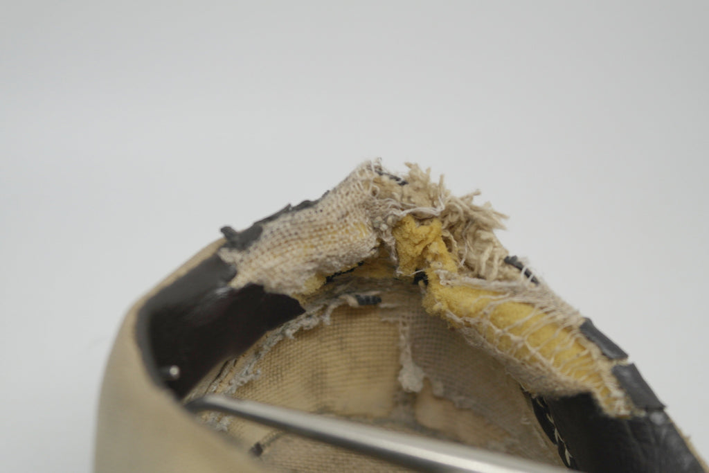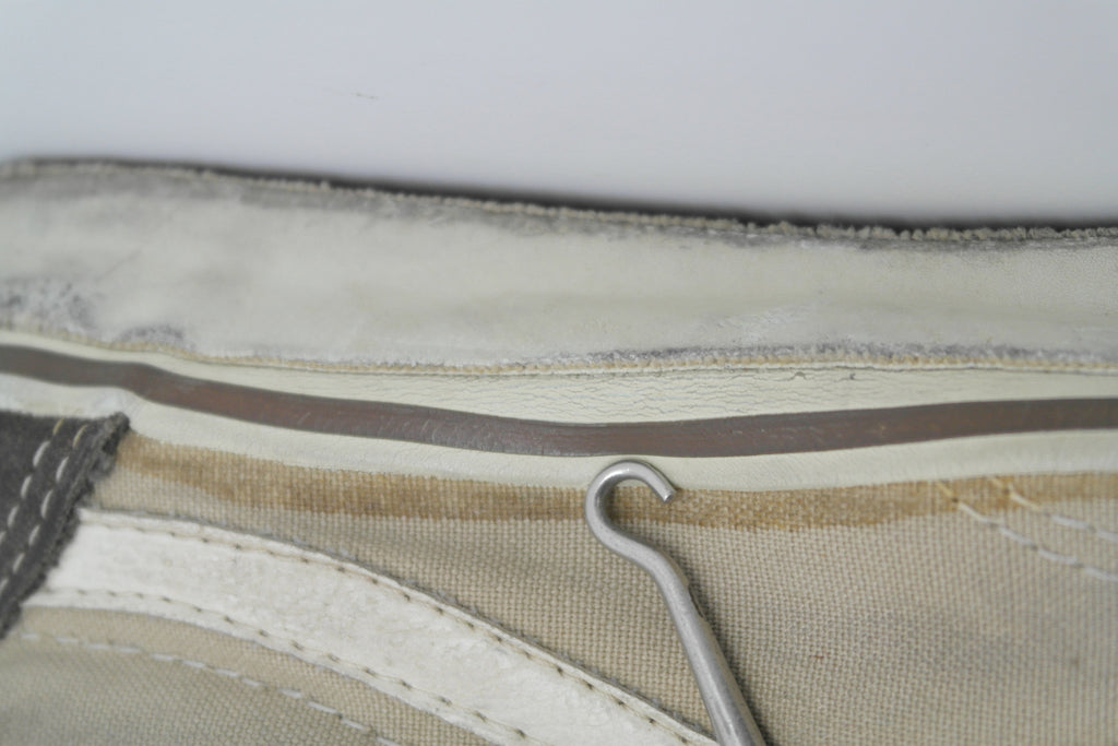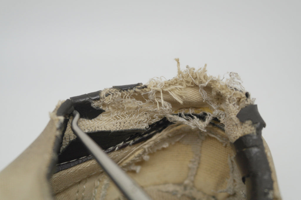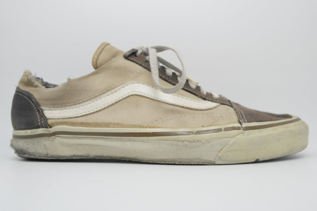 good used condition. the rubber remains soft & flexible despite showing widespread micro-cracking & dryness. separation from uppers is minimal. the vinyl collar on both shoes is smashed. the foam is gone from the lateral half of the right shoe & is otherwise exposed & threadbare. saying this, only the lining of the internal heel counter is worn away & the interior plastic remains intact. there is wear to the backing of the suede at the toe through to the suede, almost perforating a hole at the left big toe