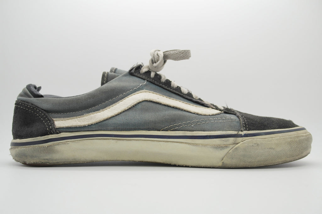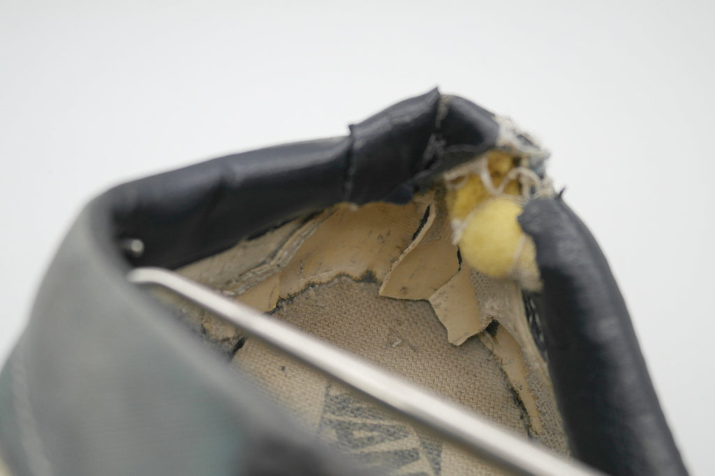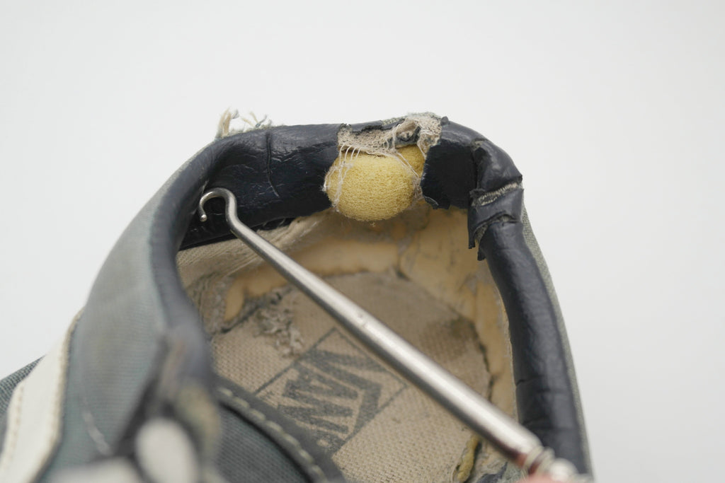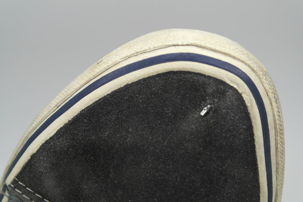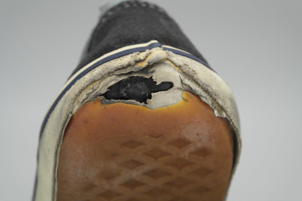 decent used condition. show significant wear. rubber is soft & flexi however widespread micro-cracking, separation with uppers, wear to outsole & holes at heel. internal heel is pulped with internal counter breakdown & vinyl collar blowouts. small hole at left big & pinky toes