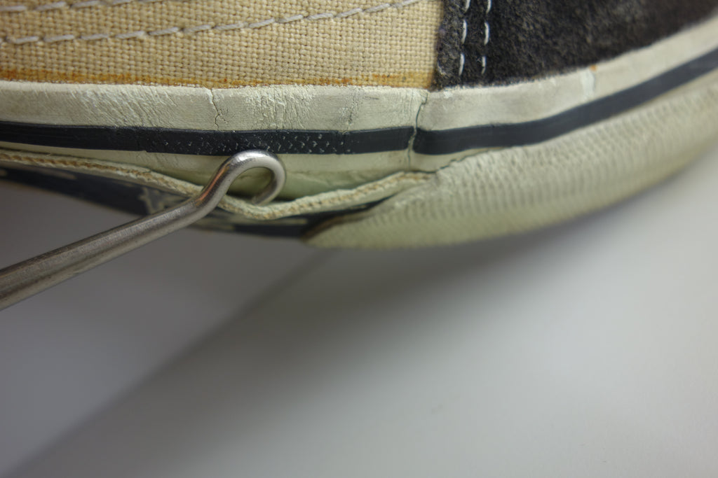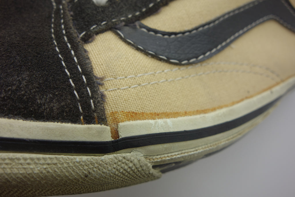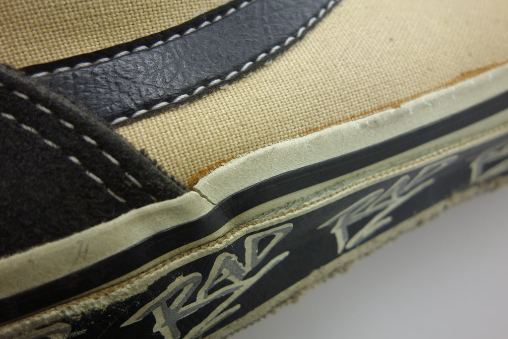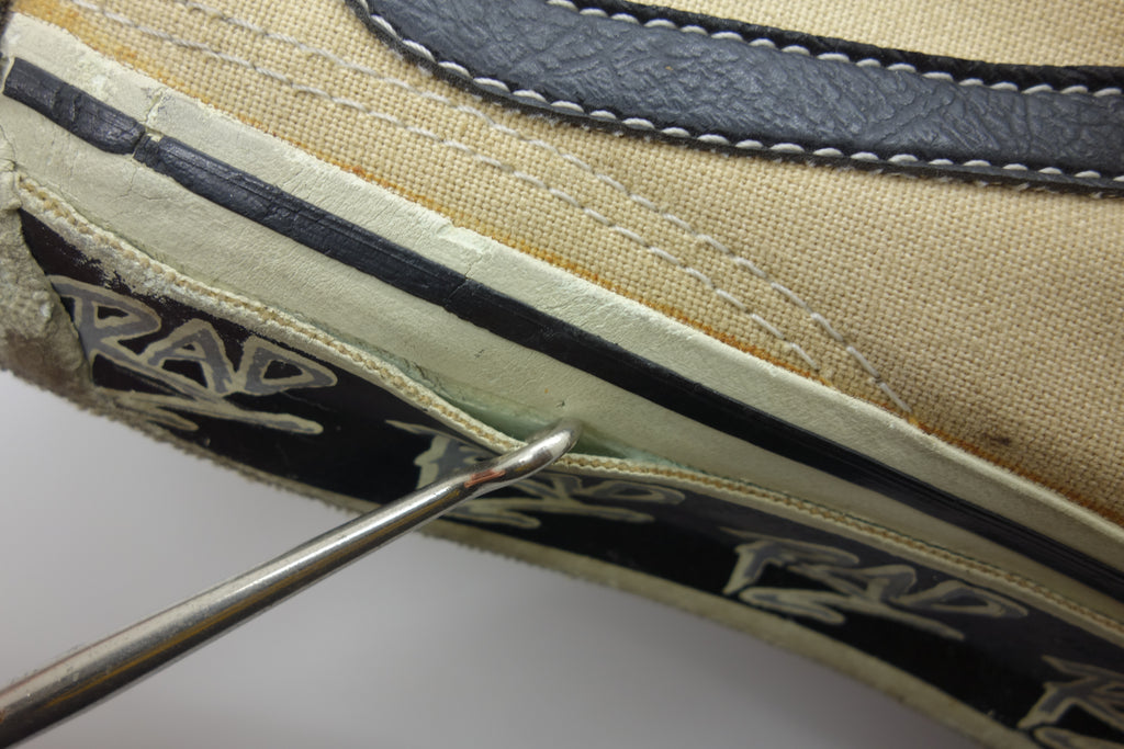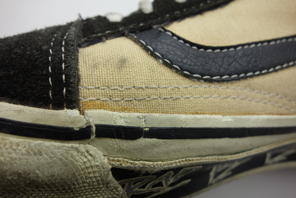 good used condition..... however the first foxing (stripe area) has completey cured/solidified & will crack/crumble & flake away upon bends. half way down the friction sidewall is also affected & is l;ikely to also crack. hairline cracks are already visible & chipping will continue. the vinyl collar shows splitting at the base of the foam however is not exposed. wear at own risk!