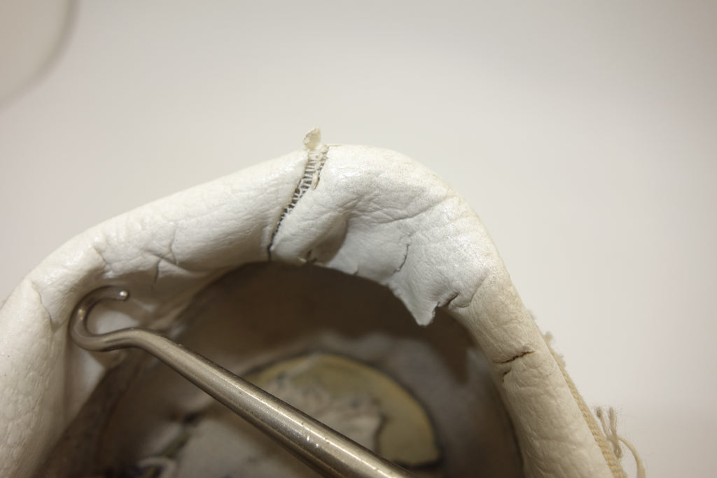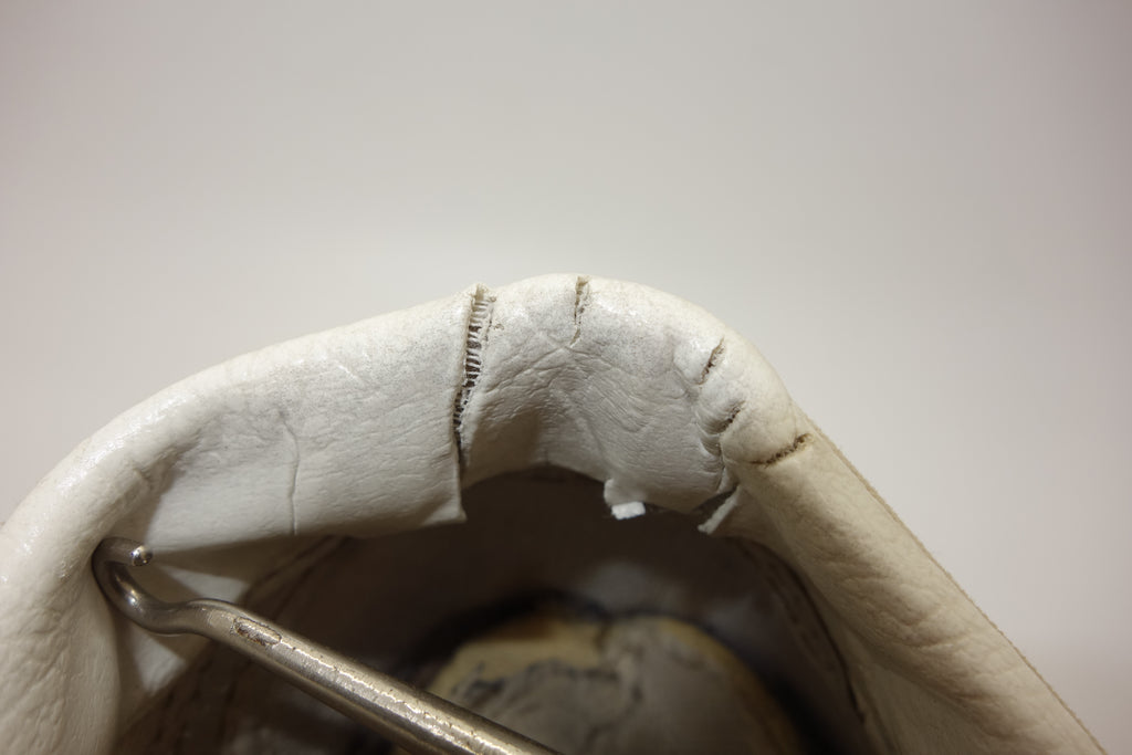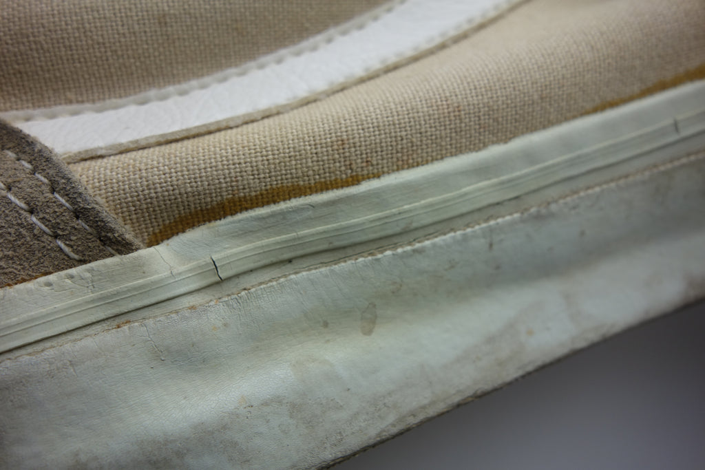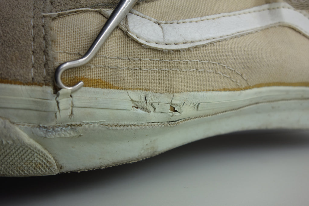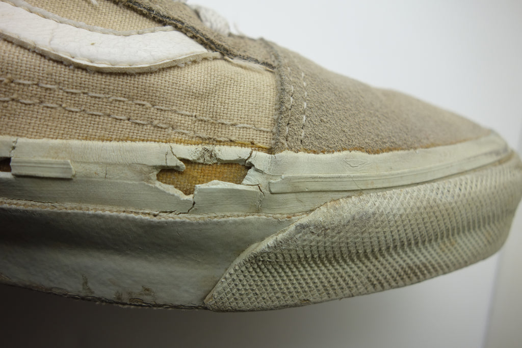 good used condition. sadly the foxing stripe has cured/solidified & will continue to crack, flake away & erode into the first foxing below. the toes have almost exclusively brittle however the bumper, friction & waffle itself are unaffected. rubber loss will continue at the bends & however unsightly they will thereafter hold up to normal wear. the vinyl collar shows splitting mostly to the base however foam is not exposed. both insoles at the heel show peeling & erosion following removal of arch supports & may require thin insole repalcements. wear at own risk!