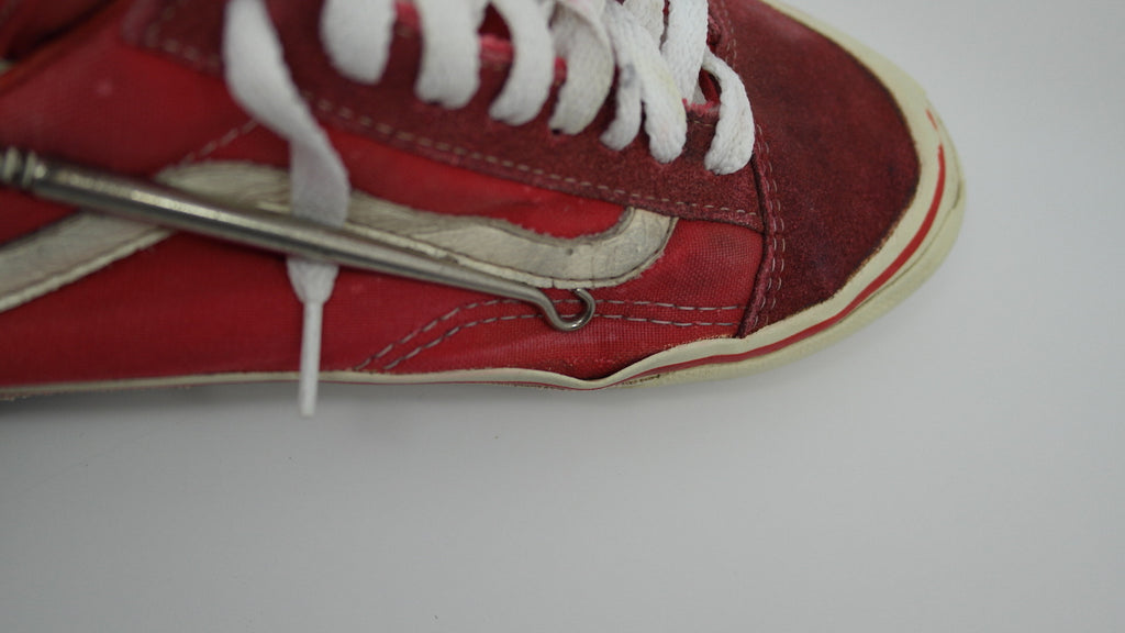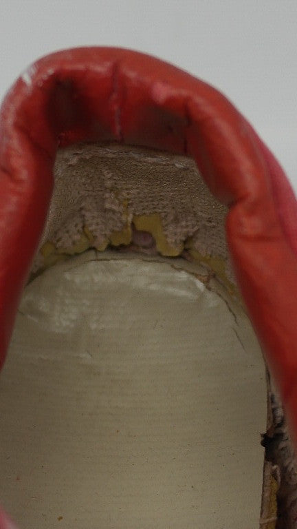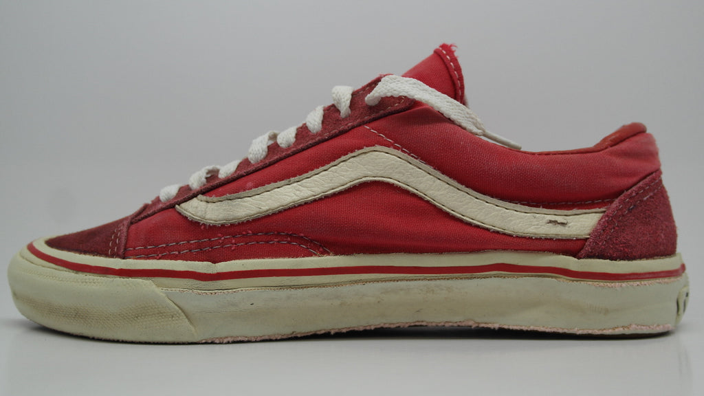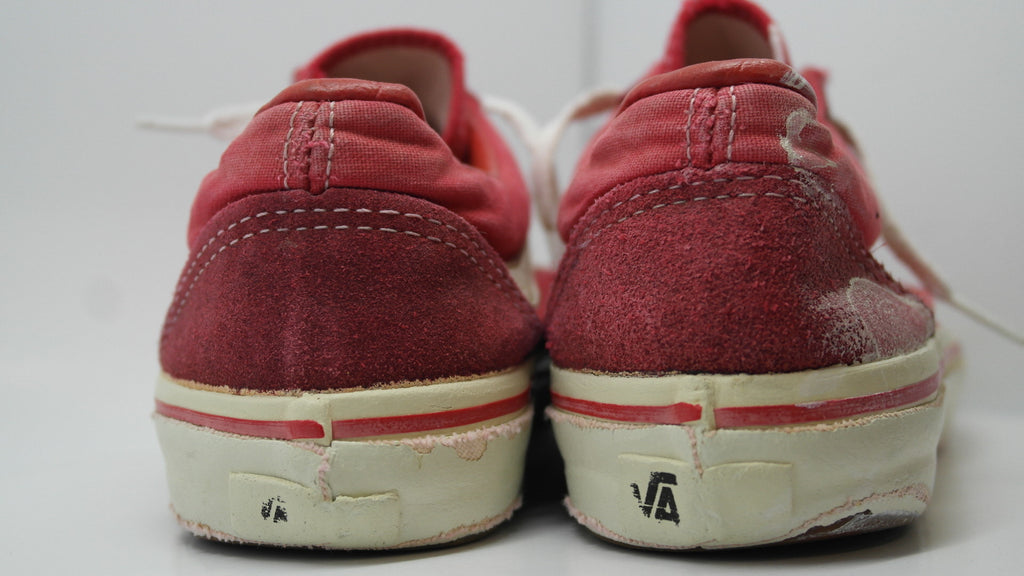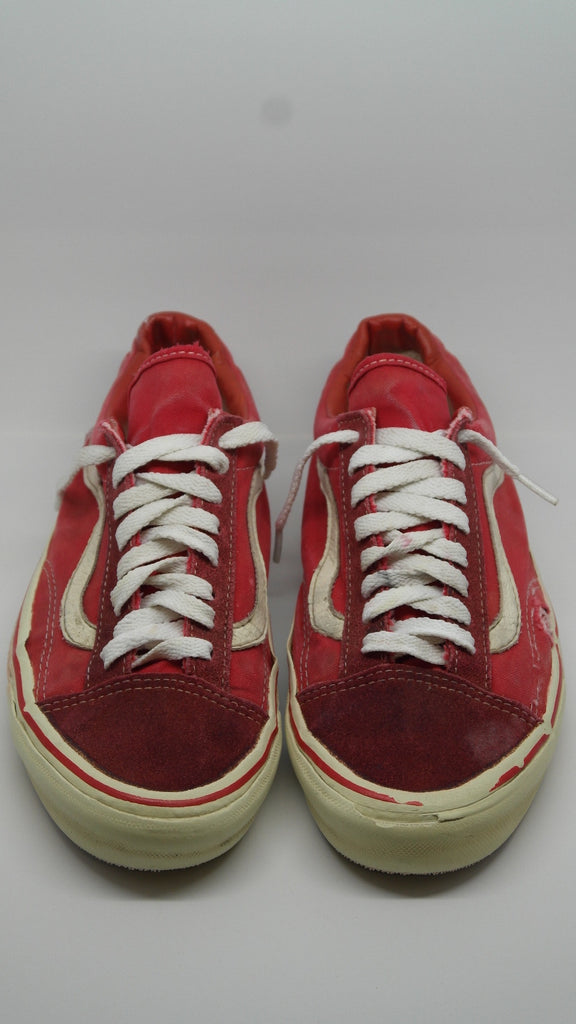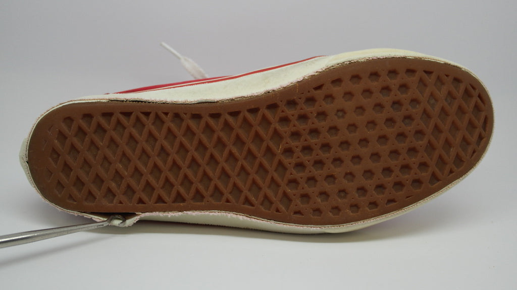 skated & machine washed. still plenty life left. the rubber remains soft & flexible with minor separation between uppers & rubber at toe crease. 1 regular stance ollie hole & paint blemish at right lateral heel. the foam footbed has crsuted at the high arch to the heel. size is no longer visible however pretty confident these are US7, if not US6.5. wear at own risk