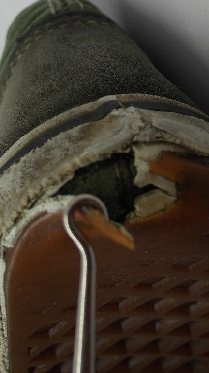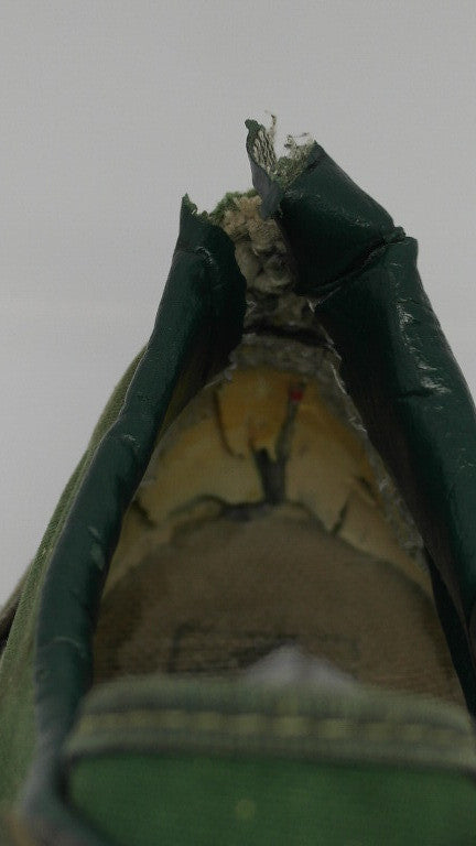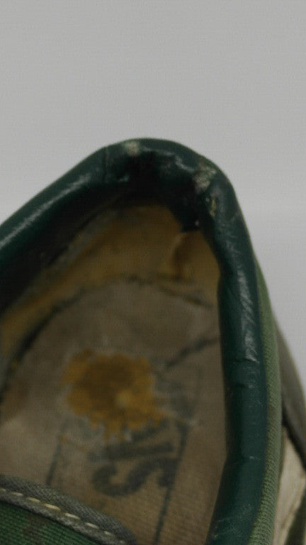 rubber shows very minor but widespread hardening & dryness, mainly to the foxing stripe. several small areas of separation between ruber & uppers. vinyl collar shows splits on both shoes however the right collar has lost its foam & shows significant breakdown to the internal heel. some footbed & inner lining wear. soles show wear with 1 hole at left heel. still wear left. size is not visible & is either US7.5 or US8. please check measurements.