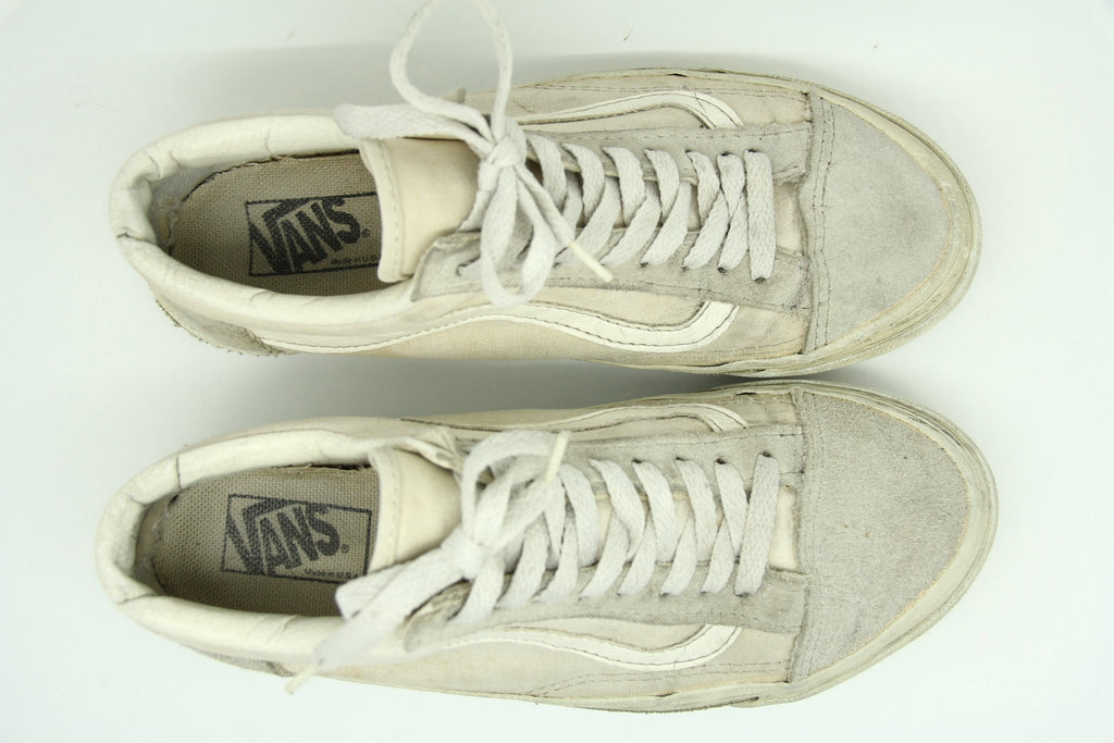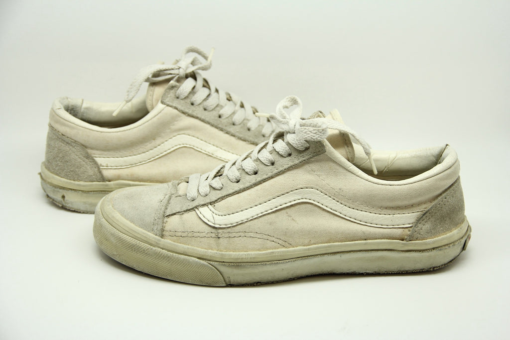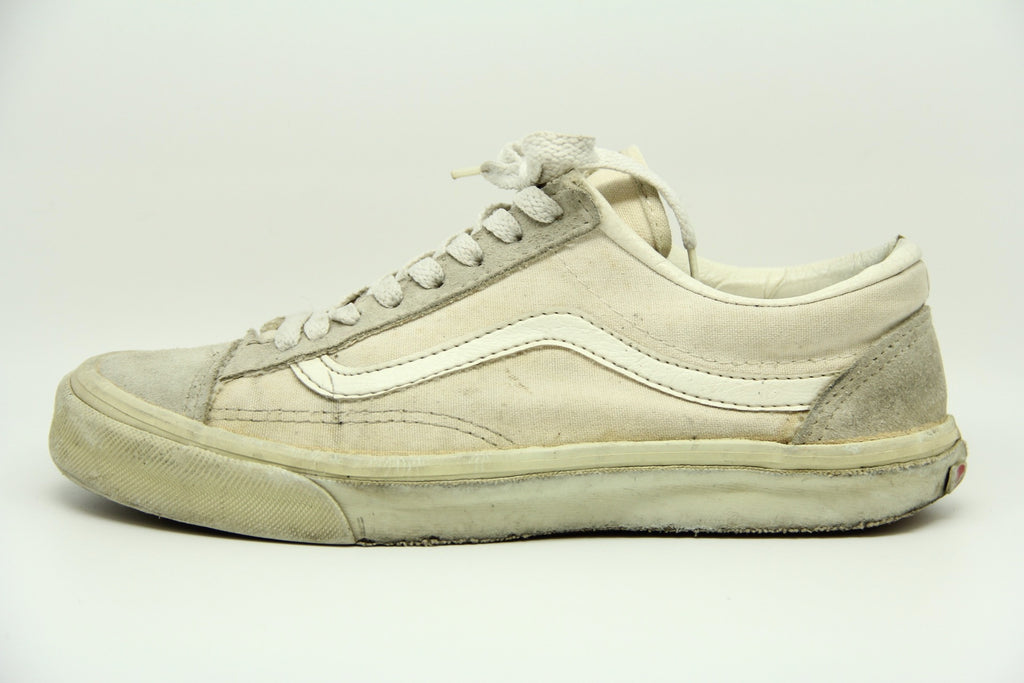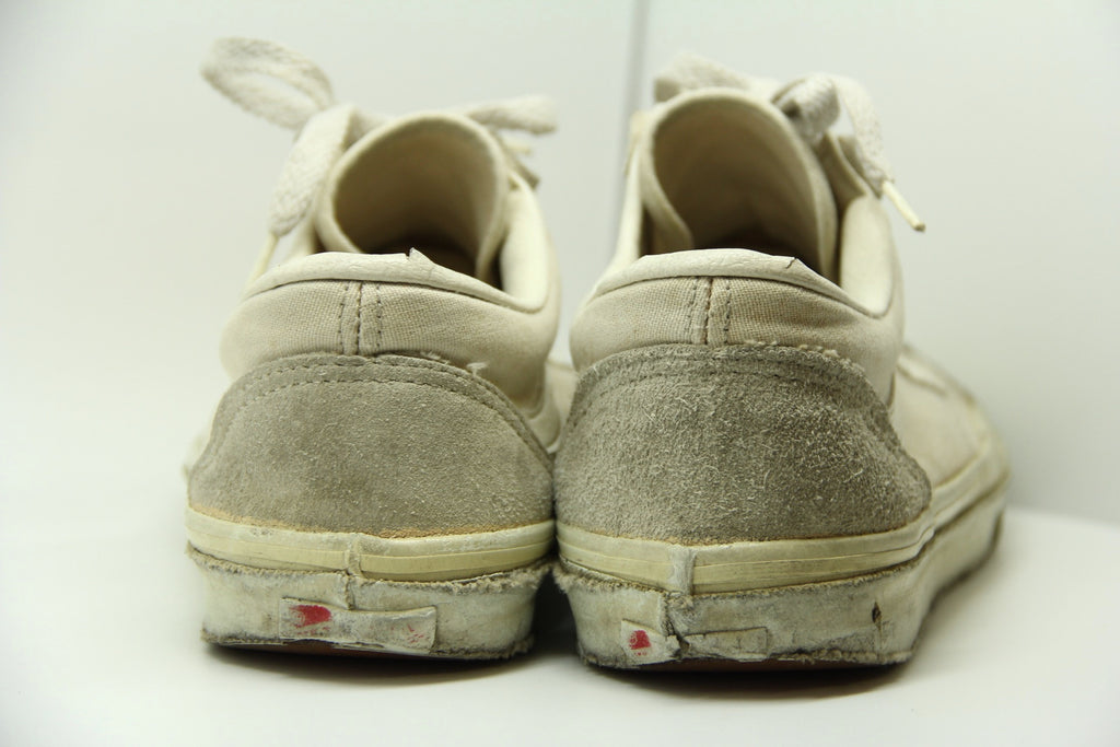 good used condition. the rubber shows widespread dryness especially on the left shoe with minor flaking however the rubber is soft & flexi & will hold up to normal wear. minor separation between rubber & uppers at toe creases, minor splitting to the inner vinyl collar & wear to the internal heel counter. still plenty life left!