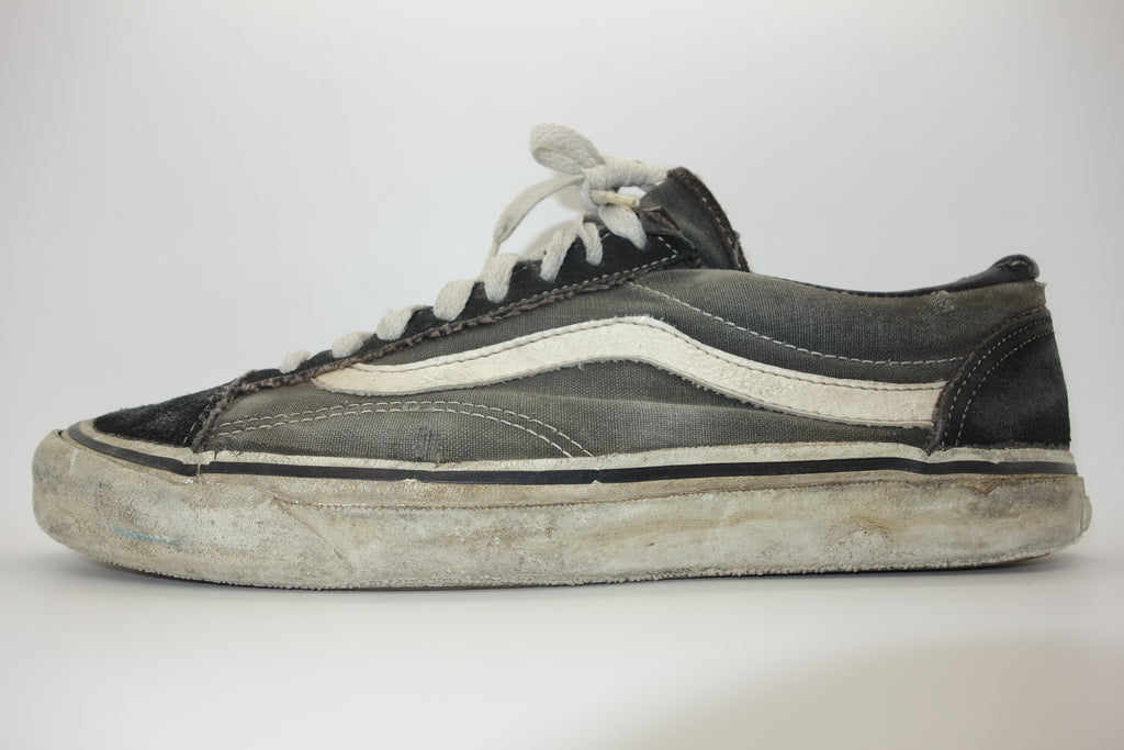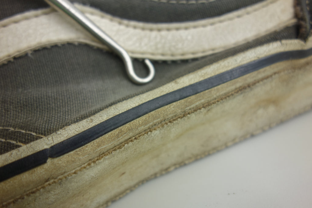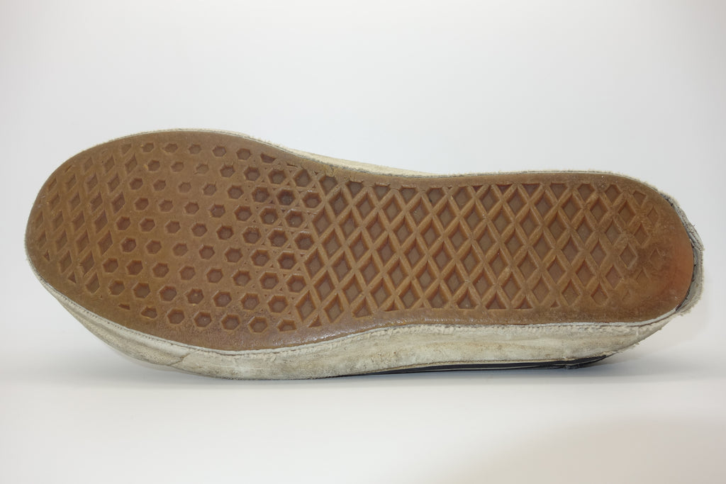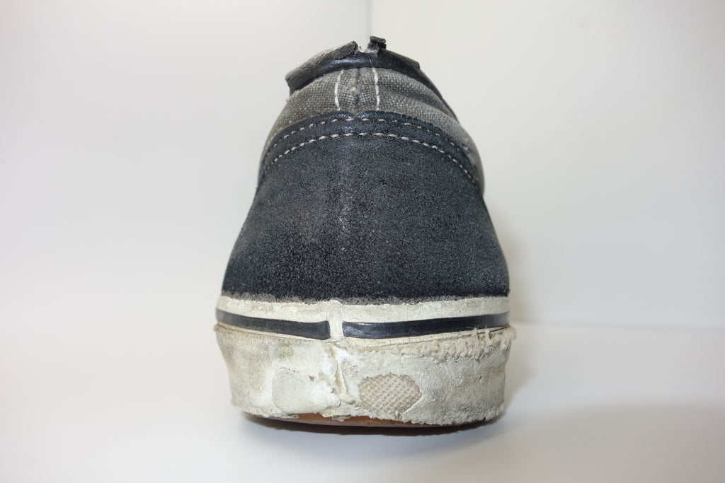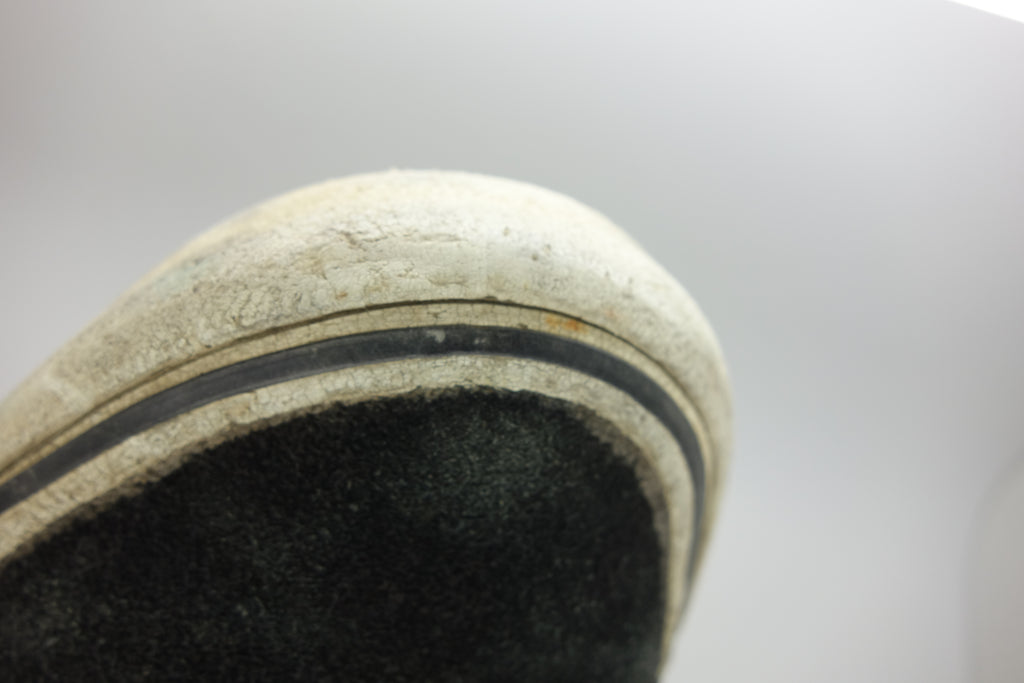 decent used condition. all rubber remains soft & flexible except the waffle which has hardened & become slick. from experience only the top layer of waffle is hard & with wear will soften, but initially will be slippery. otherwise the midsole remains soft despite dryness/curstyness & widespread micro stress cracking. several small areas of separation between ruber & uppers. vinyl collar shows splits on both shoes & exposure to foam webbing. some footbed & inner lining wear.