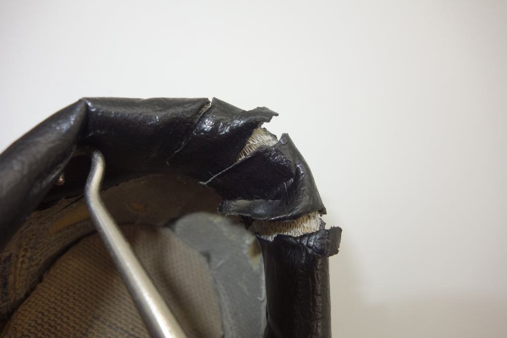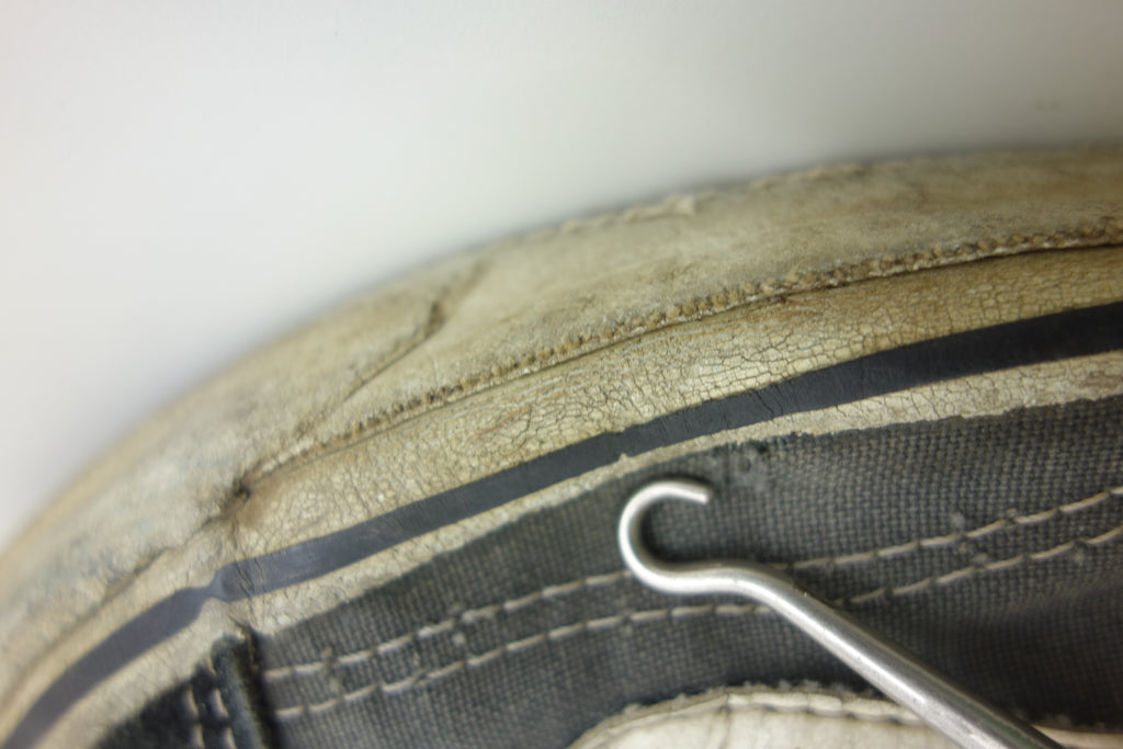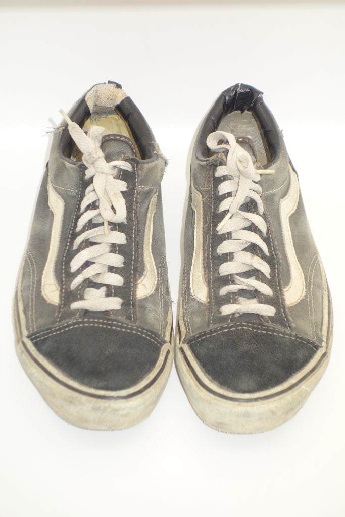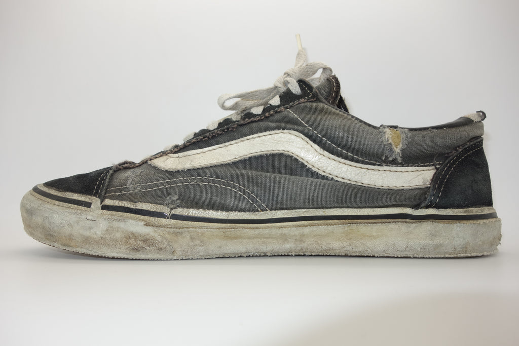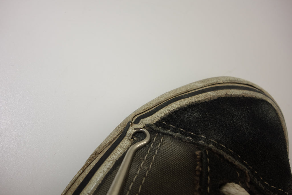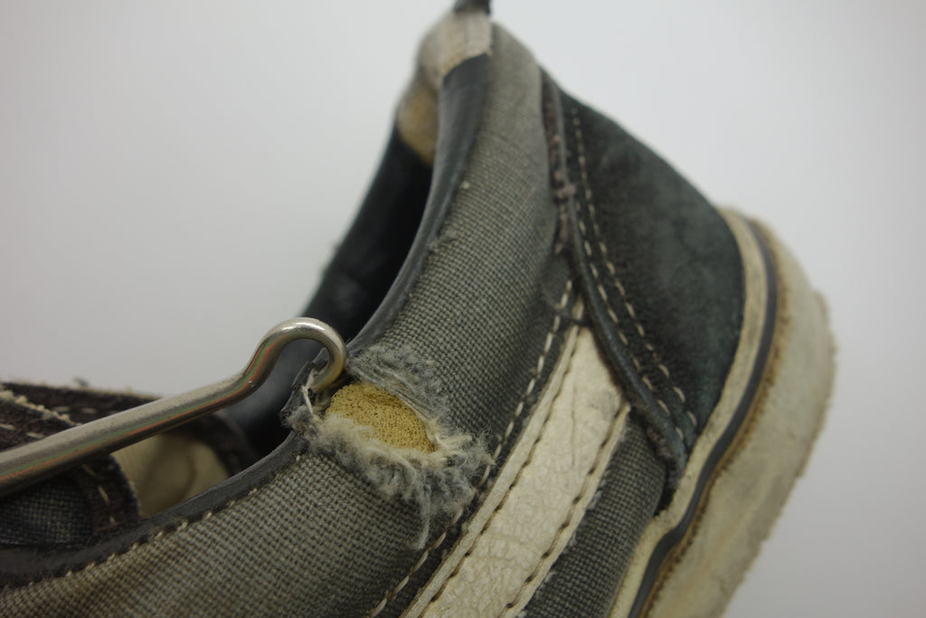 decent used condition. all rubber remains soft & flexible except the waffle which has hardened & become slick. from experience only the top layer of waffle is hard & with wear will soften, but initially will be slippery. otherwise the midsole remains soft despite dryness/curstyness & widespread micro stress cracking. several small areas of separation between ruber & uppers. vinyl collar shows splits on both shoes & exposure to foam webbing. some footbed & inner lining wear.
