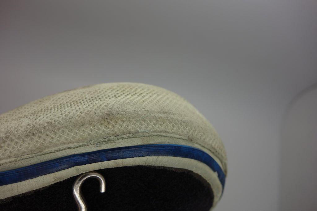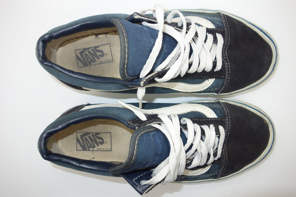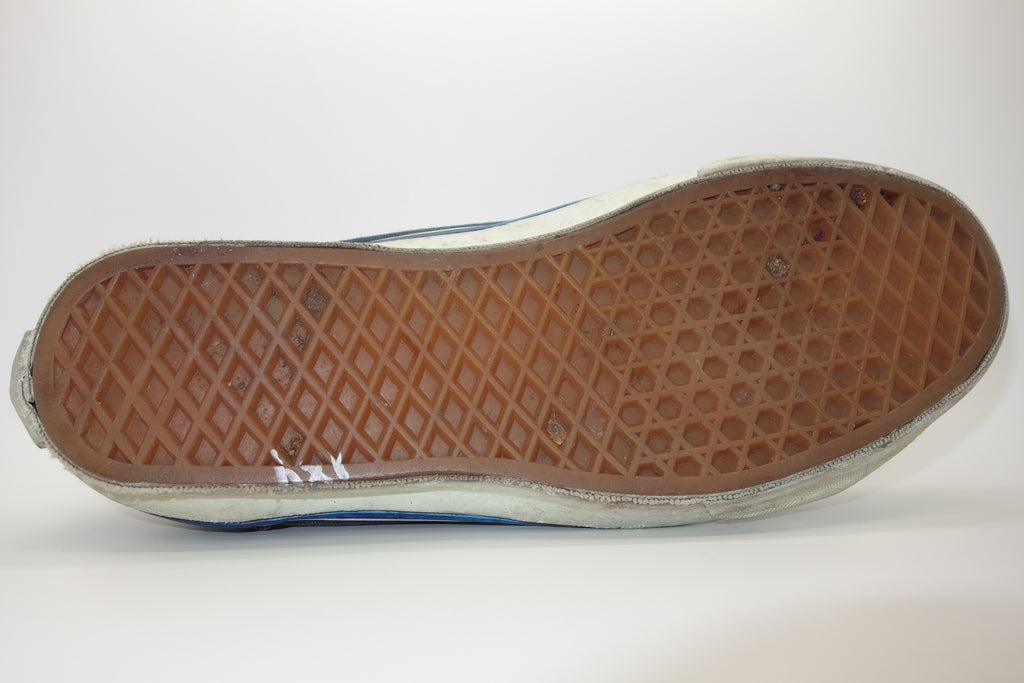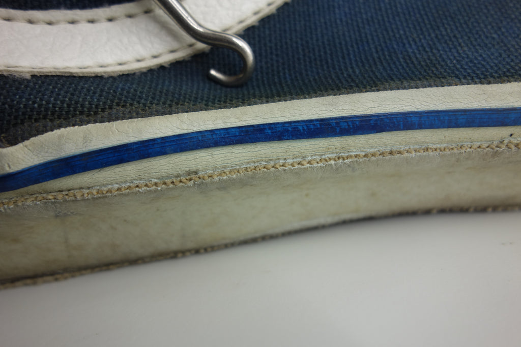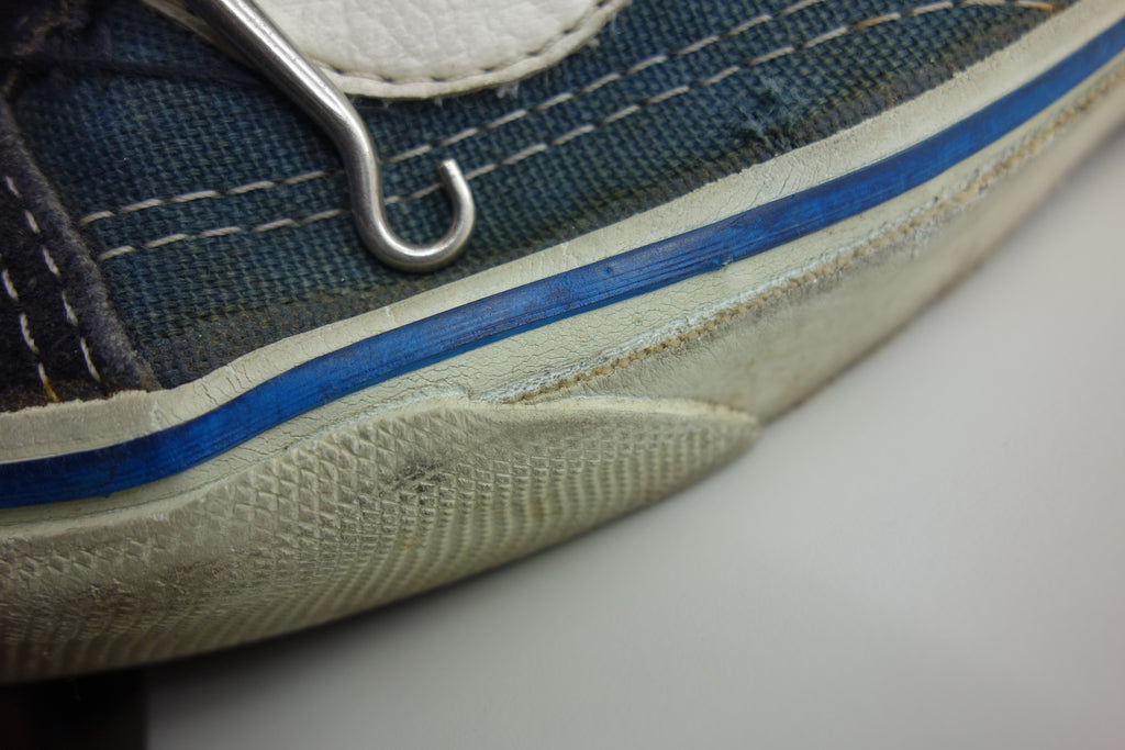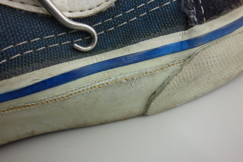 excellent used condition.... however the rubber first foxing (stripe area) has cured/solidified & will crack & chip away. the bumper, friction & waffle are unaffected however from experience these will crack immediately upon bends & leave a trail of rubber. they will look unsightly but then hold up to normal wear. the foam fiber-fill in the padded toungue has perished resulting in a lumpy filling, which may leave dry residue inside shoes & on socks. wear at own risk!