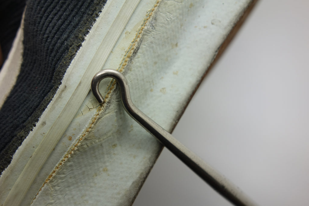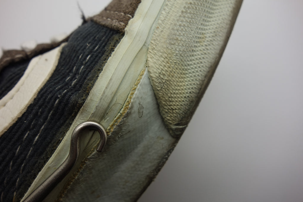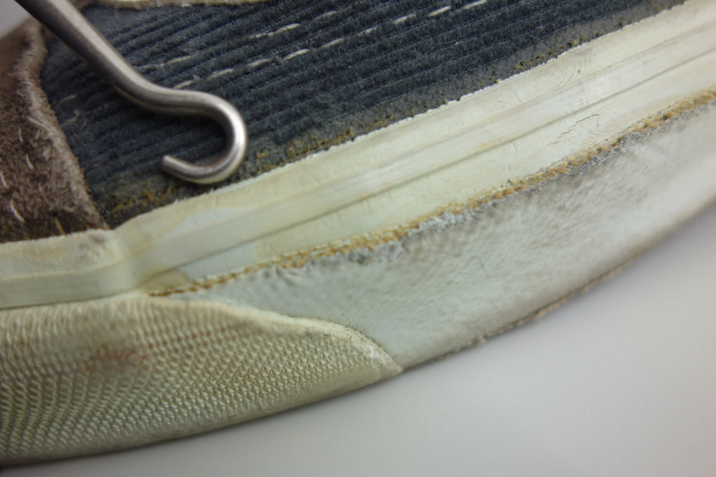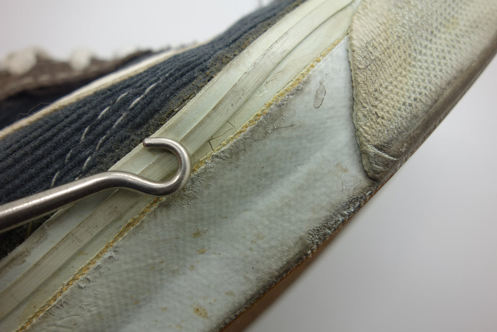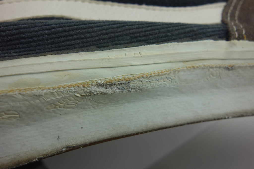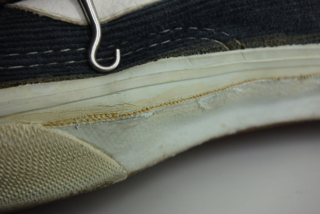 good used condition. the majority of rubber remains soft however there exists hardening in patches across the first foxing & friction. see photos for blotchy discolouration whereby the white areas remain soft while the creamy areas have cured. the creamy pacthes already show hairline cracking & will continue. i forsee these will succumb to slow crumble rather than immediate cracking. padded tongue may be prone to foam breakdown over time however remains now intact but flattened.... & may leave a black residue in shoes & on socks. wear at own risk!