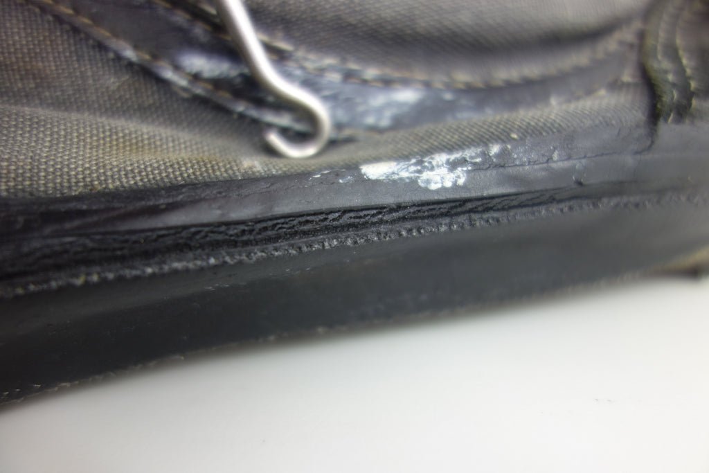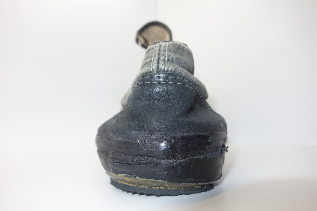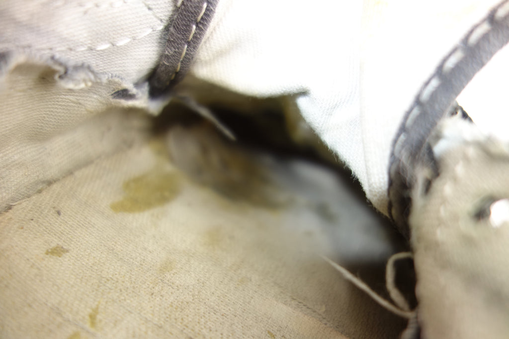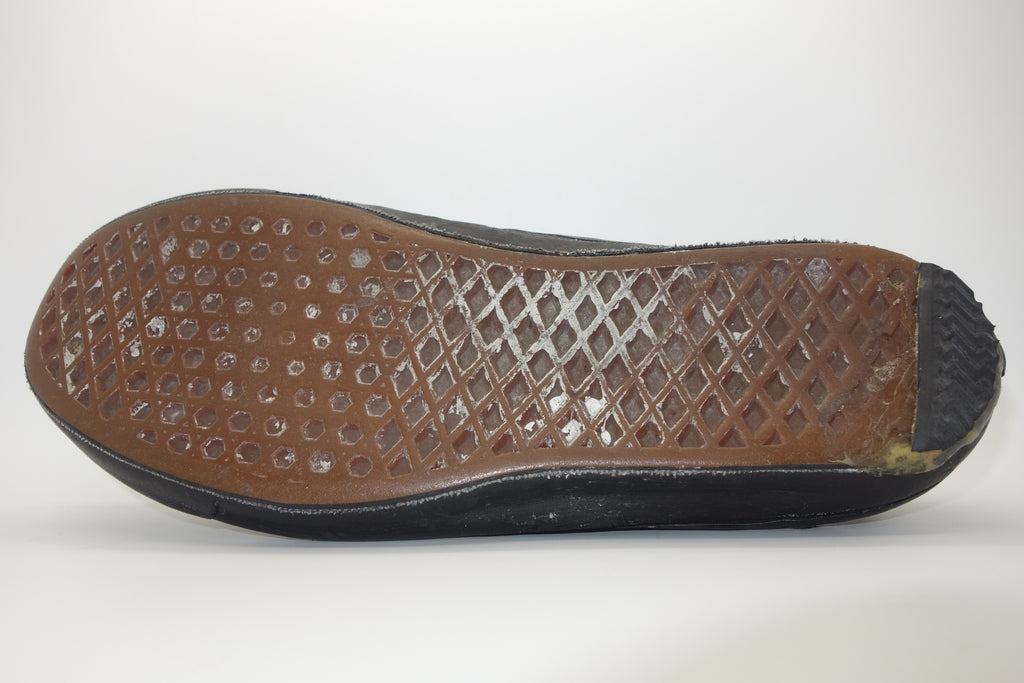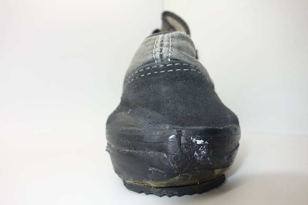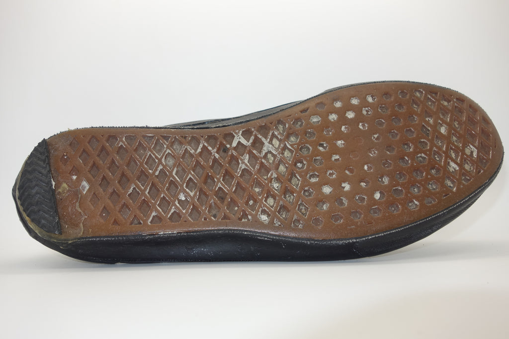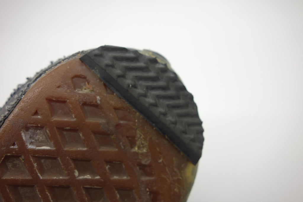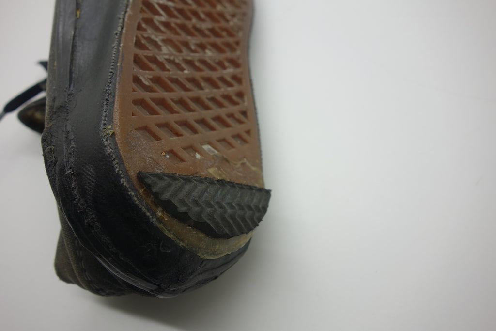 good used condition. all rubber remains soft despite rubber (wet rot? shoo-goo?) softening. the suede(?) ollie pad has been grafted diy! at first it looked like the bounce stitch excess canvas internally had been poked through the rubber somehow to create the pacth. upon closer inspection its possible a donor outsole or foxing stripe was sole-swapped. if it was swapped it was an of usa made source. the internal heel counter shows significiant breakdown & was also repaired cosmetically. the insole shows some erosion to ball of left foot & some on the right. also note the external heel guard on the waffle. these should hold up to normal wear.... however because of these alterations i advise to wear at own risk! size not visible but bought as US9.5 & confirdent of this, if not bigger. laces not original