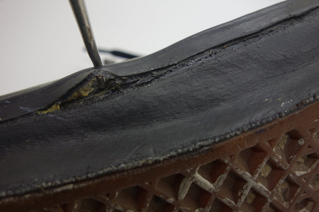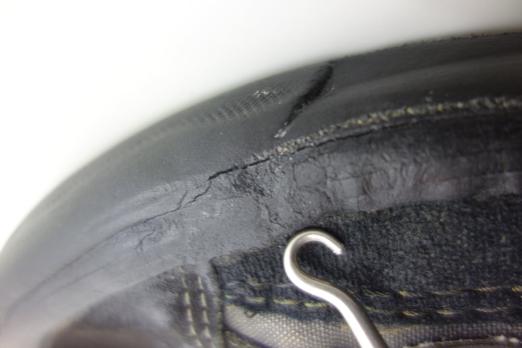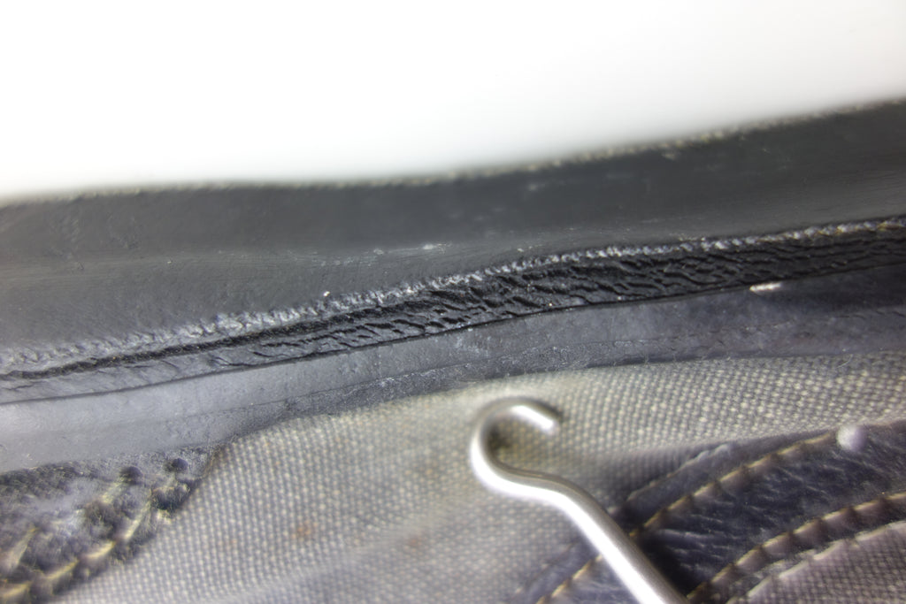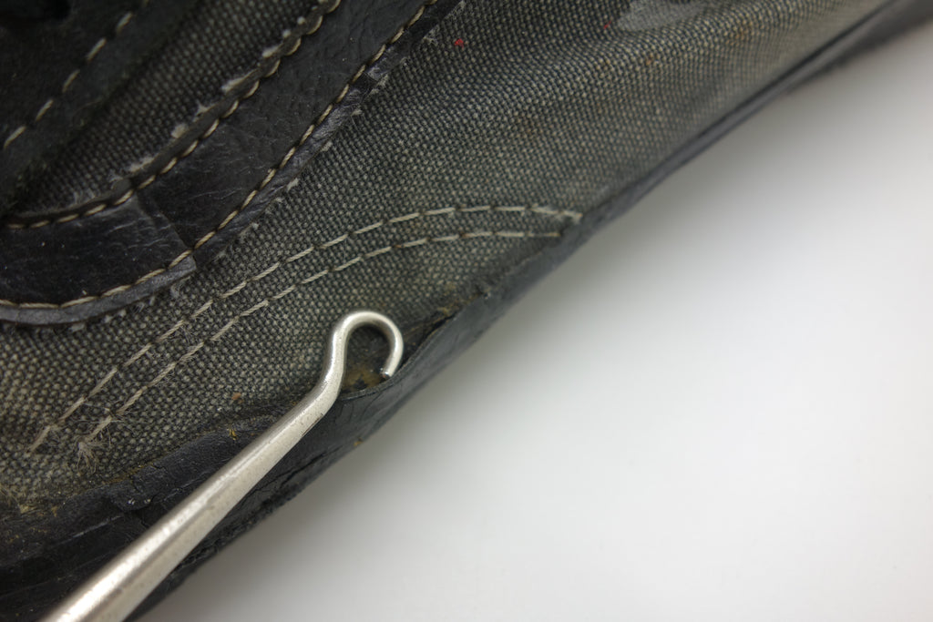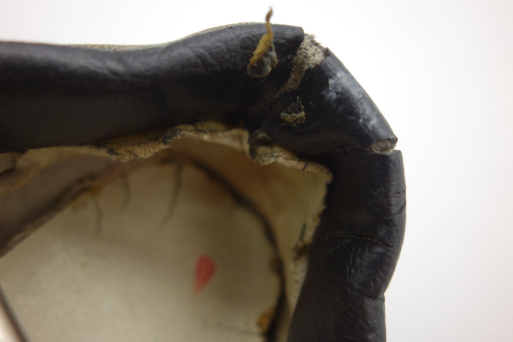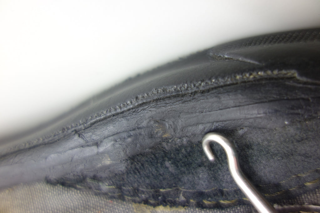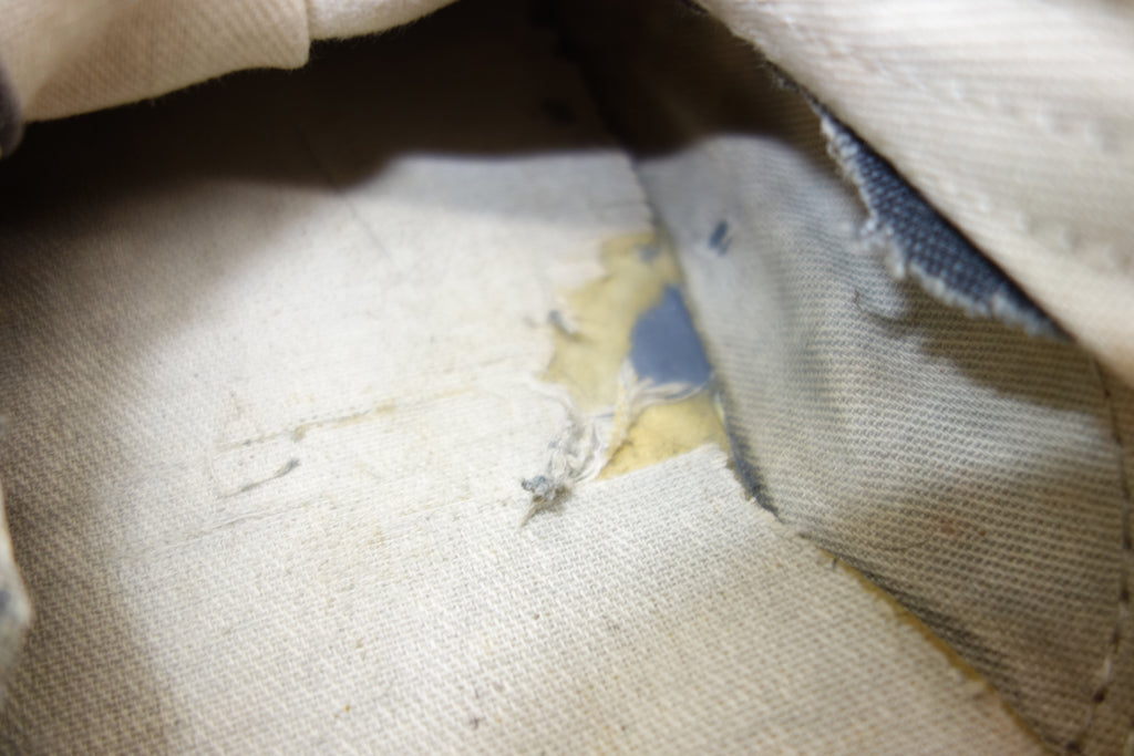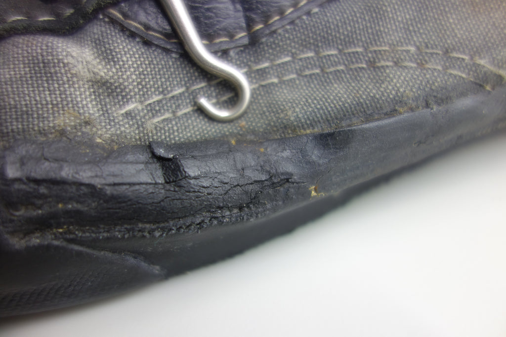 good used condition. all rubber remains soft despite rubber (wet rot? shoo-goo?) softening. the suede(?) ollie pad has been grafted diy! at first it looked like the bounce stitch excess canvas internally had been poked through the rubber somehow to create the pacth. upon closer inspection its possible a donor outsole or foxing stripe was sole-swapped. if it was swapped it was an of usa made source. the internal heel counter shows significiant breakdown & was also repaired cosmetically. the insole shows some erosion to ball of left foot & some on the right. also note the external heel guard on the waffle. these should hold up to normal wear.... however because of these alterations i advise to wear at own risk! size not visible but bought as US9.5 & confirdent of this, if not bigger. laces not original