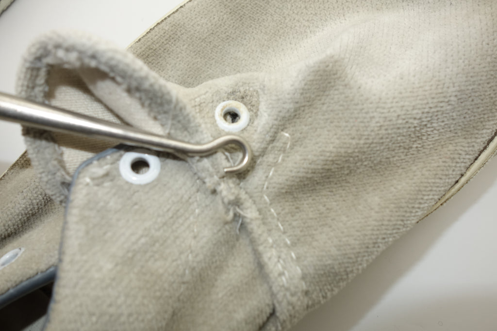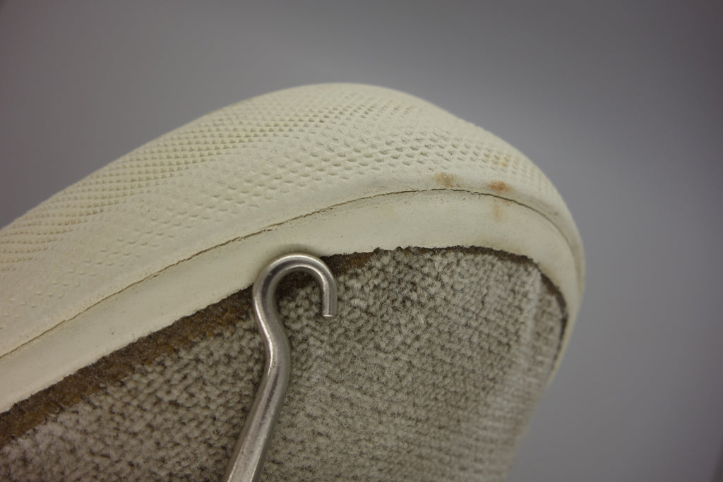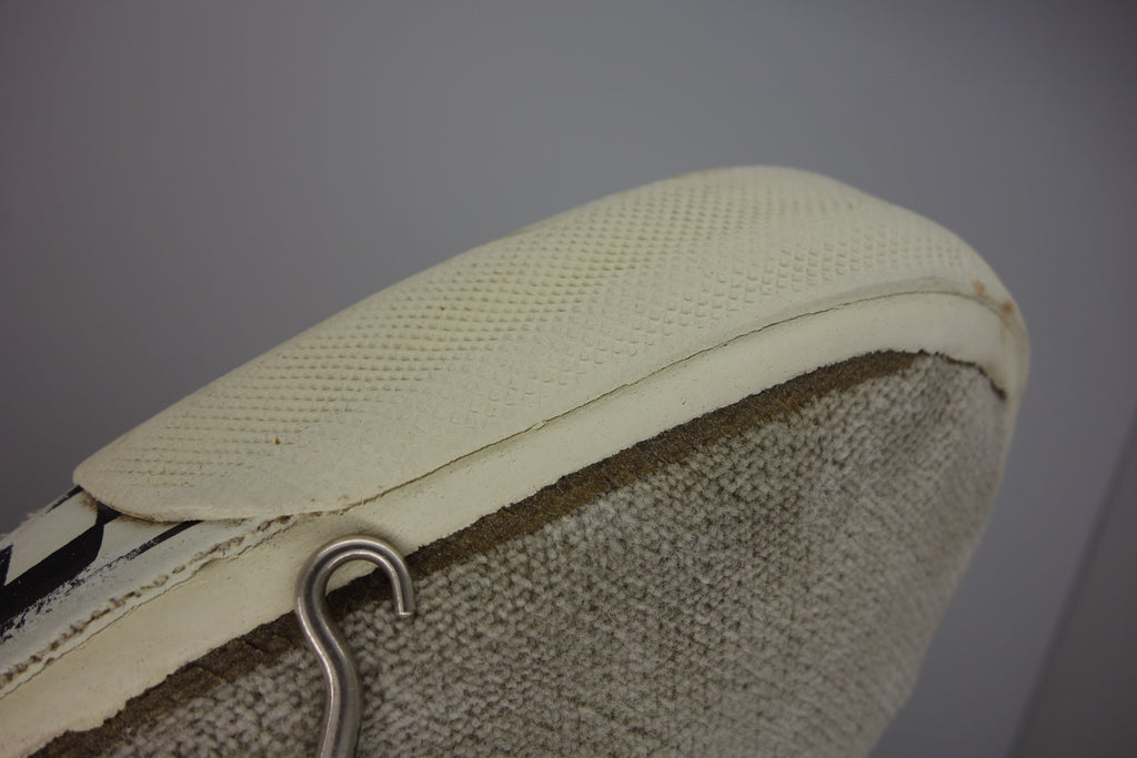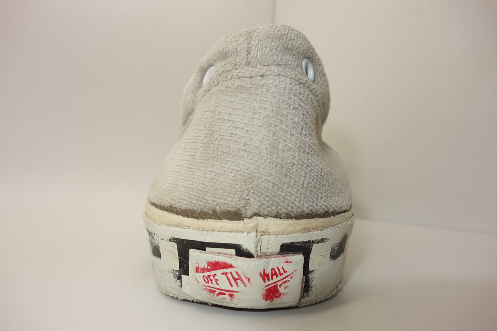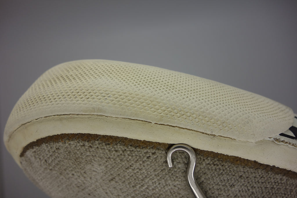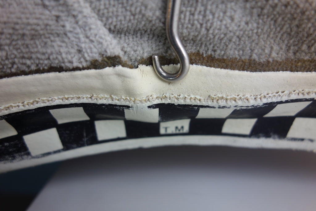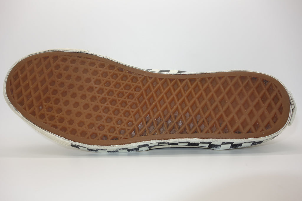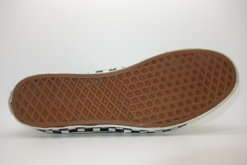 very good used condition. all rubber remains soft & flexible with negligible separation from uppers & only very minor stress cracking. the heel is somewhat misshapen however the internal heel counter remains flexible & intact. the elastic gusset shows some wear & exposed rubber fibres however retains elasticity. US9.5 is clearly visible in both shoes. possible machine wash results in partial loss of check design on friction. laces absent.