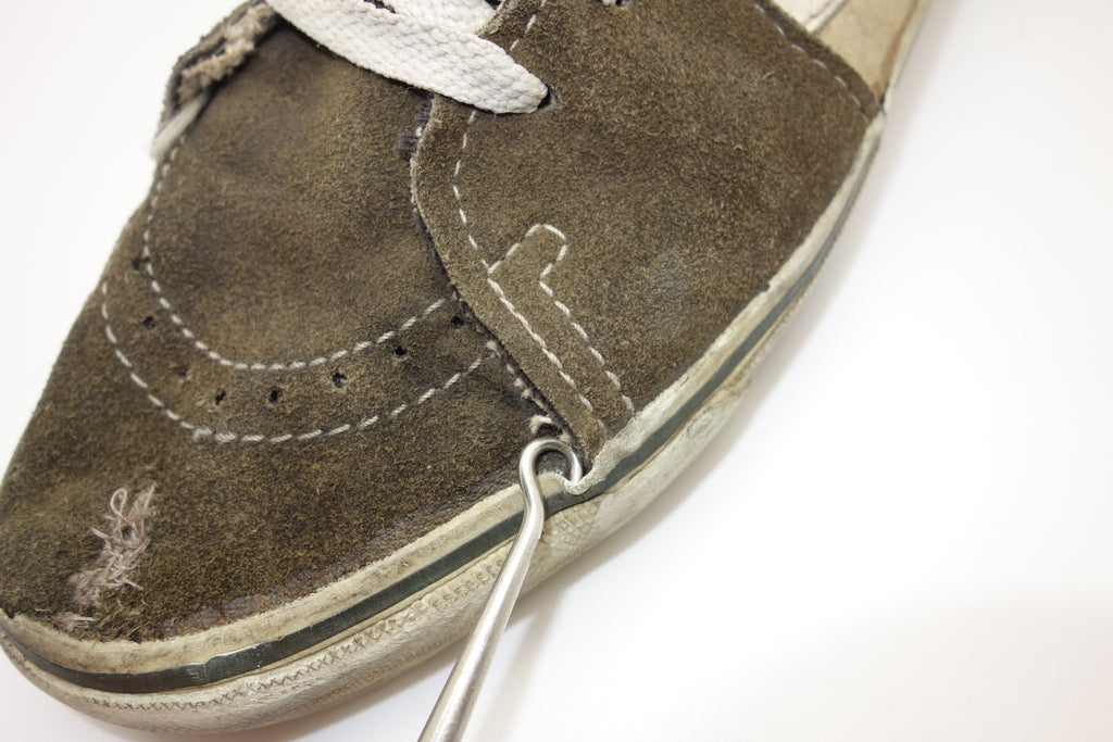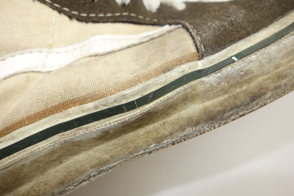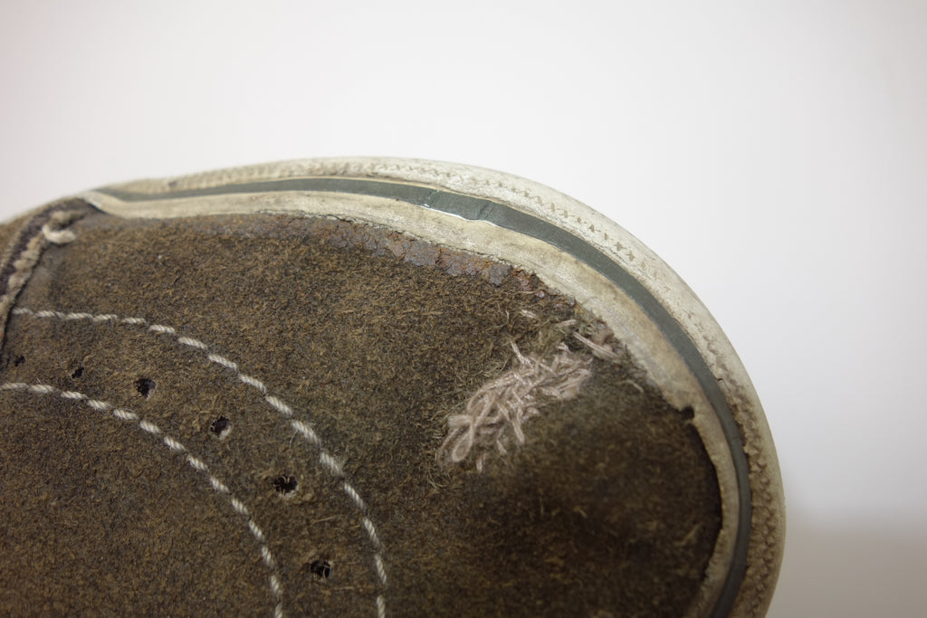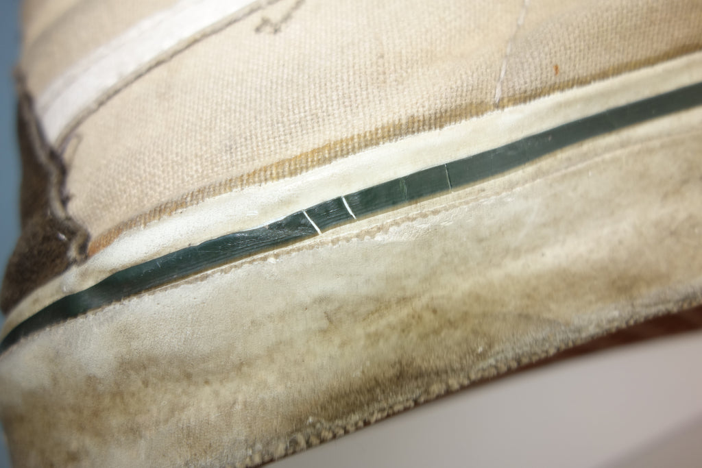 good used condition. the majority of white rubber remains soft & flexible however the green foxing stripe has hardened & already shows cracking. this will continue & will flake away however will only cause shallow erosion into the soft white rubber underneath. the right toe however does show hardening throughout which will crack. from experience these will hold up to normal wear with minimal rubber loss. the hole on left toe has been repaired to good standard. otherwise very minor separation between rubber & uppers at eyestay & heelstay seams. inner muslin backing has worn through at both big toes to the suede. im confident that US10.5 is still visible & if not fit towards US11. wear at own risk!