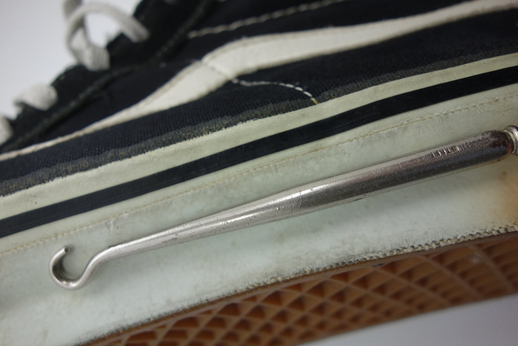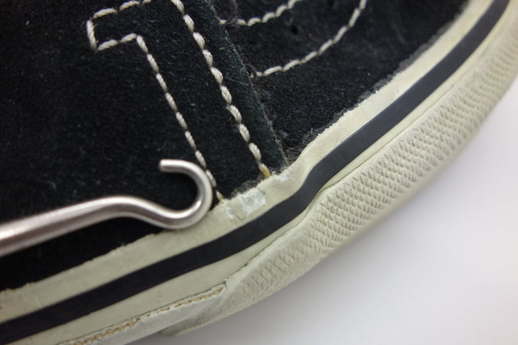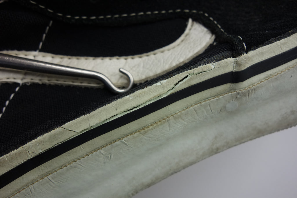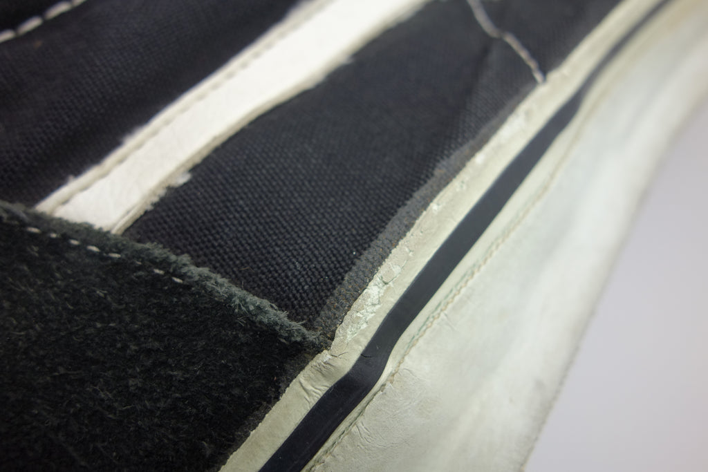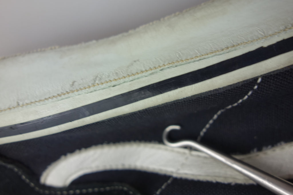 excellent used condition.... HOWEVER THESE ARE DEFECTIVE & the entire first foxing (stripe area) has cured/solidified & is brittle. this area will continue to crack & flake away leaving a trail of rubber. also effected is the top half of the medial friction almost the full length of my tool in the pics. beyond the loss of the first foxing these will hold up to normal wear albeit with unsightly gouges of rubber.