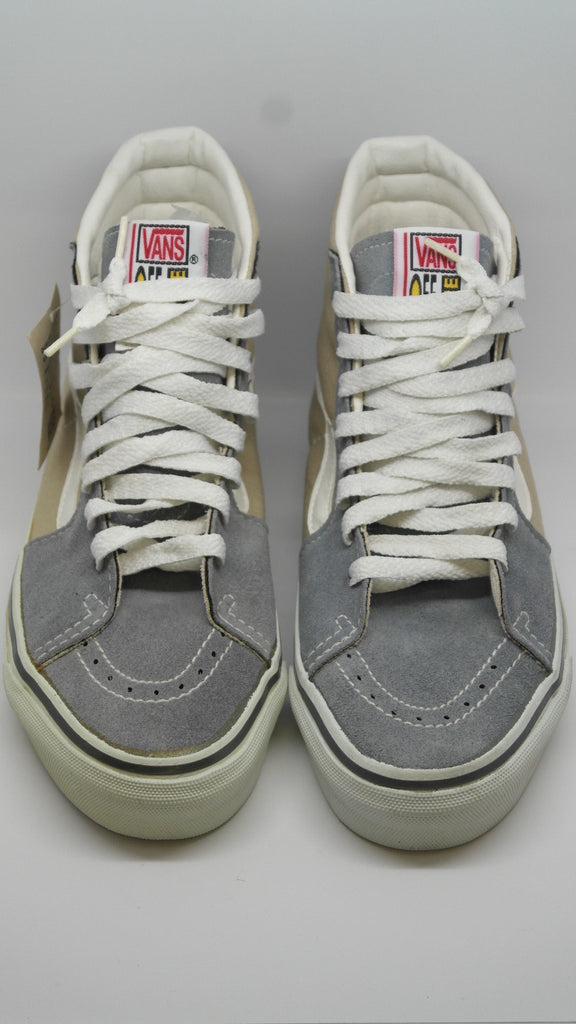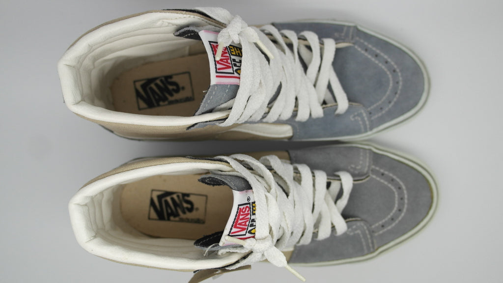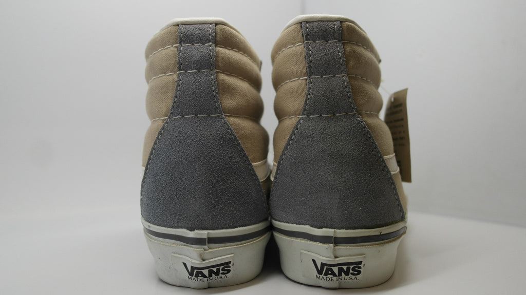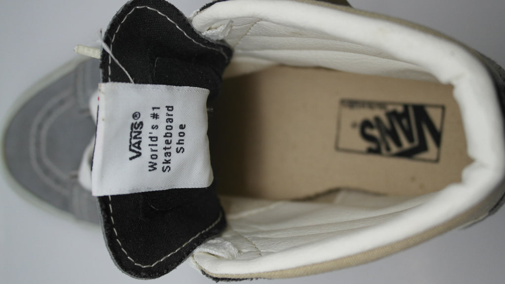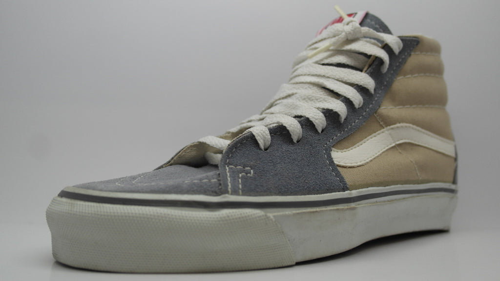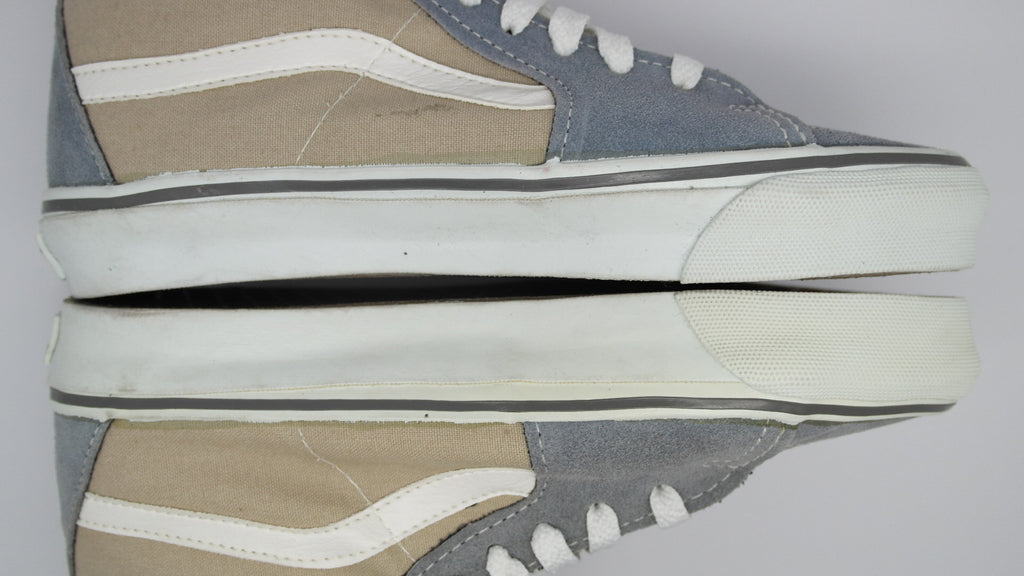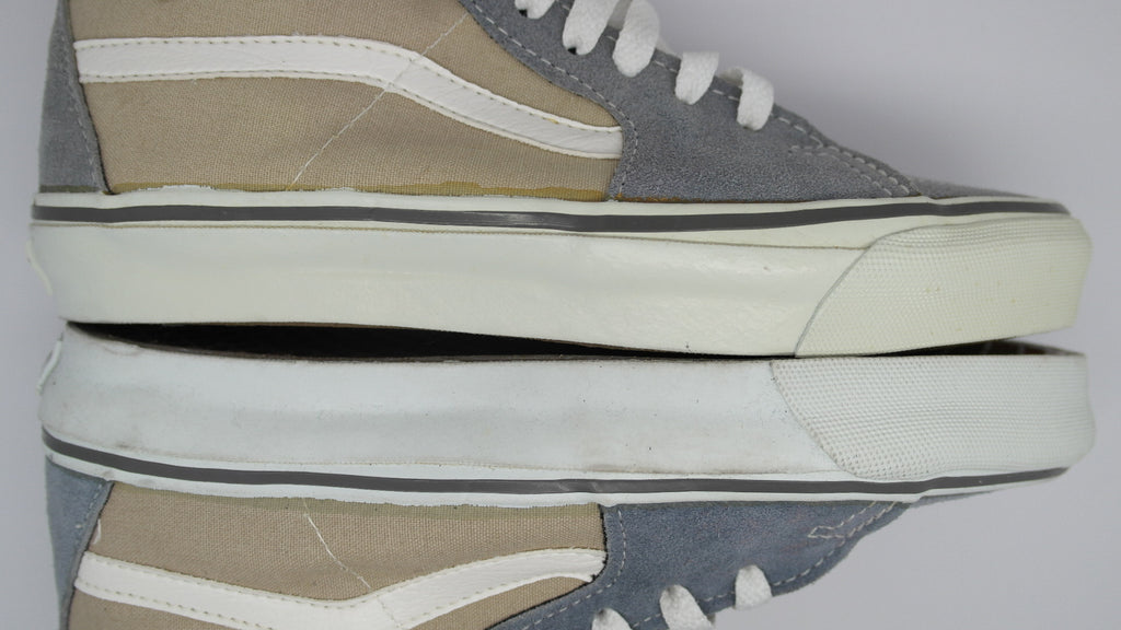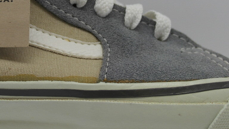 the right shoe saw use as a display model with resulting rubber midsole dullness & yellowing. there is crusted overglue to the toe area & yellowing to the lateral side.