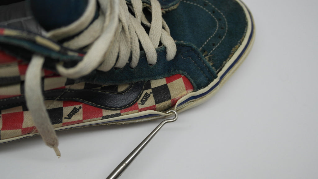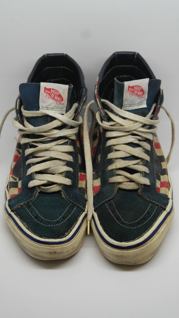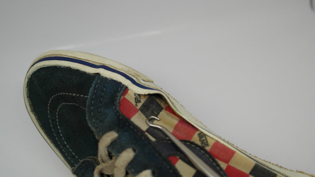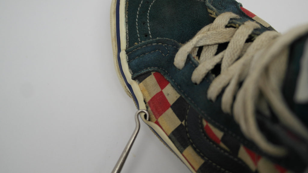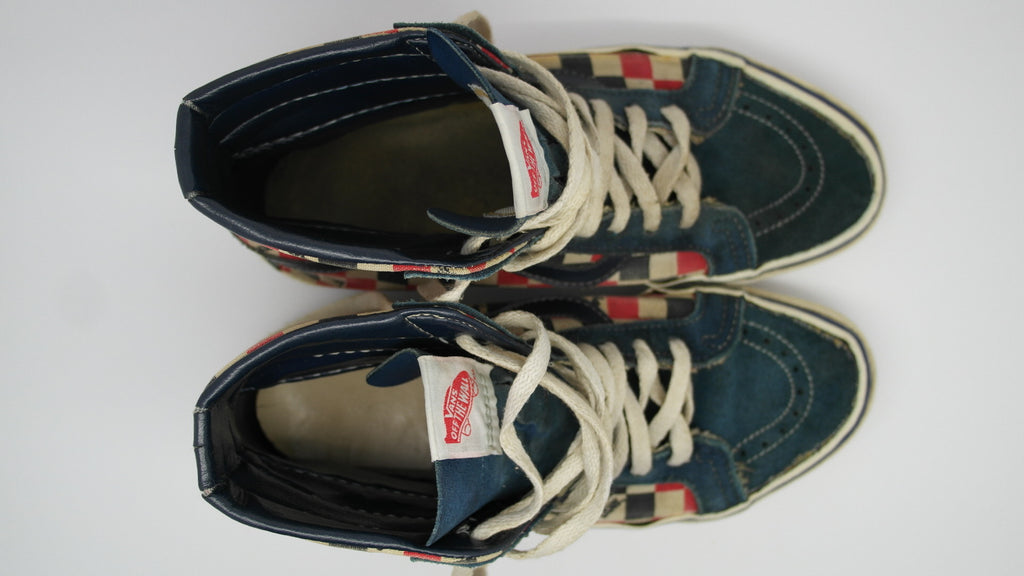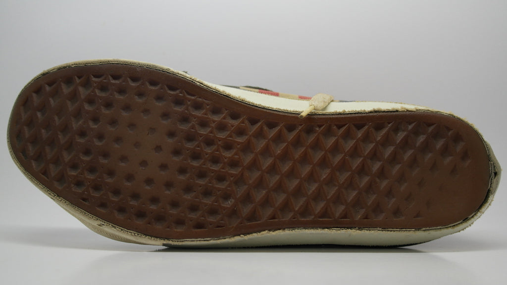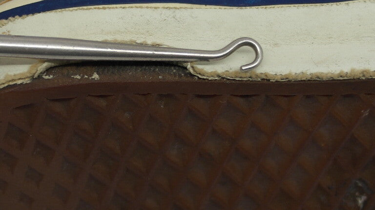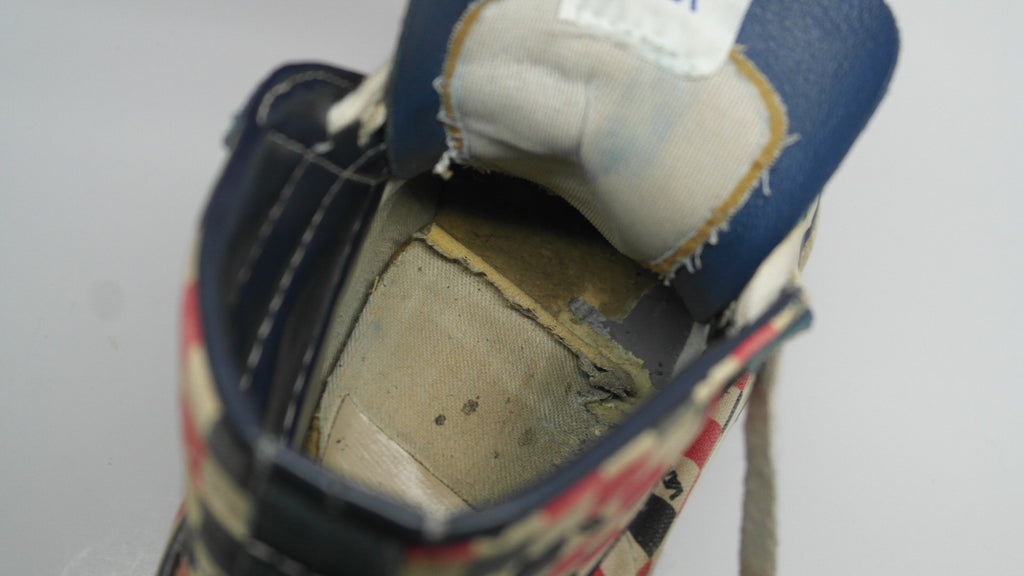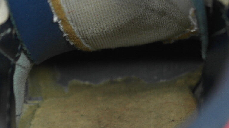 these have seen good use however remain structurally sound. rubber is soft & flexi however does show significant separation with uppers in parts. the footbed shows extensive damage. 1 vinyl heel pad remains & otherwise the footbed has been torn away from the toe to the arch, & is not smooth but lumpy. the left shoe fits slightly bigger like a US8.