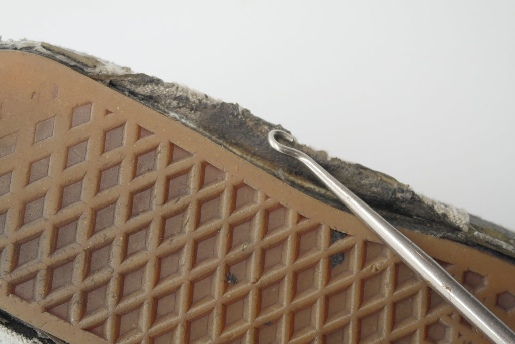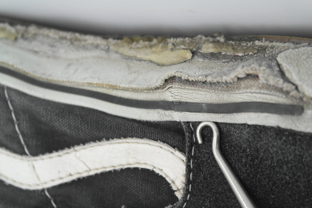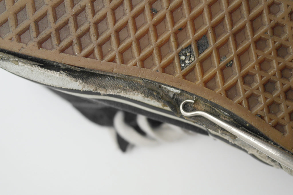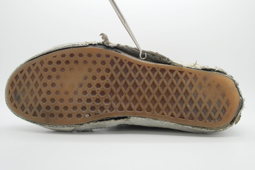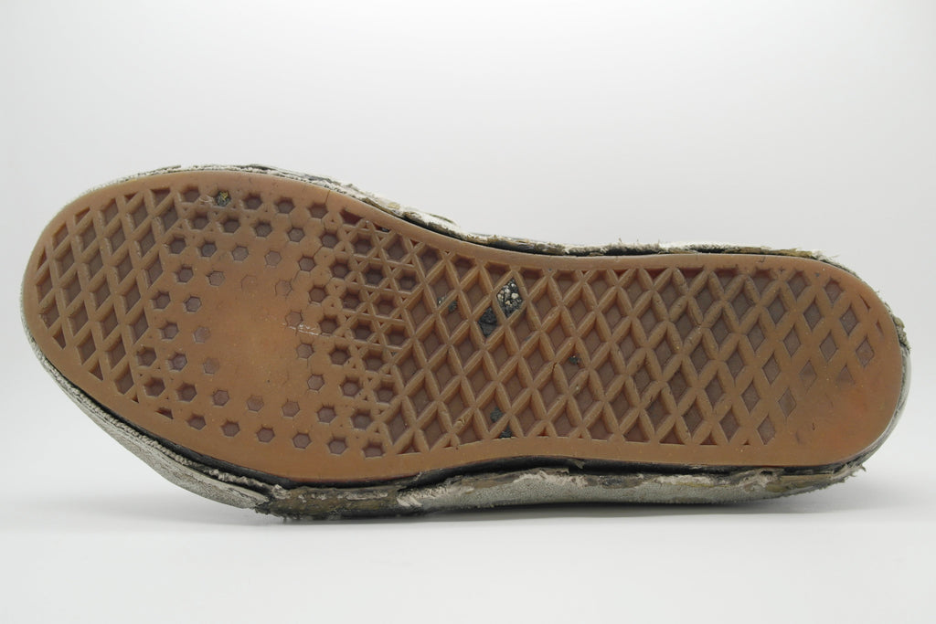 rubber remains soft & flexible however shows widespread mirco-cracking & curling of the friction. the rubber is dry however will hold up to normal wear & not breakdown. minimal separation between rubber & uppers at seams & toe creases. the insole shows a few erosion cavities of similar size that can be seen at the heel. some wear to canvas backing through to suede at toes. size no longer visible. they were bought as US8.5 however fit like US9 or a blown-out 8.5. check measures