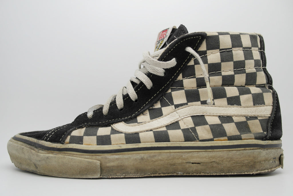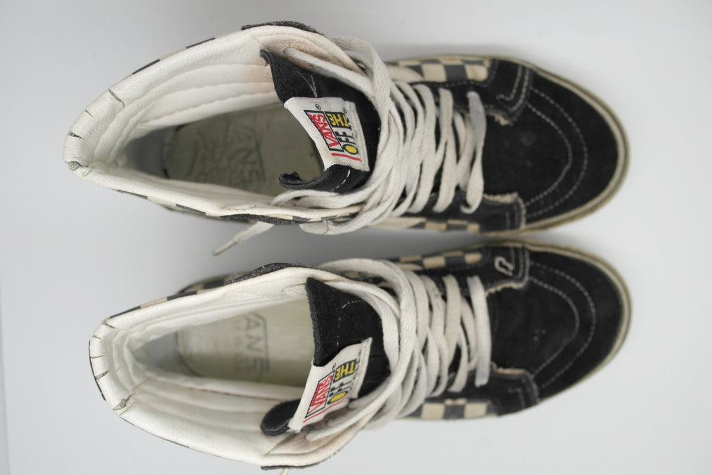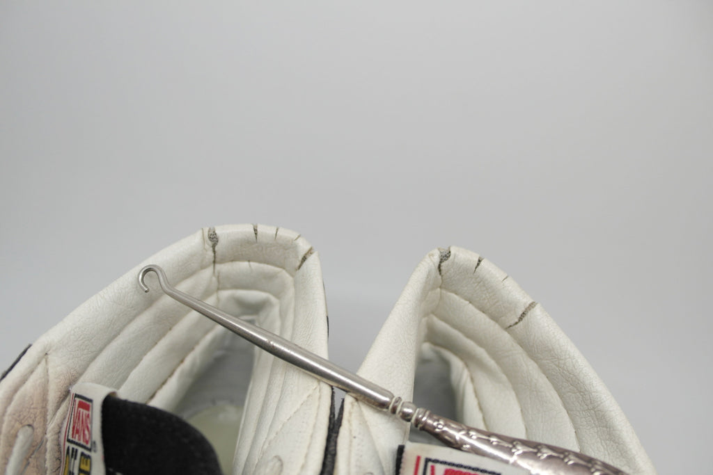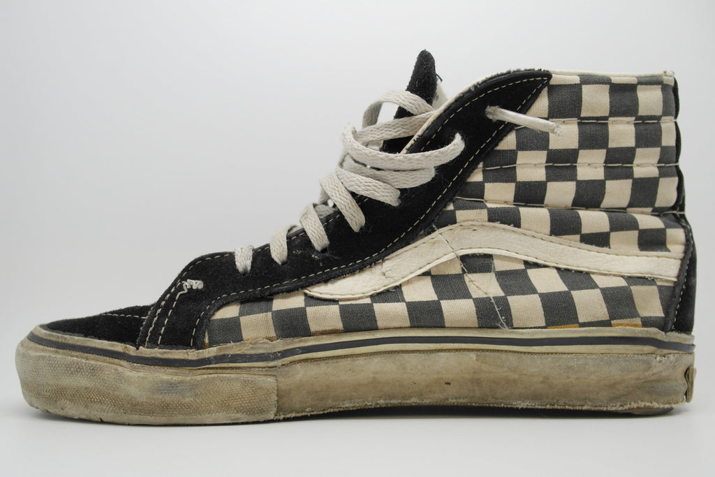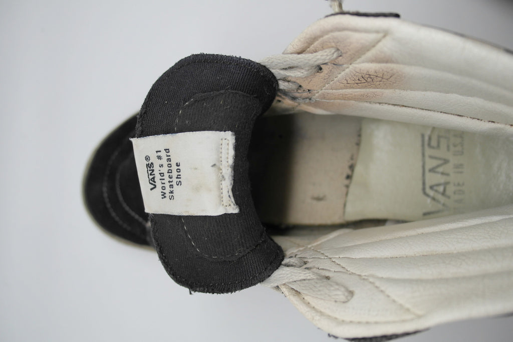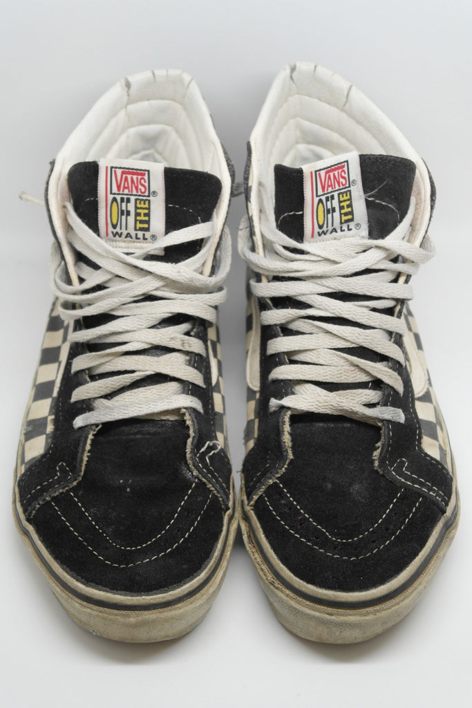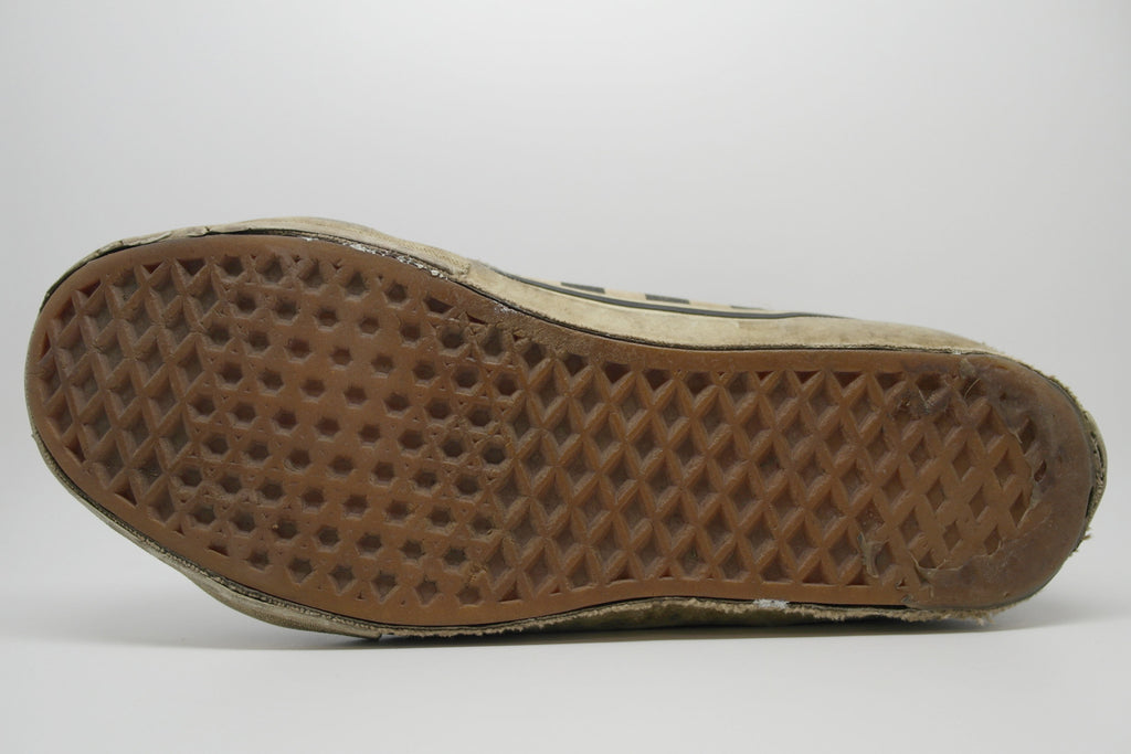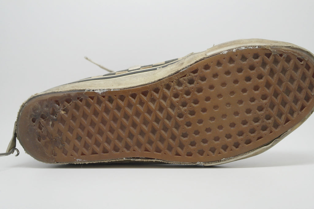 good used condition. significant overall wear with structurally sound foundation. some shoo-goo repair to medial toe creases & 1 canvas split to lateral right toe. shoo-goo repair at waffle heel. some splits to vinyl collar.