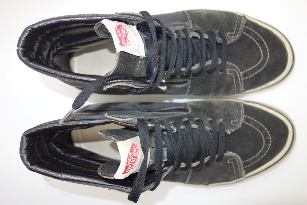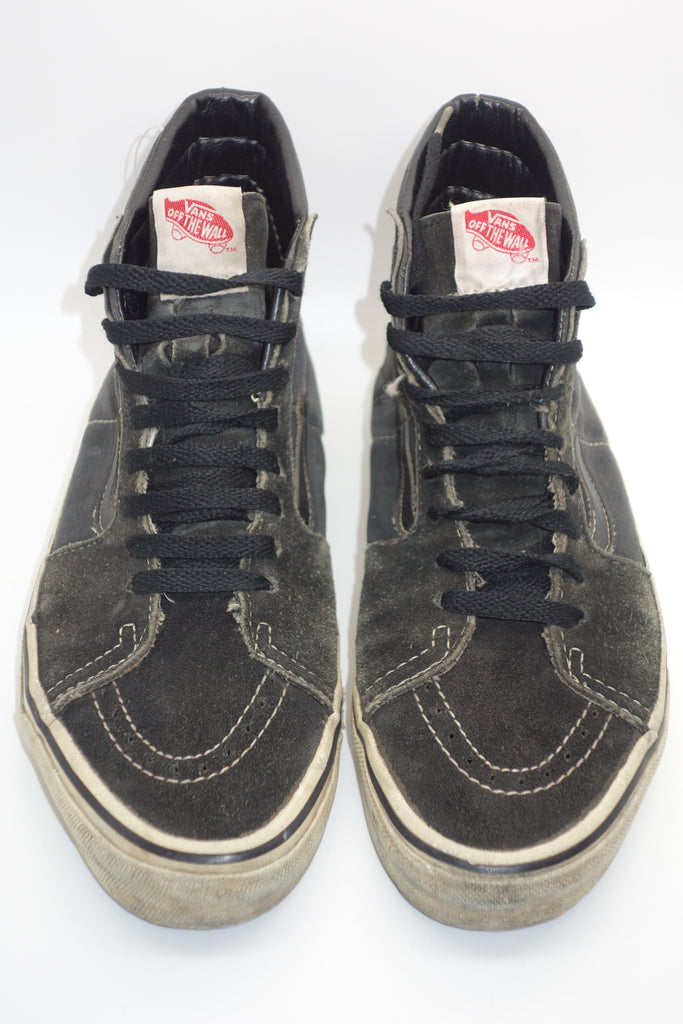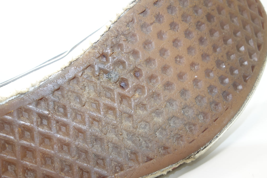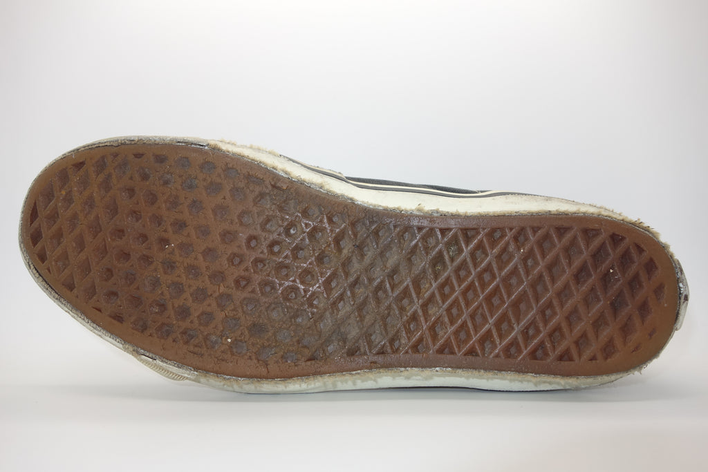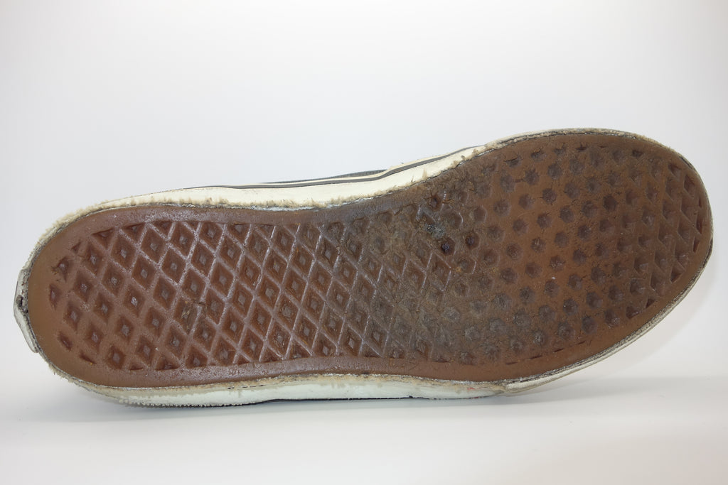 good used condition. all rubber remains soft & flexible. minimal separation from uppers mainly at seams. widespread stress cracking from crush injury. saw good wear however structurally sound. pedal erosion on waffle from bmx. size not visible but bought as US9 & measures accordingly if not towards US9.5