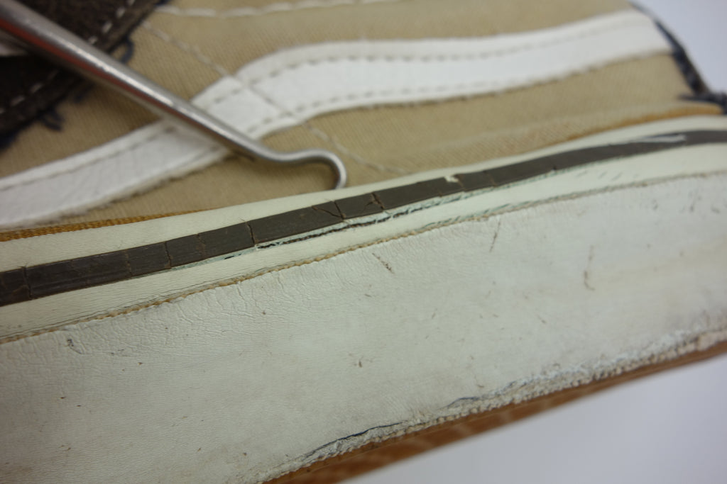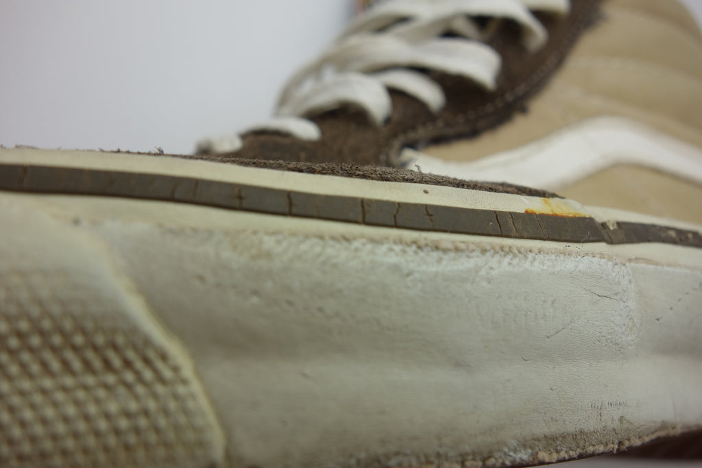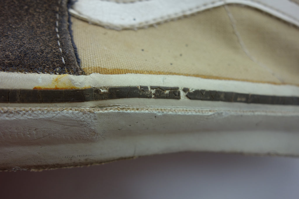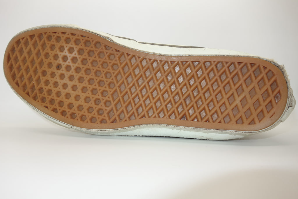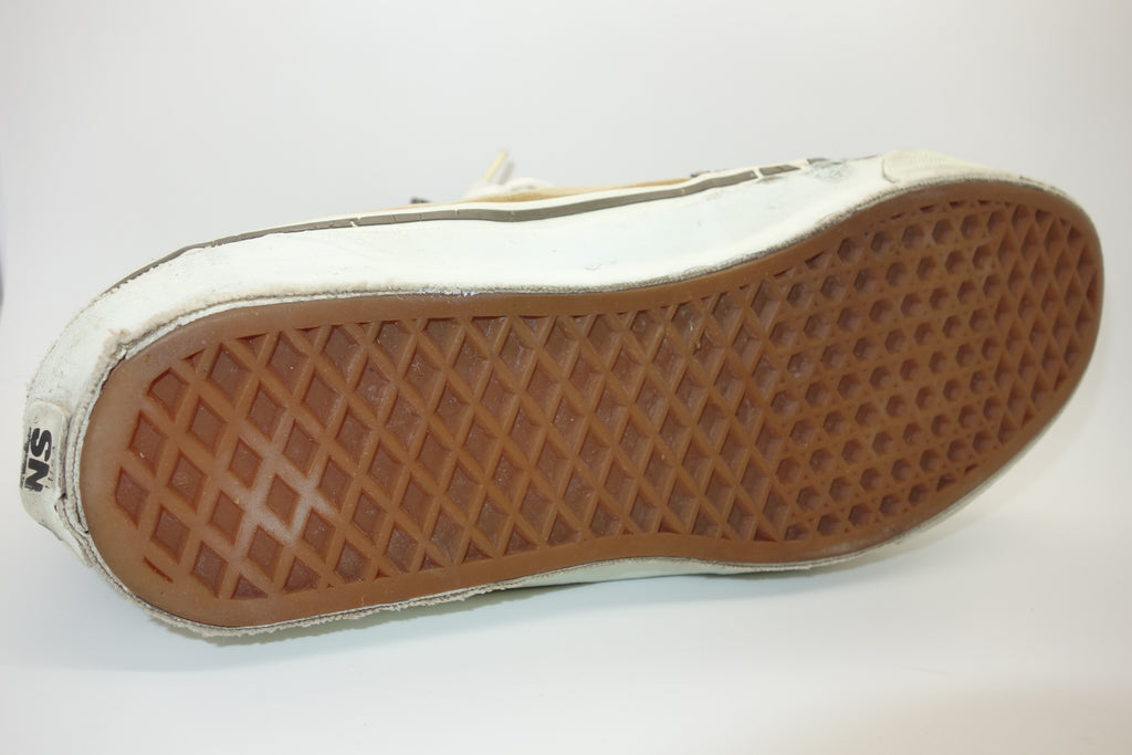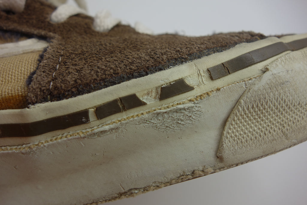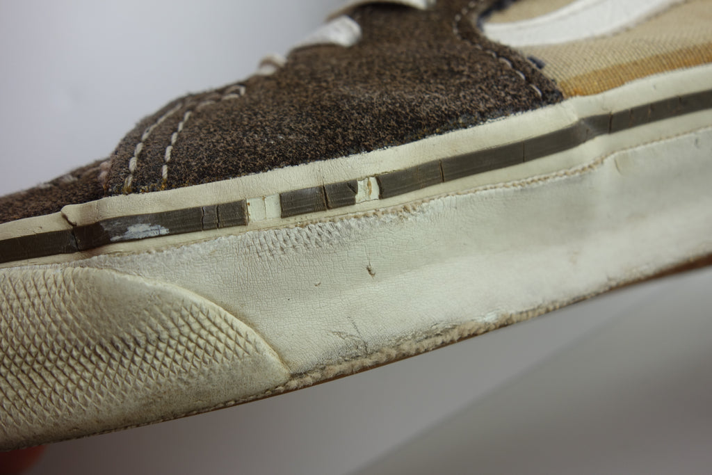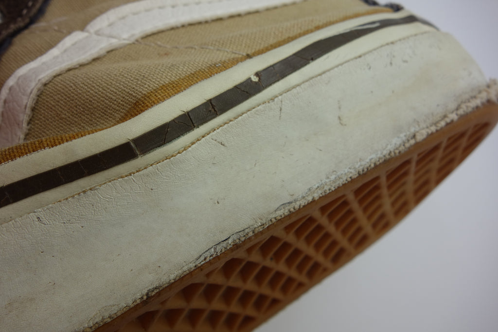 very good used condition. all rbber remains soft & flexible except the entire brown foxing stripe has cured/solidified & is brittle! hairline cracks & minor erosion already show HOWEVER THIS HAS NOT spread throughout parts of the white rubber first foxing. ONLY THE FOXING STRIPE HAS HARDENED. the first foxing, friction, sidewall, bumper & waffle itself. hairline cracks will continue and only chunks of the foxing stripe will be lost with further minimal surface erosion into the white rubber underneath. thereafter they will hold up to normal wear. size may be just visible but very confident of US9.5. wear at own risk!