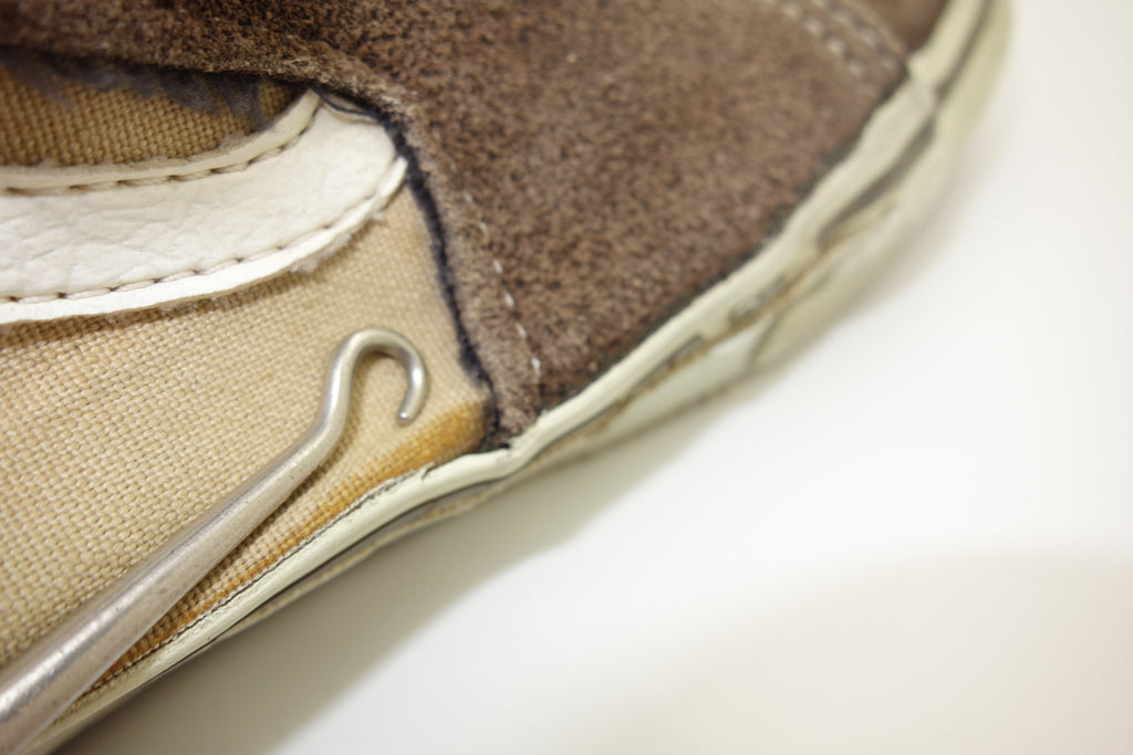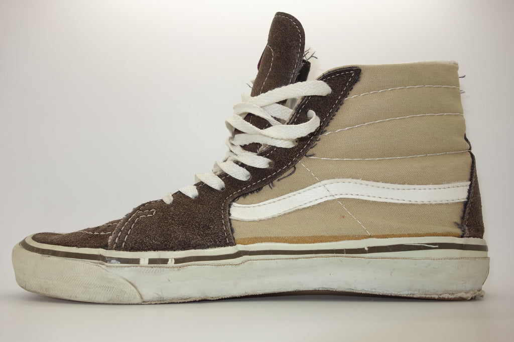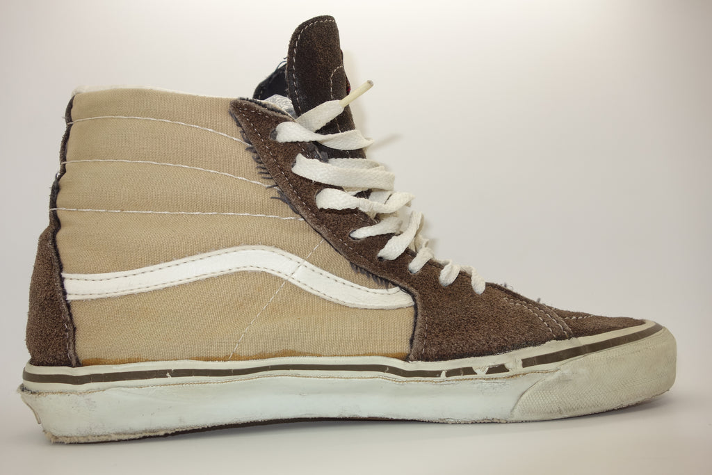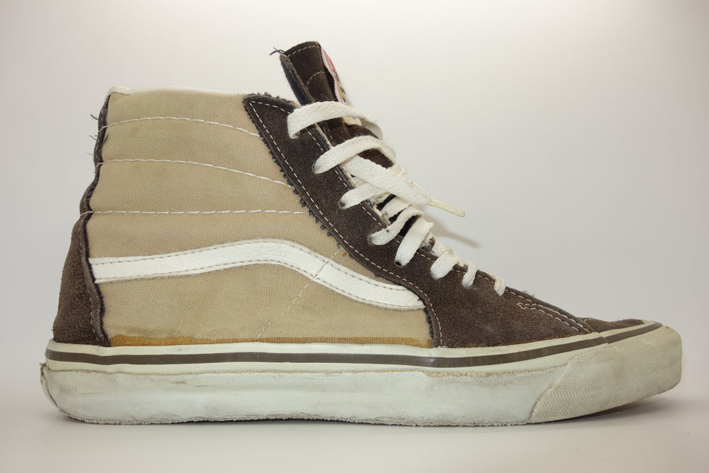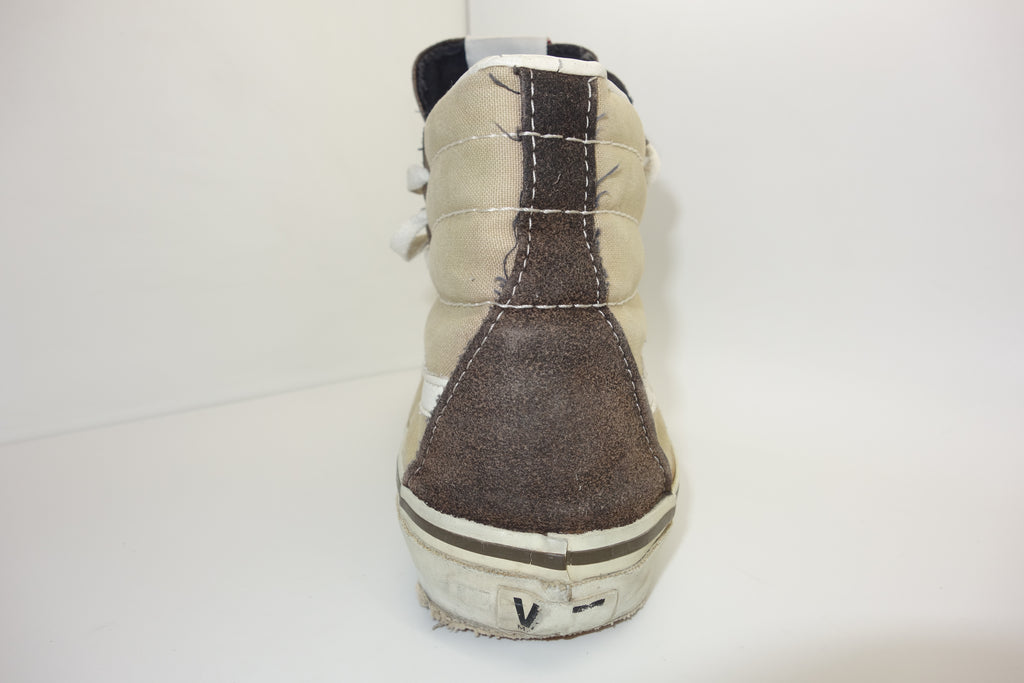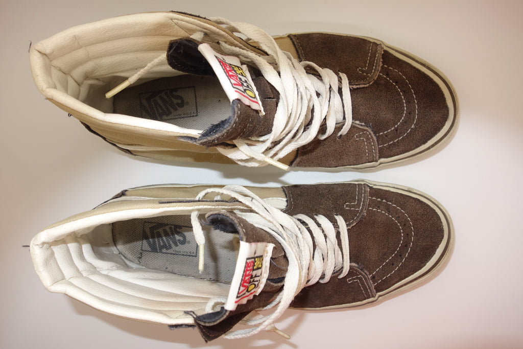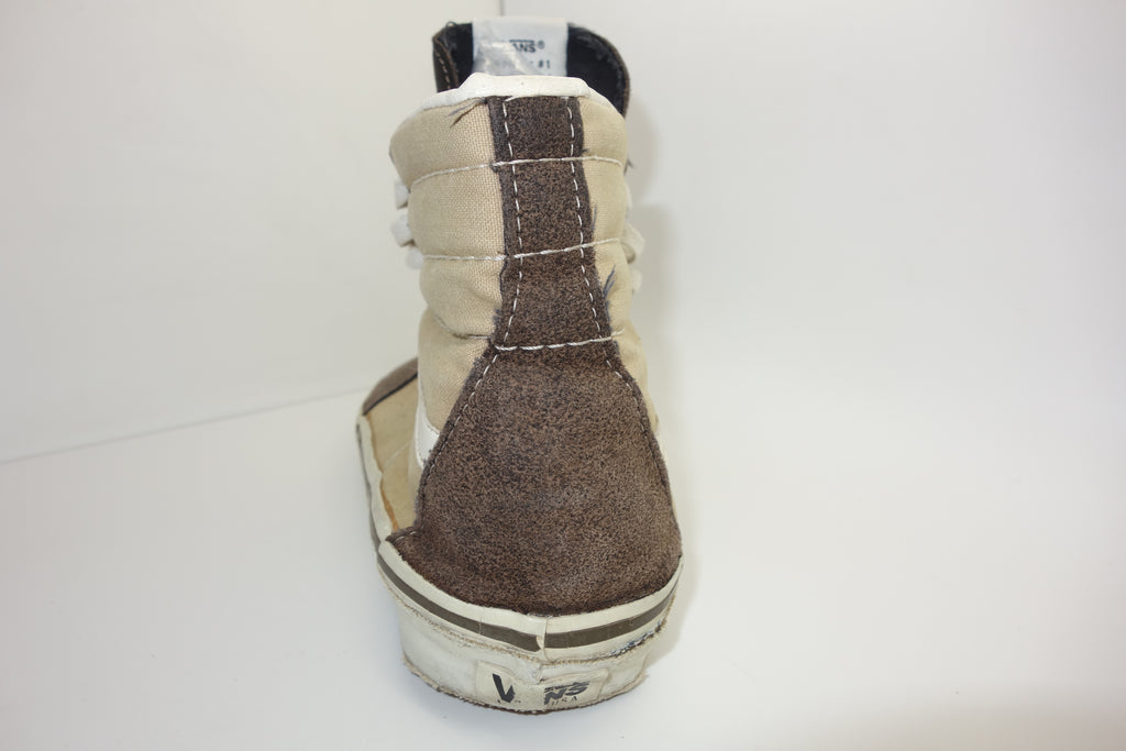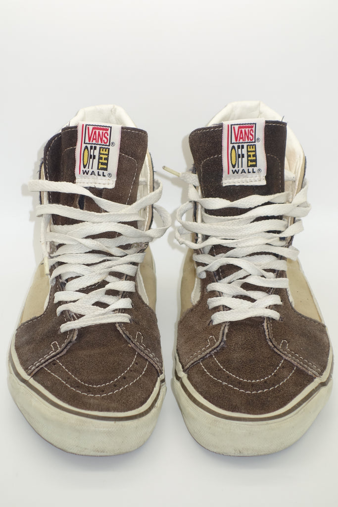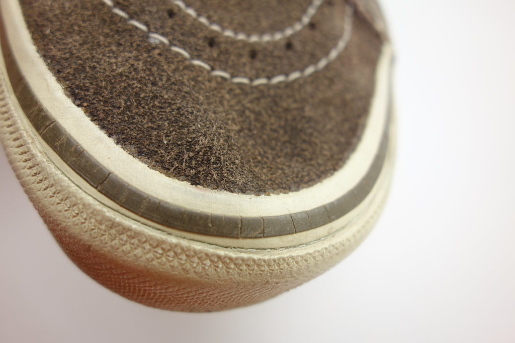 very good used condition. all rbber remains soft & flexible except the entire brown foxing stripe has cured/solidified & is brittle! hairline cracks & minor erosion already show HOWEVER THIS HAS NOT spread throughout parts of the white rubber first foxing. ONLY THE FOXING STRIPE HAS HARDENED. the first foxing, friction, sidewall, bumper & waffle itself. hairline cracks will continue and only chunks of the foxing stripe will be lost with further minimal surface erosion into the white rubber underneath. thereafter they will hold up to normal wear. size may be just visible but very confident of US9.5. wear at own risk!