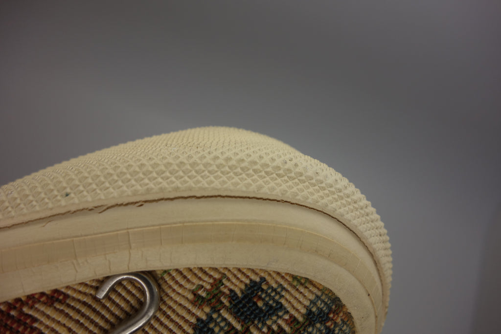 very good used condition. significant wrinkling upon bend to rubber midsole & minor stress cracking. the rubber on the left shoe is dry & the first foxing shows minor surface cracking, however from experience the malleable & supple ecru rubber scene should hold up to normal wear