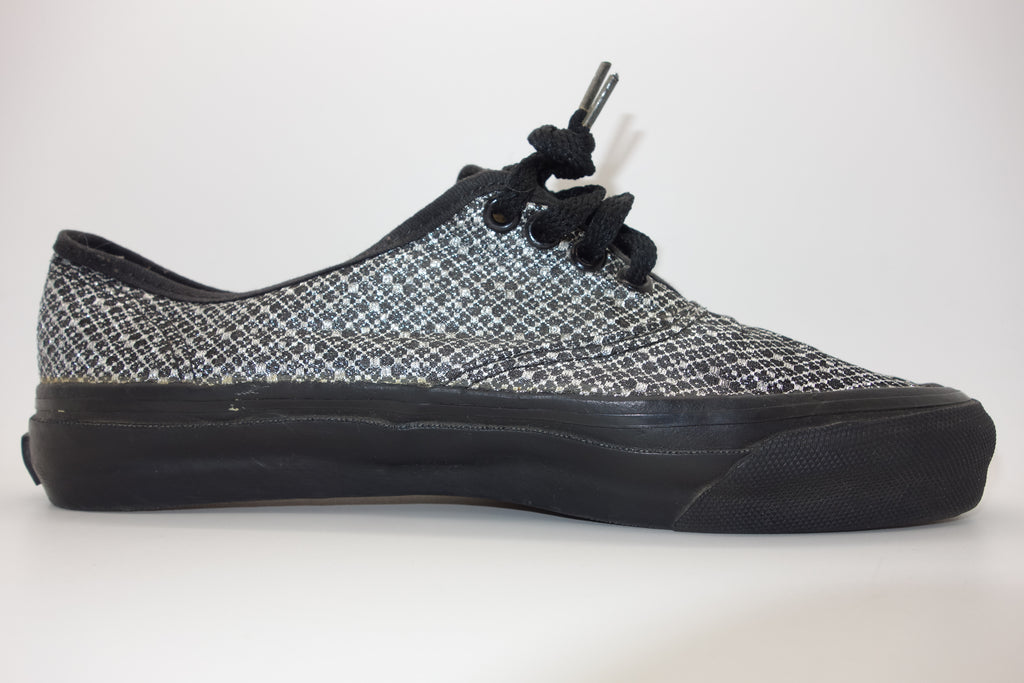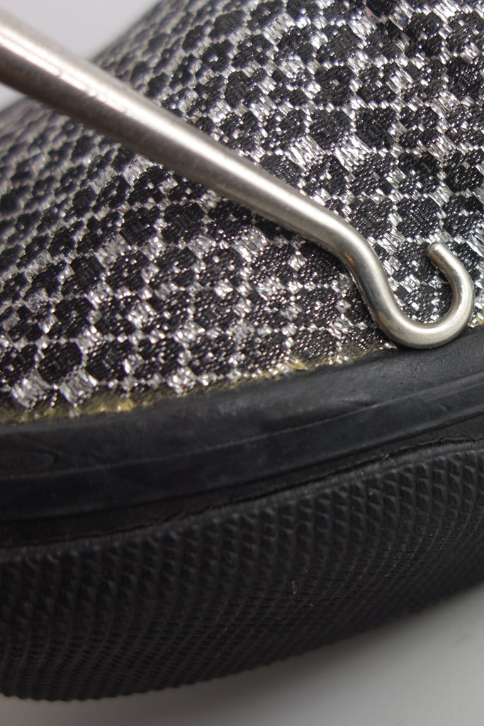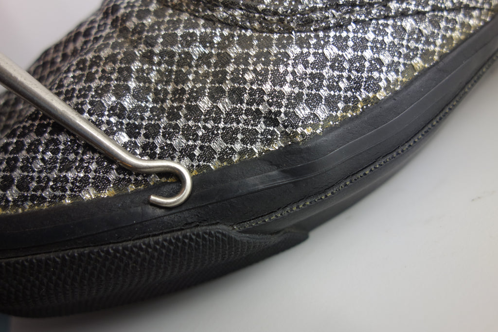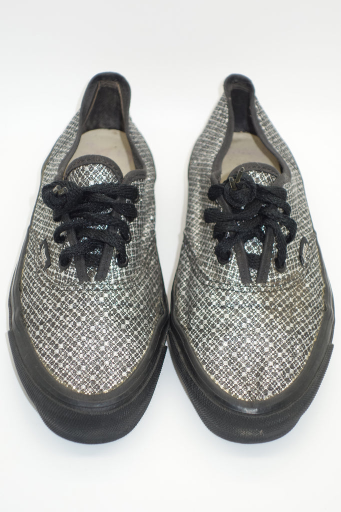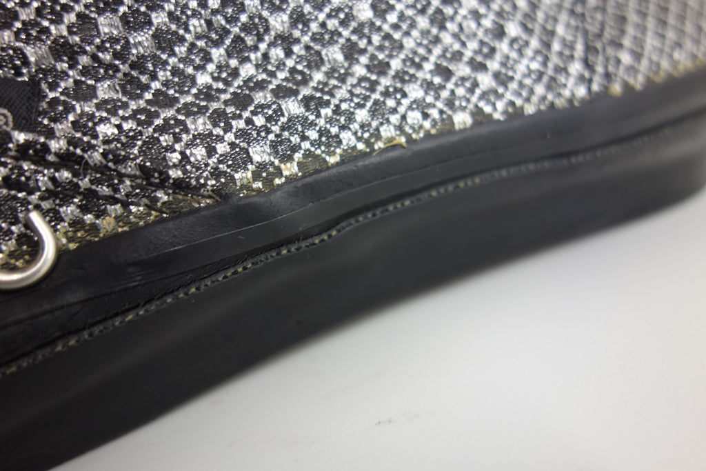 very good used condition. all rubber remains soft & flexible however its possible the adhesive meeting uppers has oxidised. minor separation shows however from experience this is likely to continue across the shoes, especially at the crease area. possible re-glue surgery could repair however will it hold over time?? wear at own risk. dunno what one calls this textile but the uppers themselves are textured glitter.