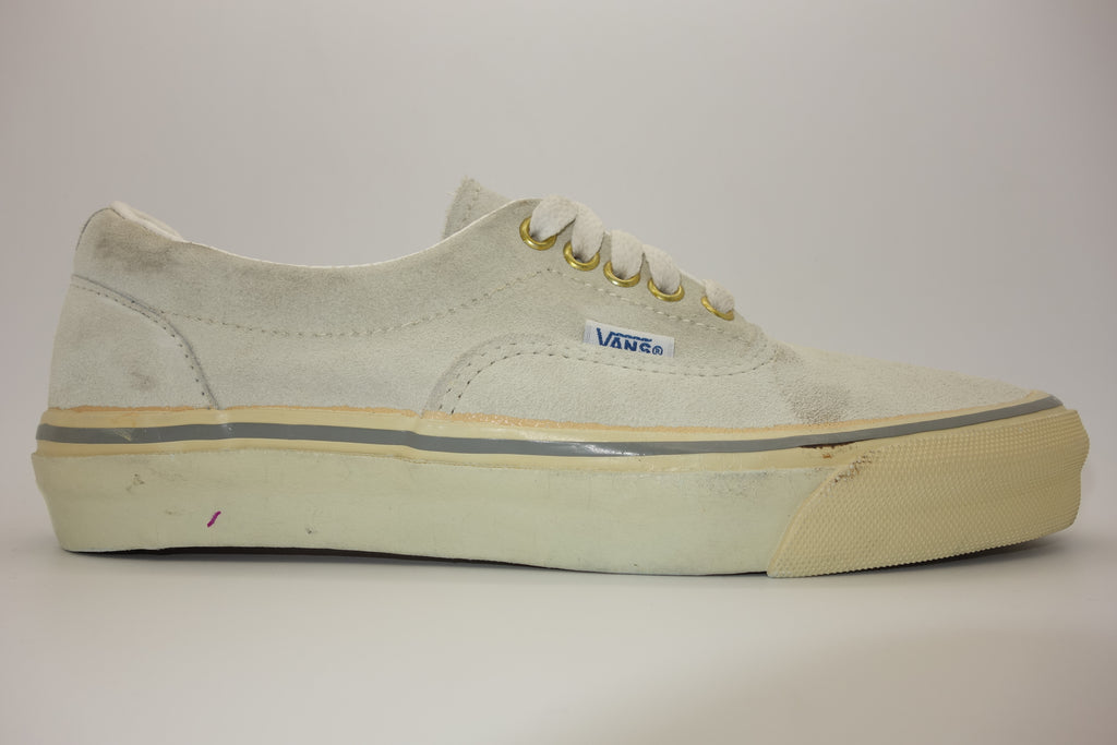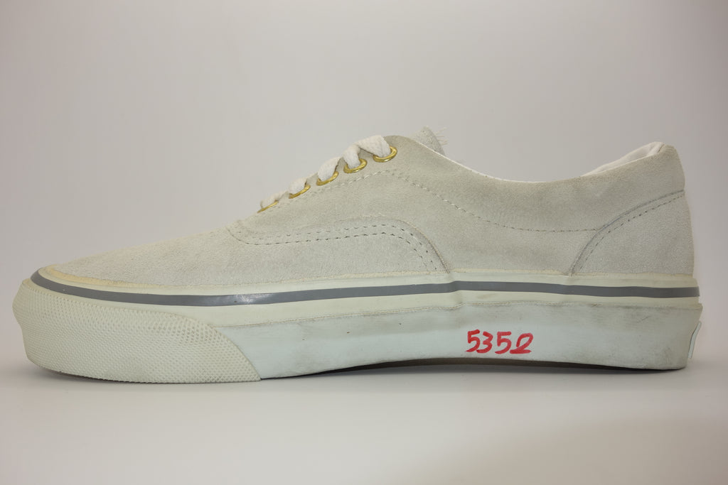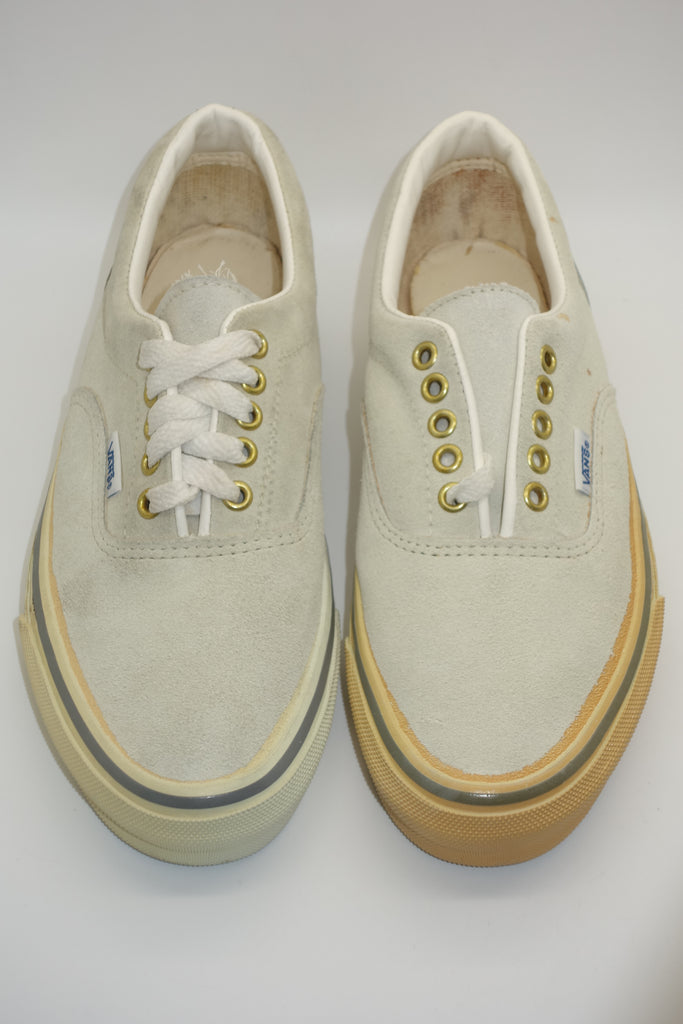 the US7.5 is pictured in full & is unworn however quite obviously saw long-term exposure to light as a window display floor model. price stickers on the foxing reveal the original colour, whereby some adhesive paper does remain. the suede remains soft however some blemish prsent from storage/handling wear. the rubber remains soft & flexible despite widespread yellowing, jigsaw cracking & wrinkling upon bend. from experience however van's of this age tend to hold up normal despite such defects. the left waffle especially has darkened but remains soft & should hold up to normal wear. some curling to vinyl heel inserts. wear at own risk.