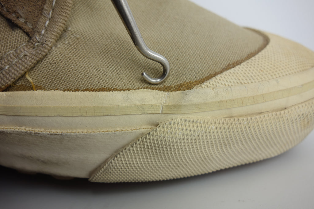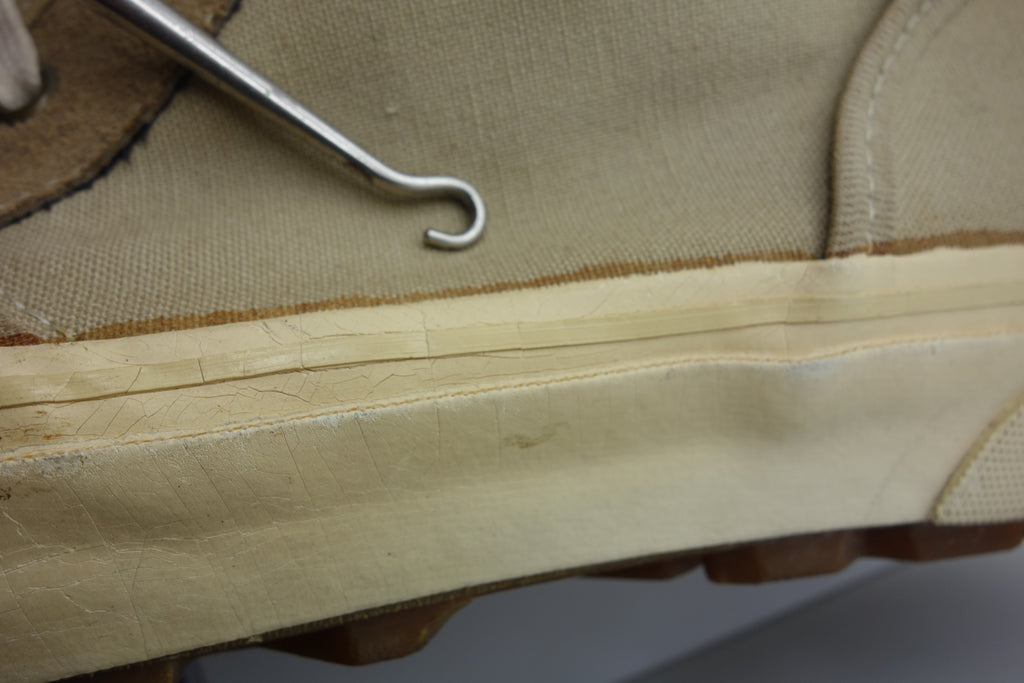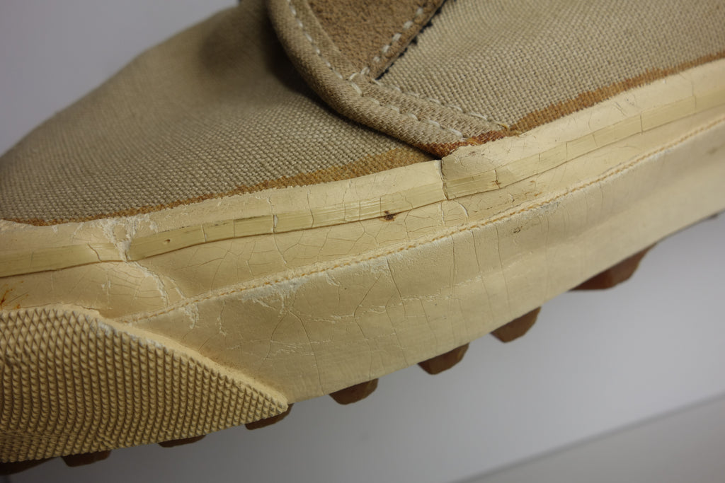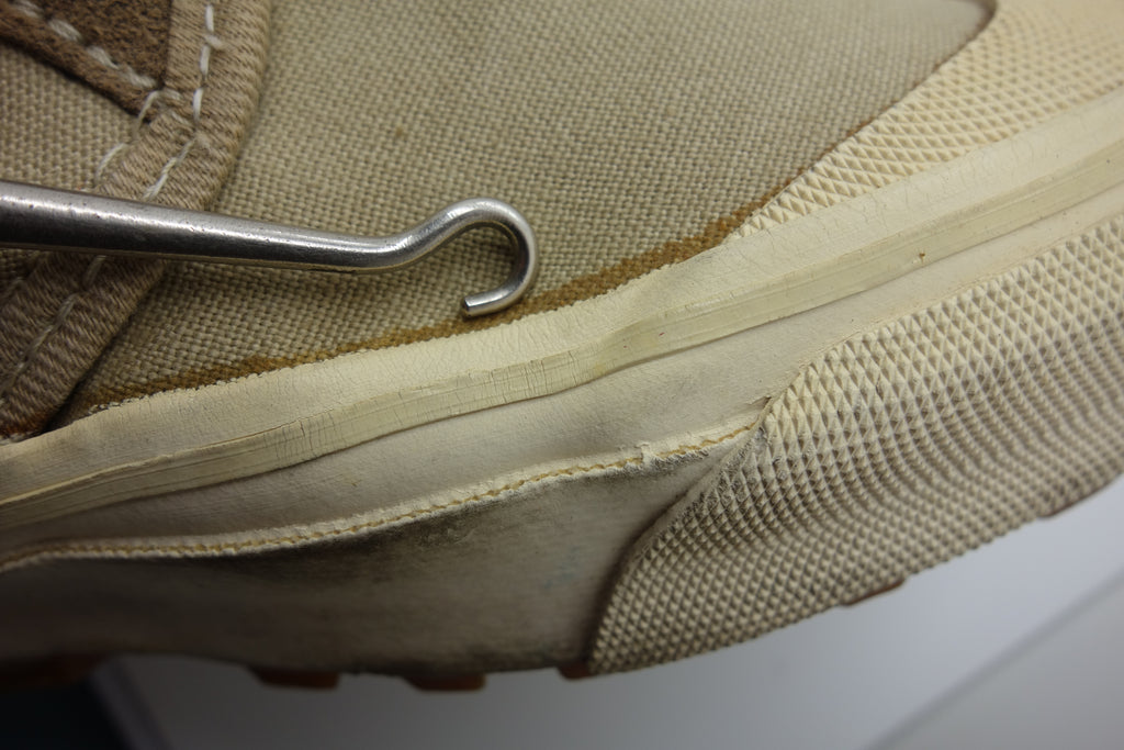 good used condition. these saw usage as floor display model with resulting rubber yellowing to left medial side & toes. the rubber remains malleable however hardened in areas including the foxing stripe. from experience these should hold up to normal wear with minimal rubber loss. i forsee rubber flaking rather than cracking & only toe creases presenting problems. the foam fiber-fill tongue has persished & the minimal padding in the tongue may leave dry black residue on insole & socks.