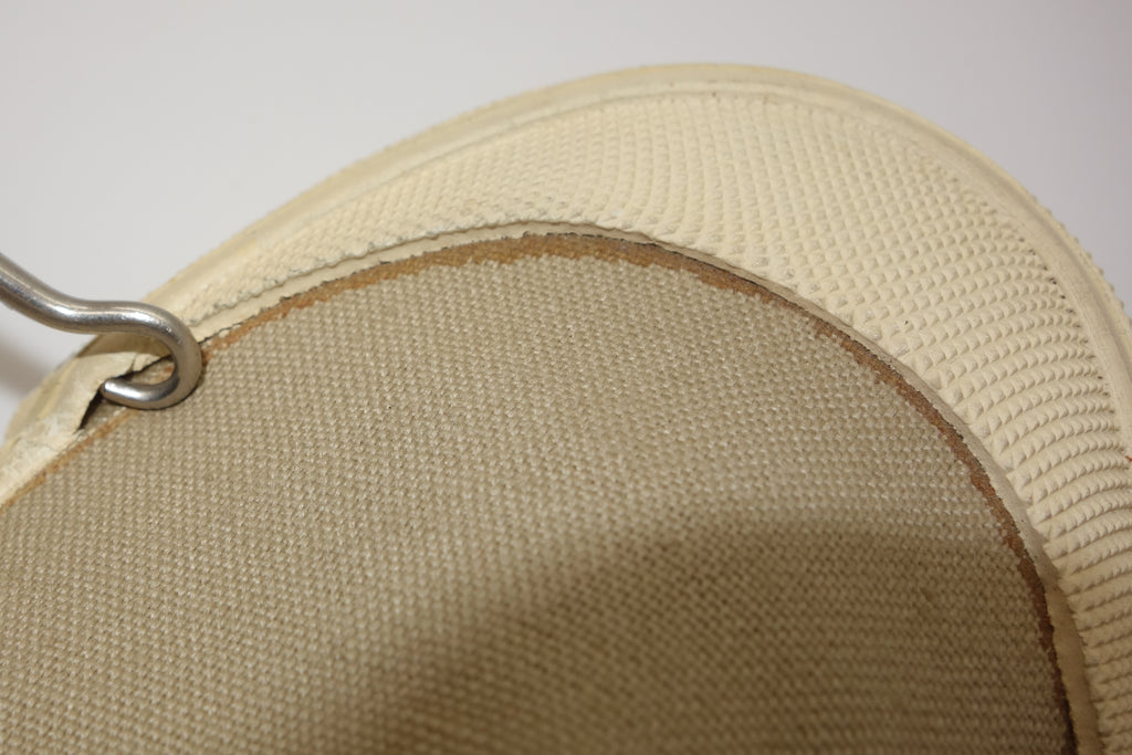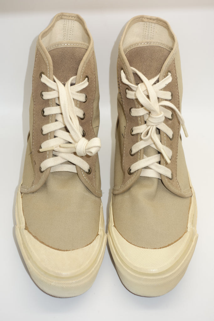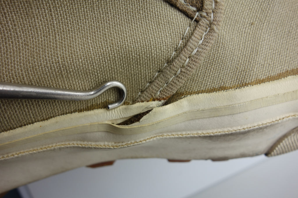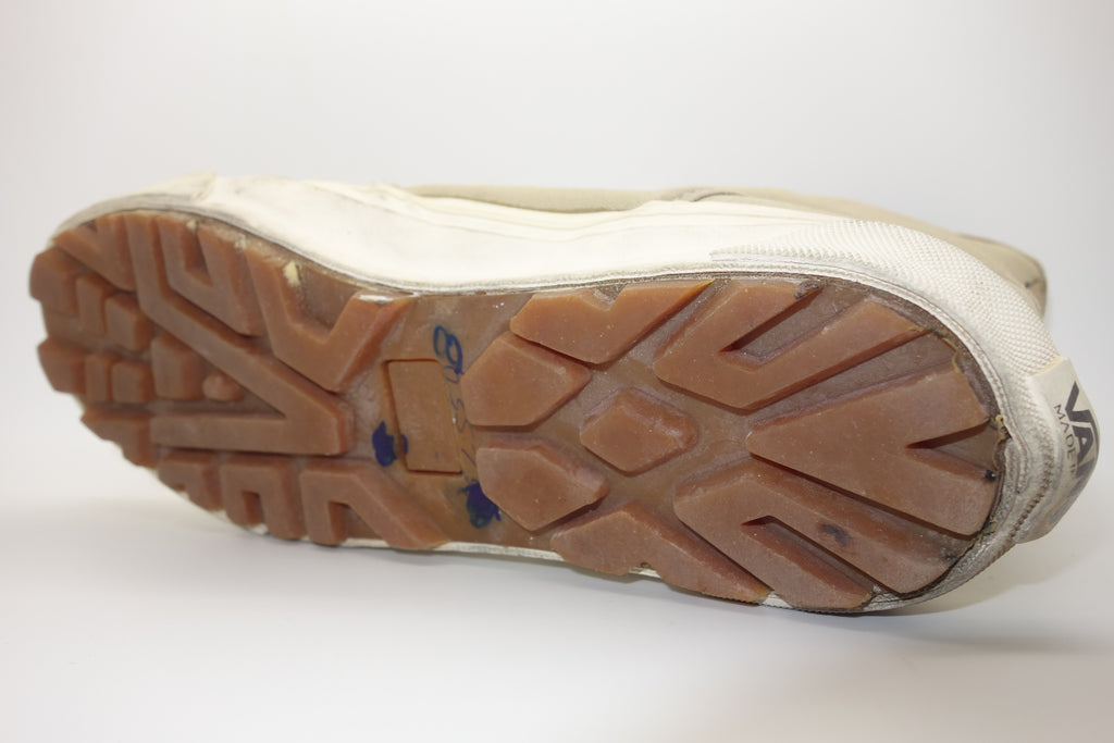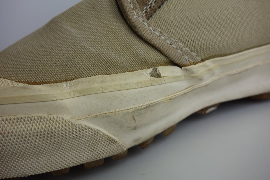 good used condition. these saw usage as floor display model with resulting rubber yellowing to left medial side & toes. the rubber remains malleable however hardened in areas including the foxing stripe. from experience these should hold up to normal wear with minimal rubber loss. i forsee rubber flaking rather than cracking & only toe creases presenting problems. the foam fiber-fill tongue has persished & the minimal padding in the tongue may leave dry black residue on insole & socks.