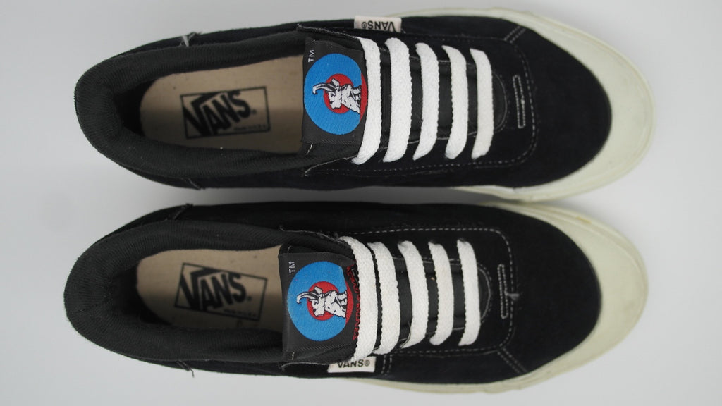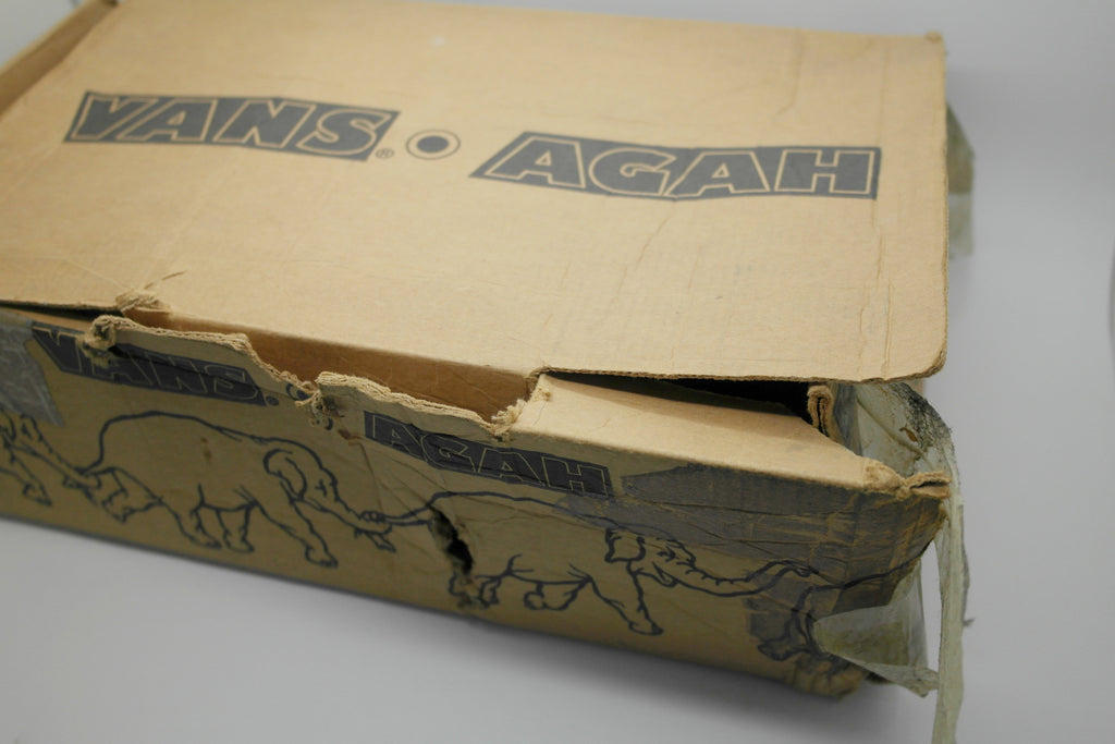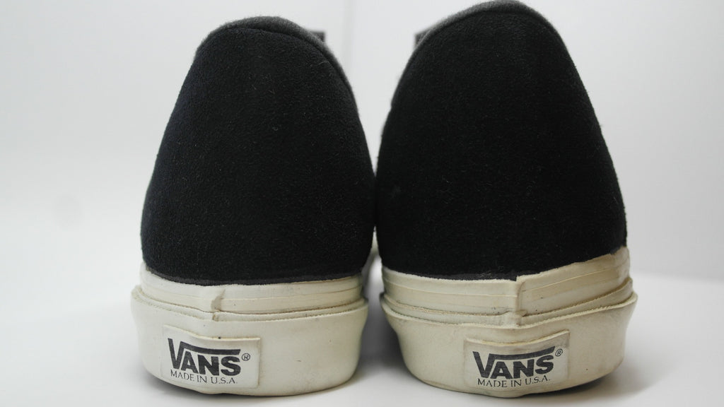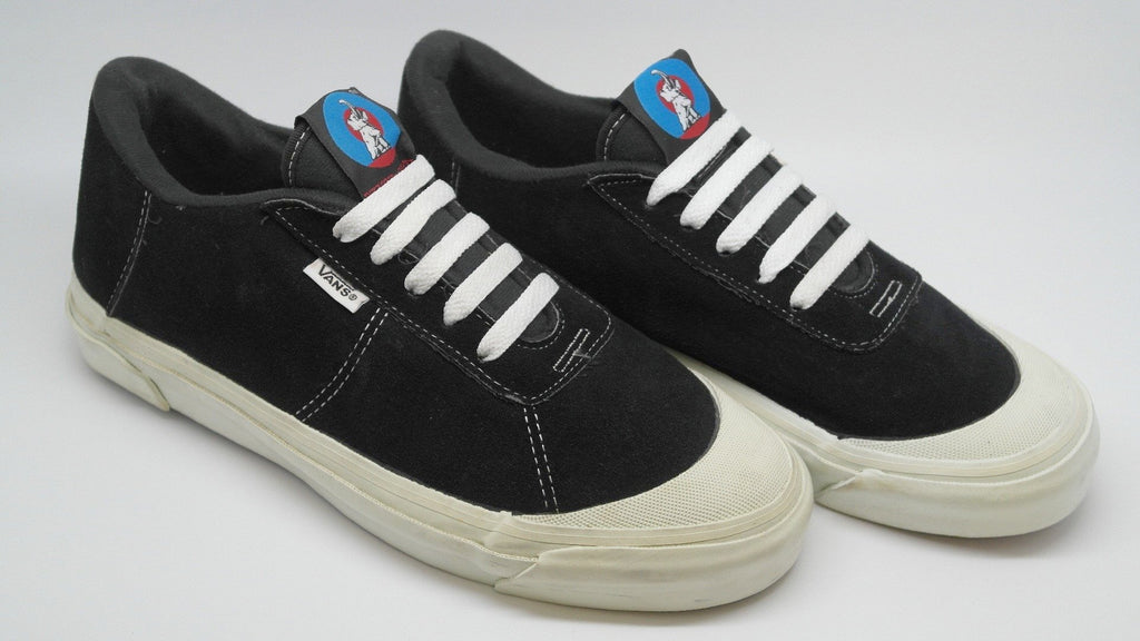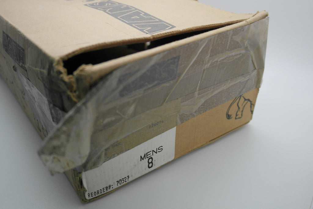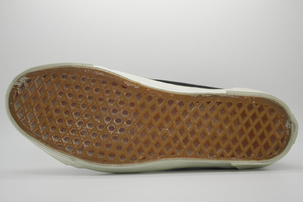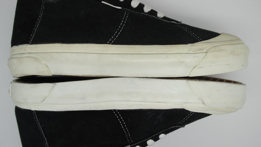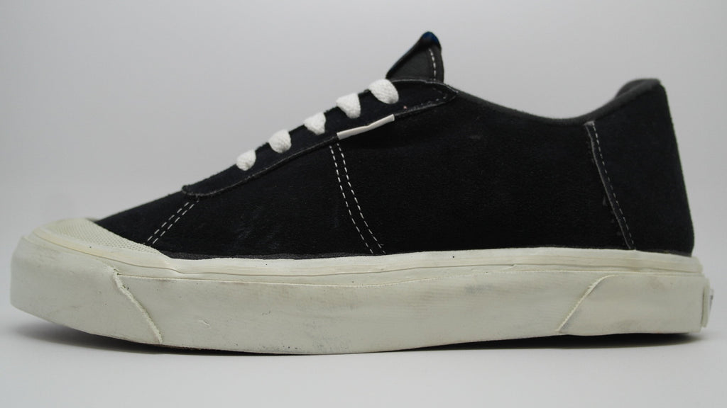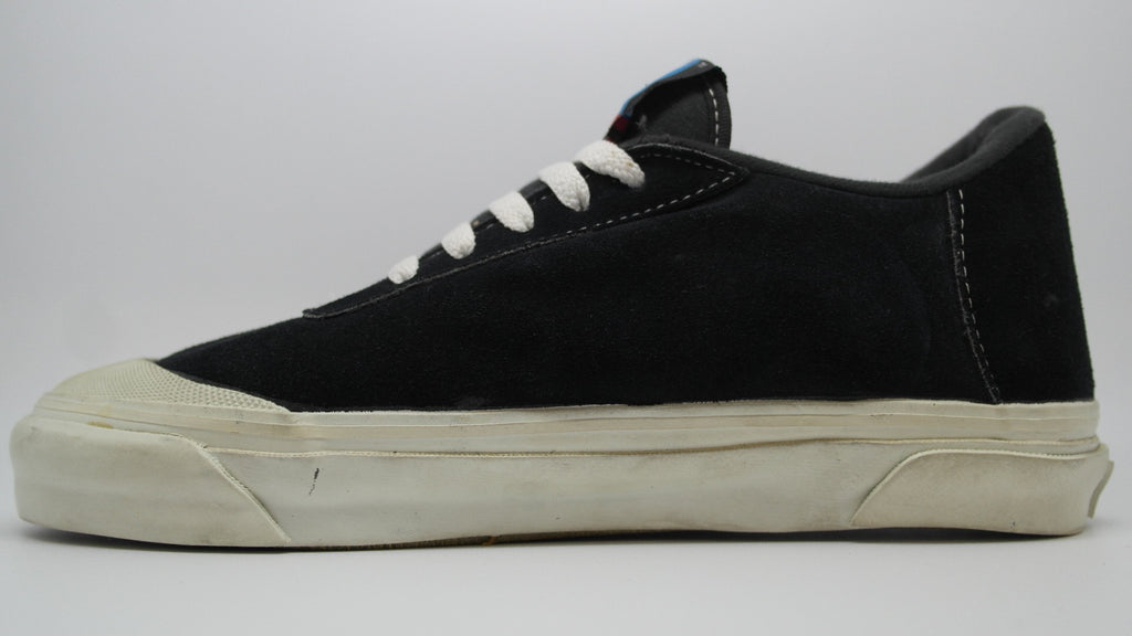 the suede is listed as navy blue but for all intents & purposes appears black. the right shoe saw very short-term use as a display model with resulting rubber yellowing. very minor micro-cracking from crush injury. from experience this will not effect wear. the box lists US8 but both shoes list US8.5. the right waffle measures slightly longer & has larger surface area of uppers... but both shoes measure equal internally at roughly 27cm. please check measures. box shows several tears with duct tape repairs