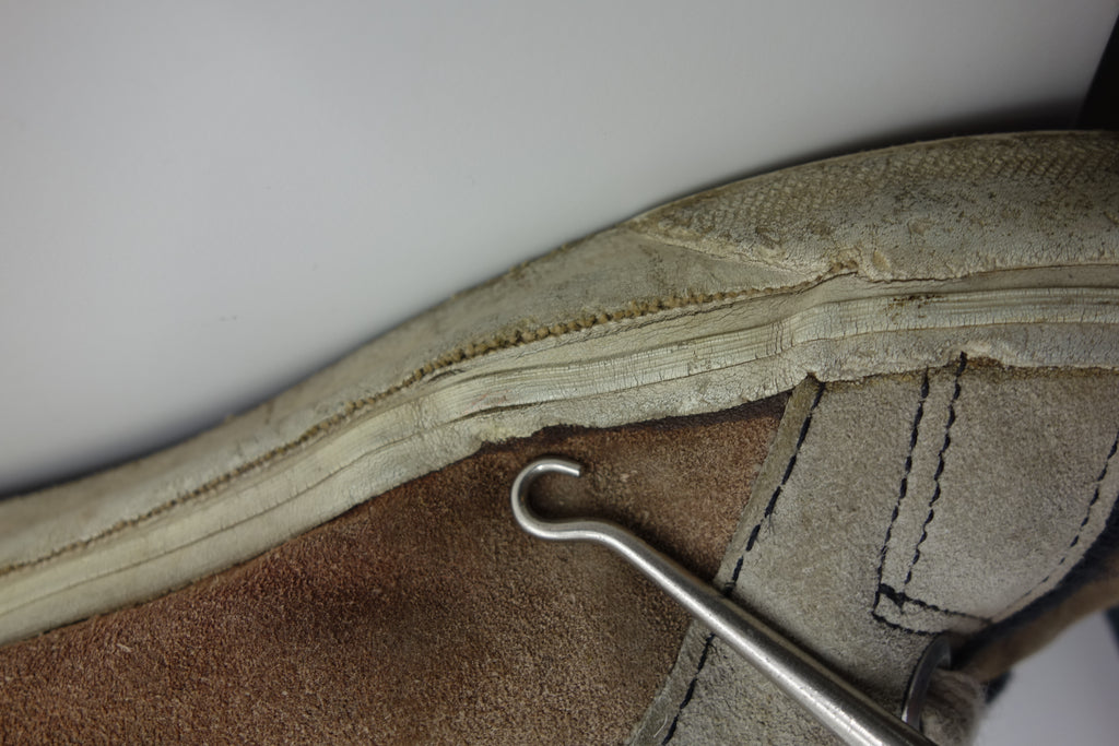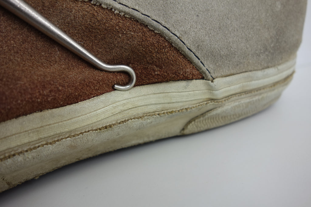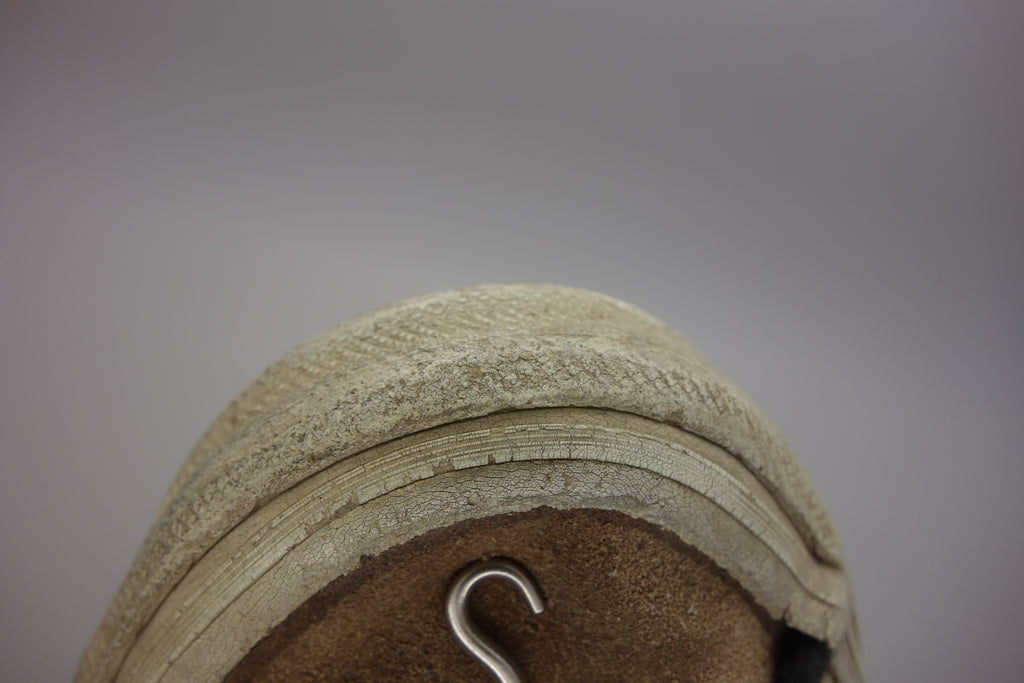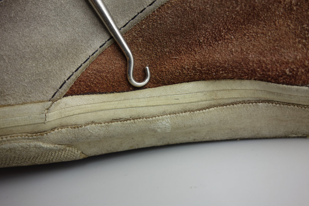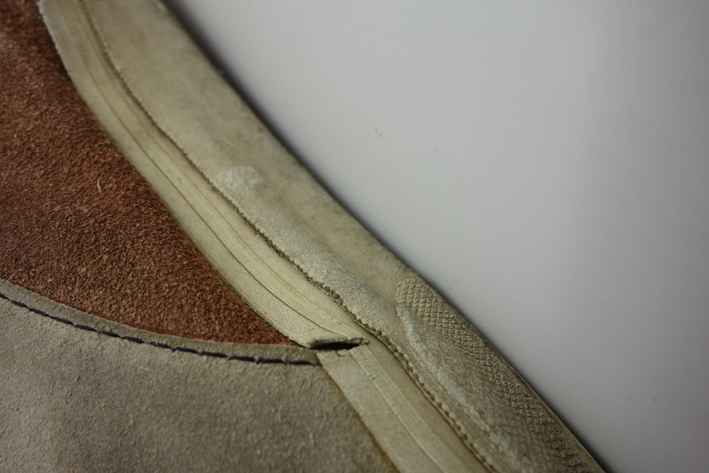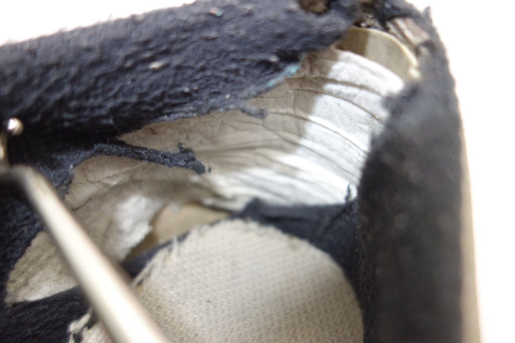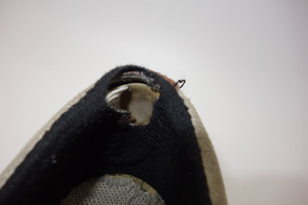 decent used condition. the white rubber is dry rather than hard. from experience these will hold up to normal wear with possible flaking of rubber in crusty areas. wear to the tricot lining of the heel of both shoes exposes the styrofoam reinforcement. the left styrofoam was completely pulped & has split down the back however both plastic heel counters behind are intact. some wear to inner lining at big toes through to suede. no size visible but fairly confident of US8.5.
