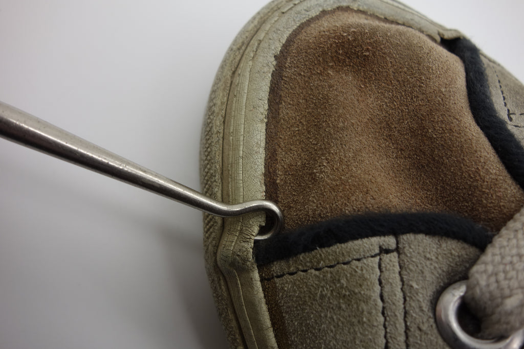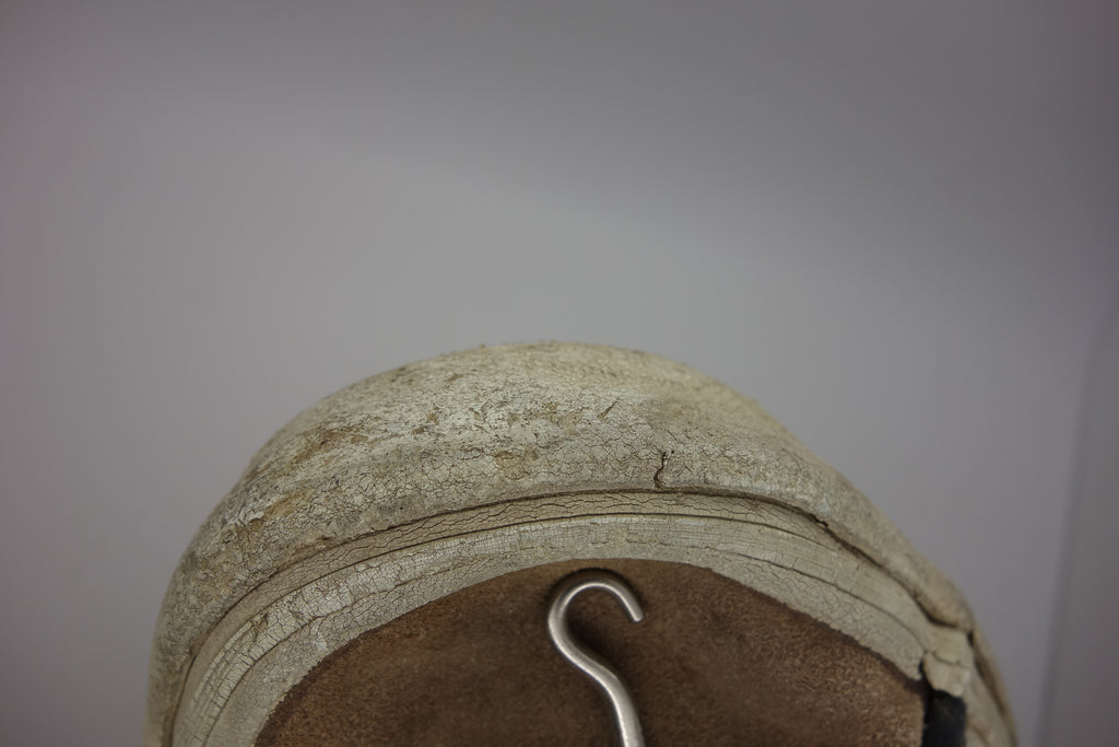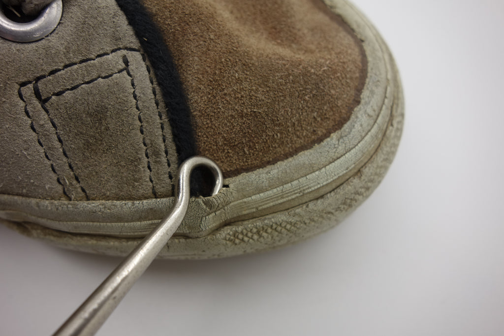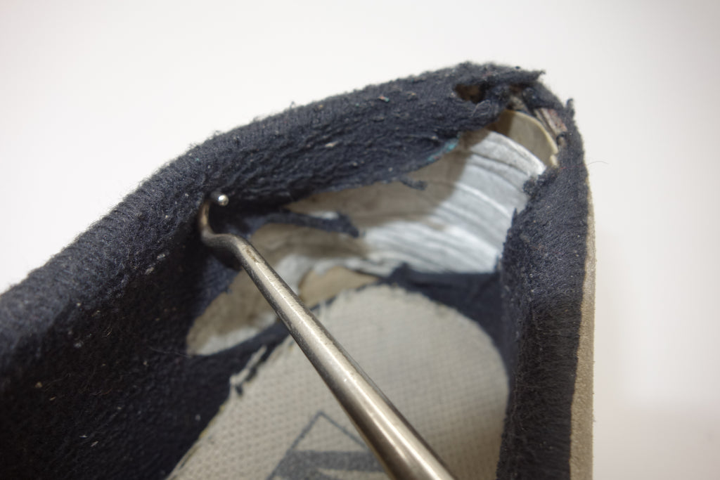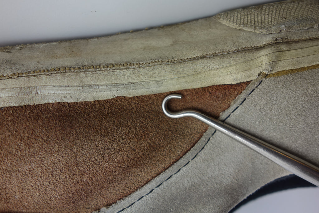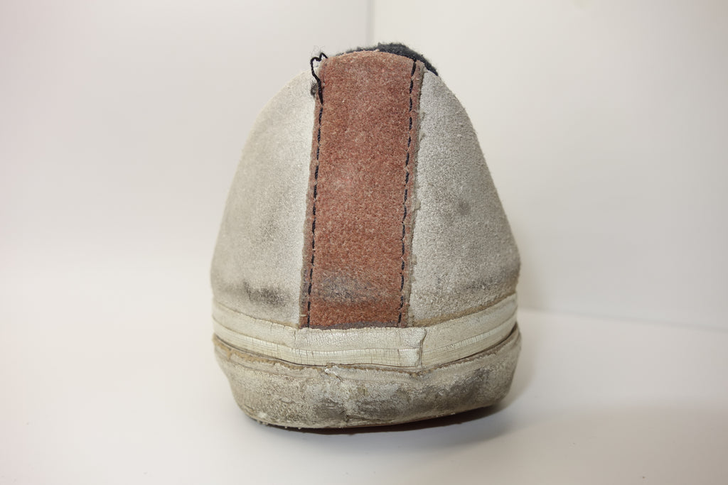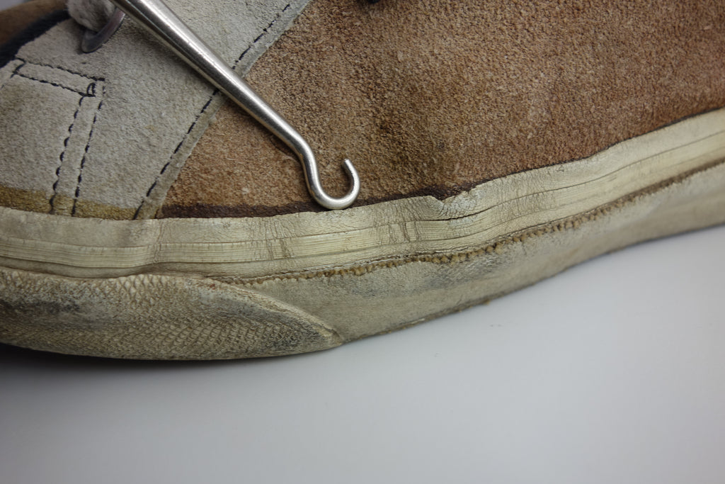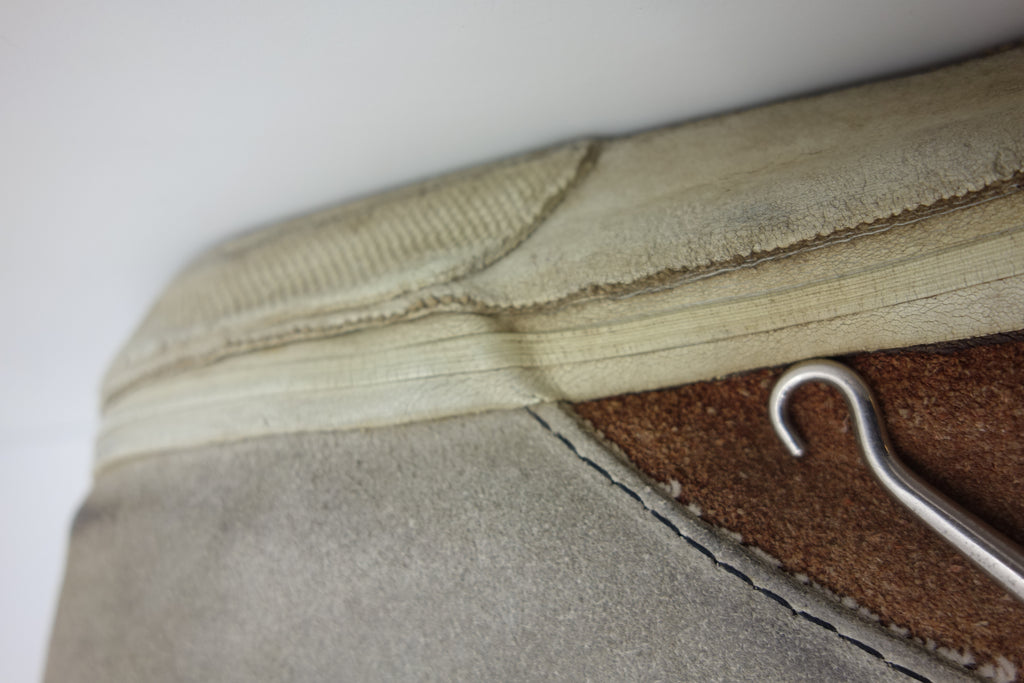 decent used condition. the white rubber is dry rather than hard. from experience these will hold up to normal wear with possible flaking of rubber in crusty areas. wear to the tricot lining of the heel of both shoes exposes the styrofoam reinforcement. the left styrofoam was completely pulped & has split down the back however both plastic heel counters behind are intact. some wear to inner lining at big toes through to suede. no size visible but fairly confident of US8.5.