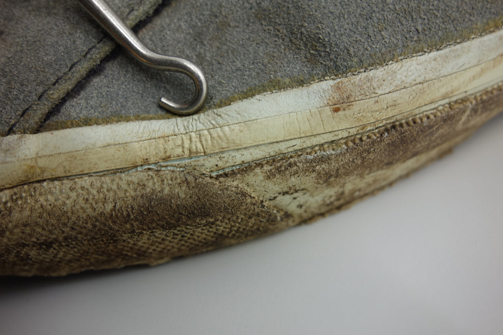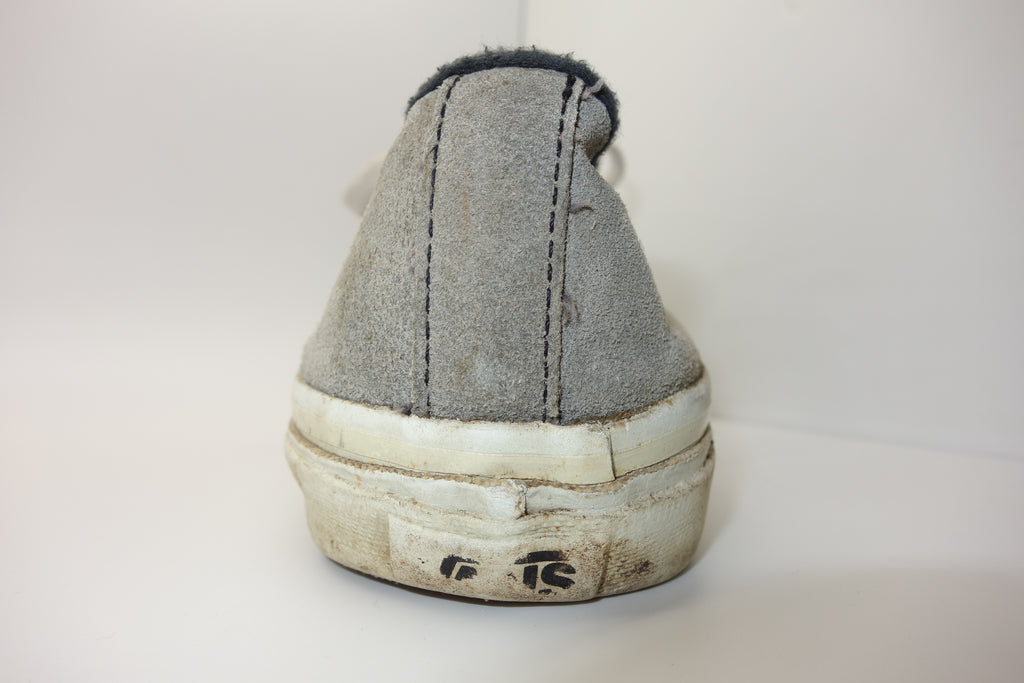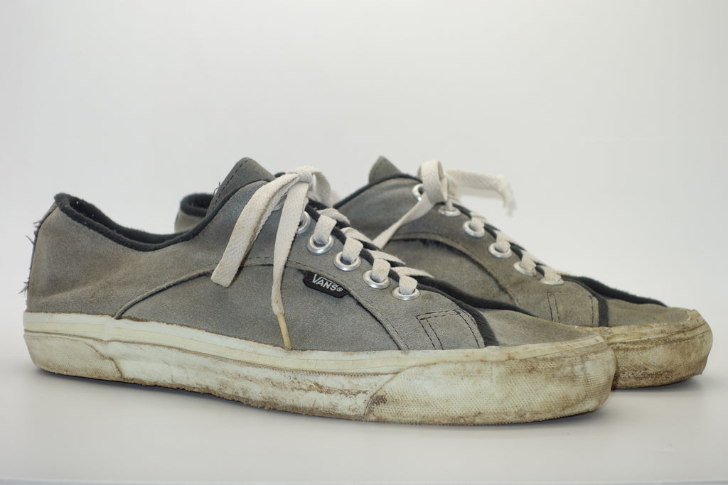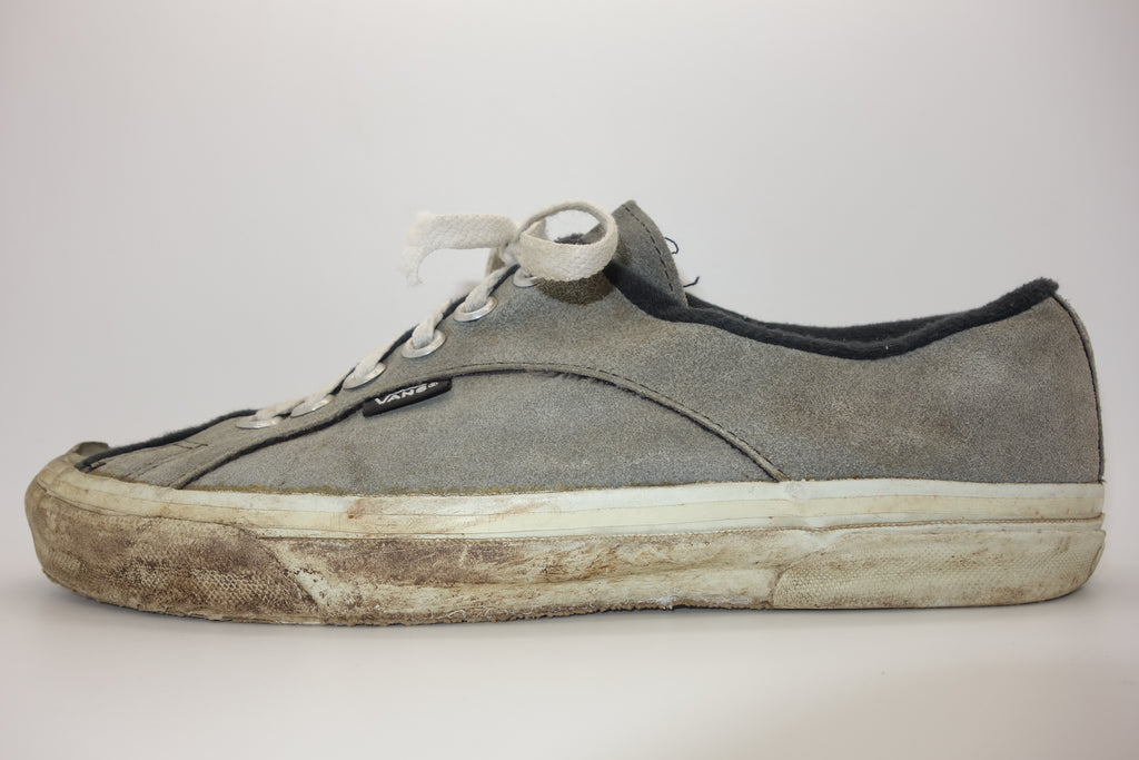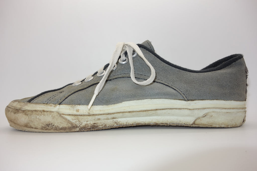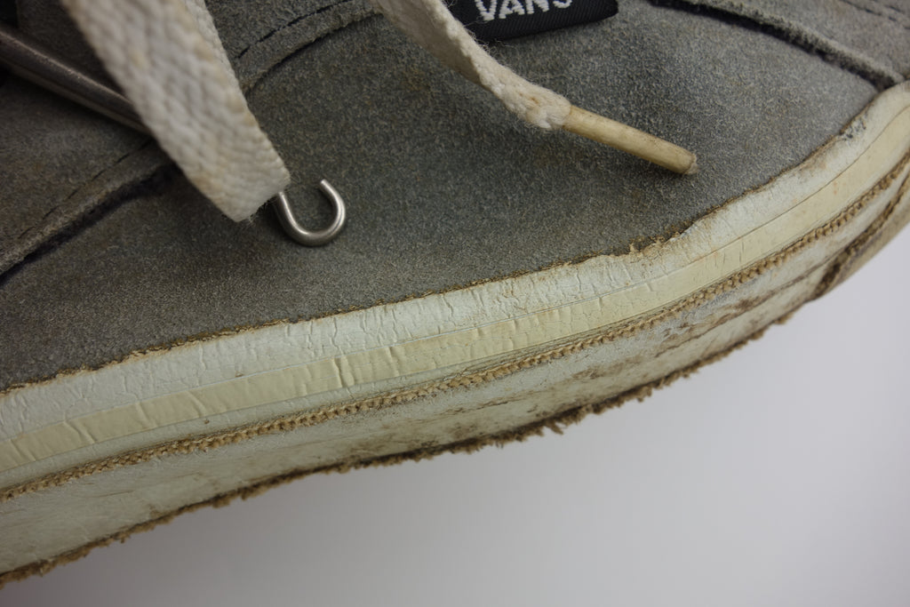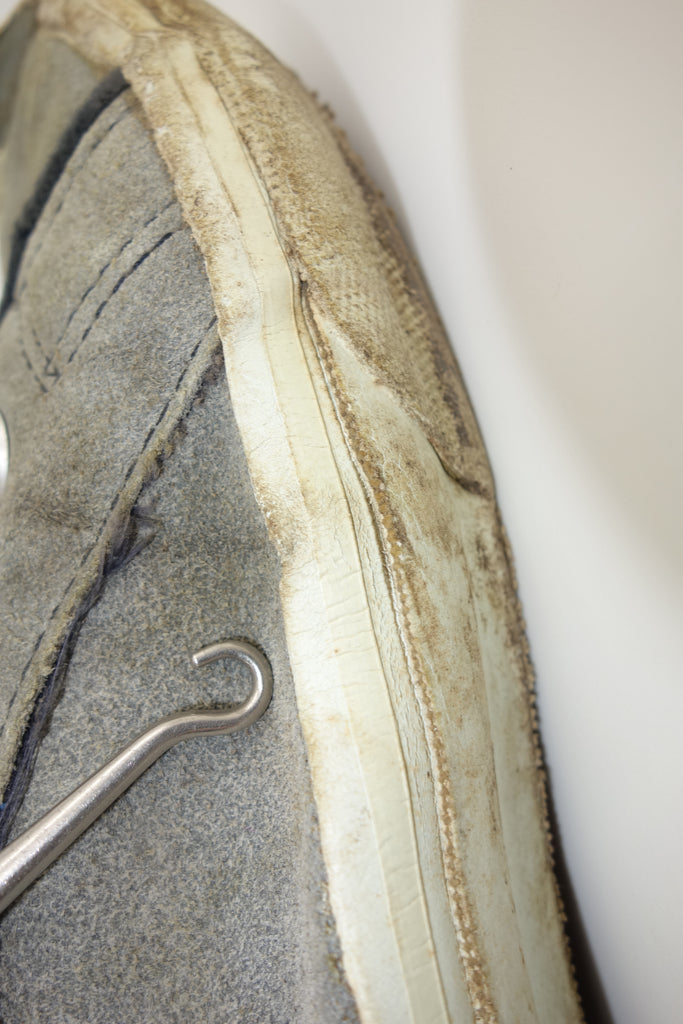 rubber is more dry than it is hard however in some areas it appears it will crack. foxing wont crumble itself but may lead to separation from uppers at bends & possible flaking. several areas of stress cracking from crush injury. suede is somewhat stiff from the elements. size not visible but pretty confident of US9.5. suede looks grey but confident its light blue
