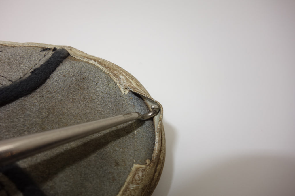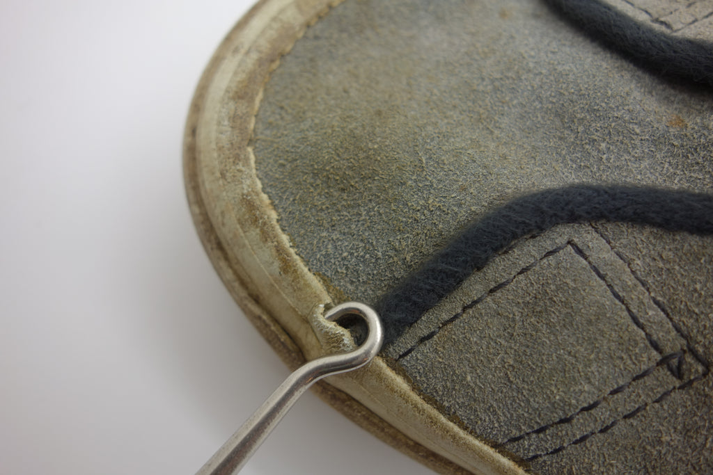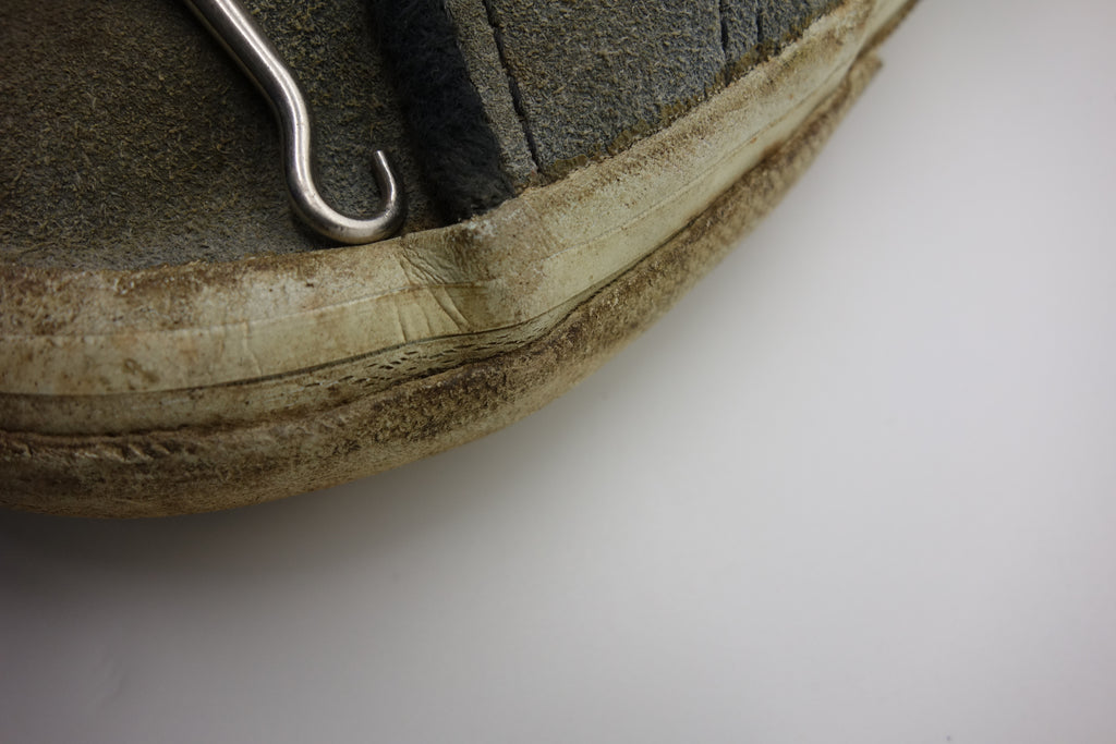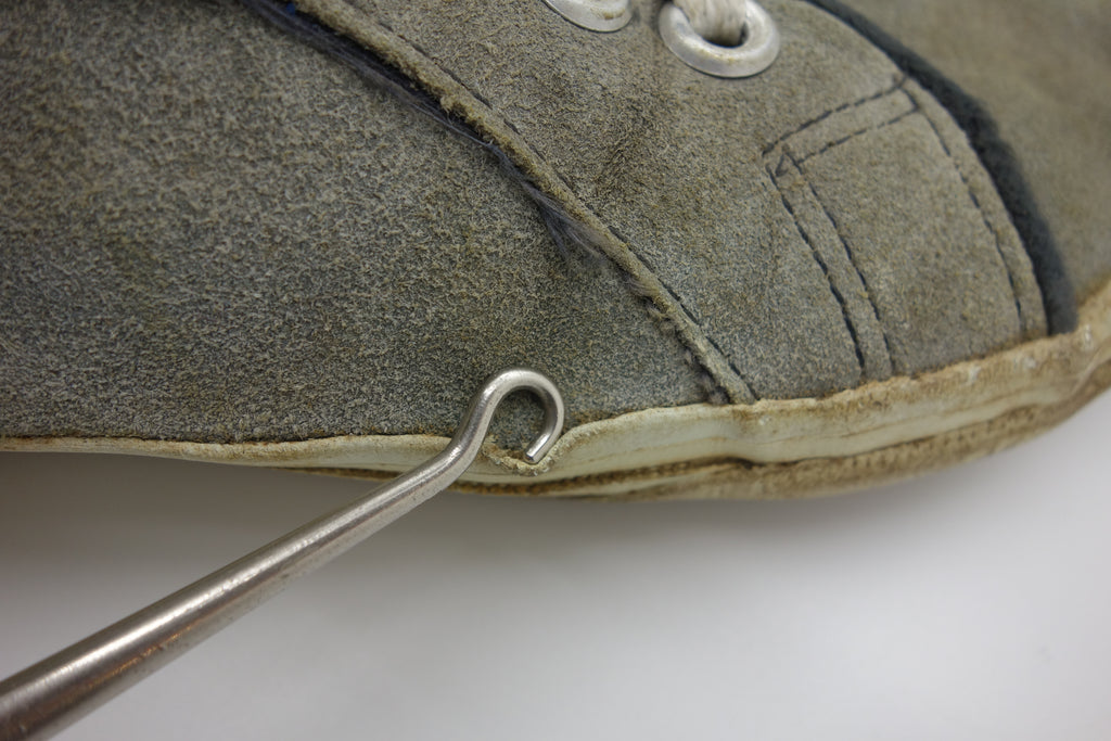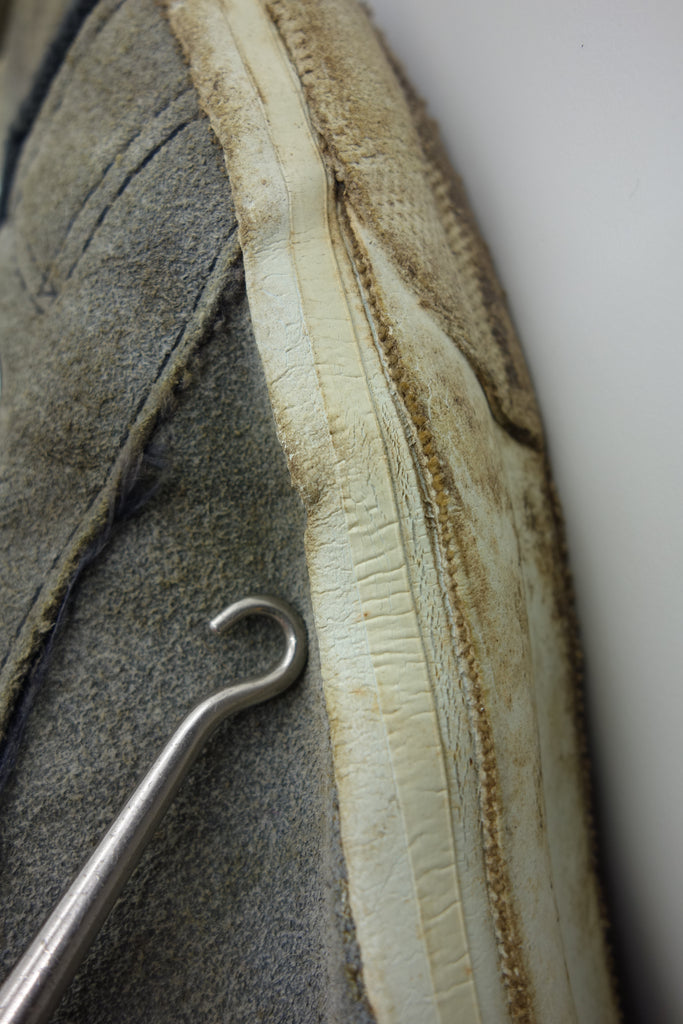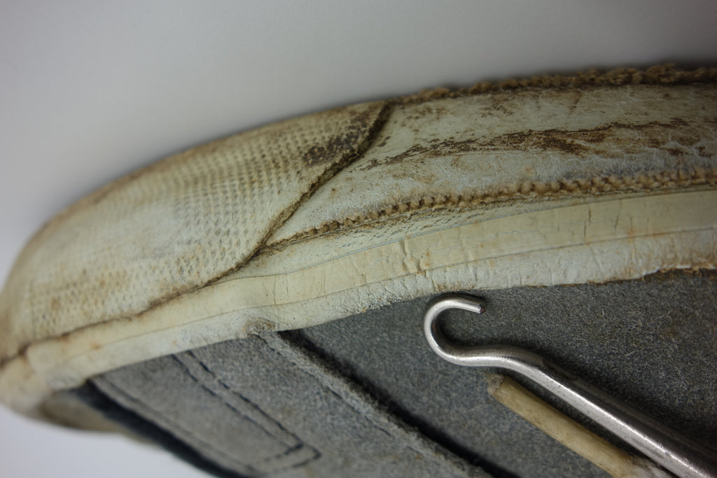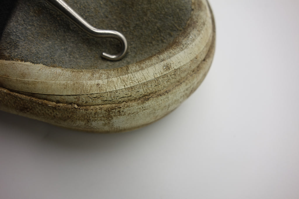 rubber is more dry than it is hard however in some areas it appears it will crack. foxing wont crumble itself but may lead to separation from uppers at bends & possible flaking. several areas of stress cracking from crush injury. suede is somewhat stiff from the elements. size not visible but pretty confident of US9.5. suede looks grey but confident its light blue