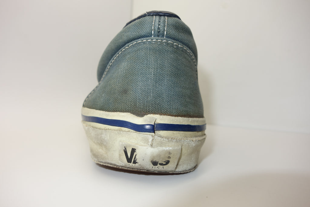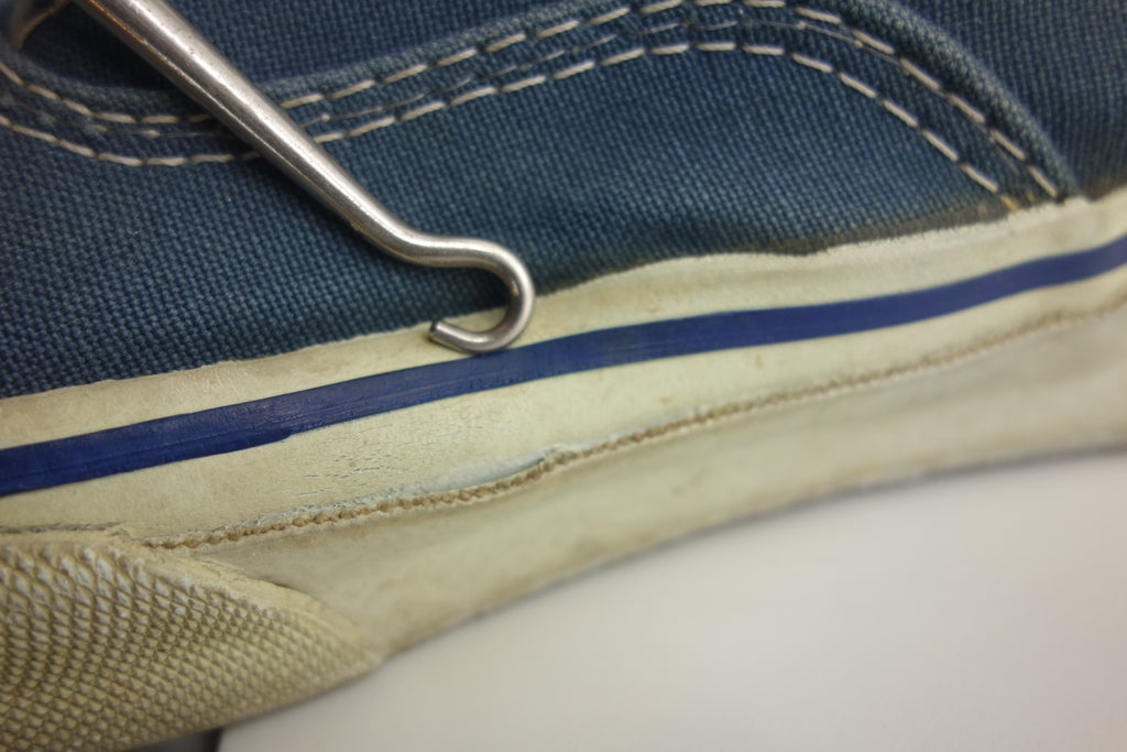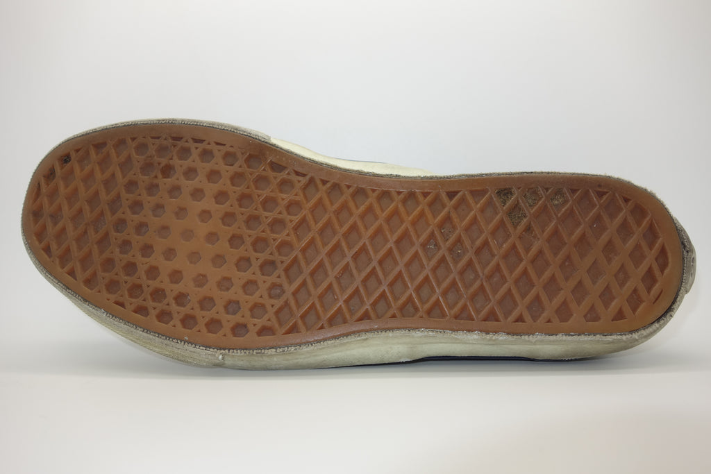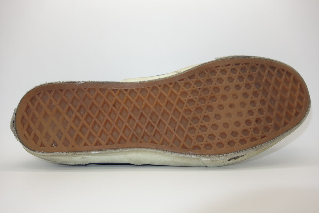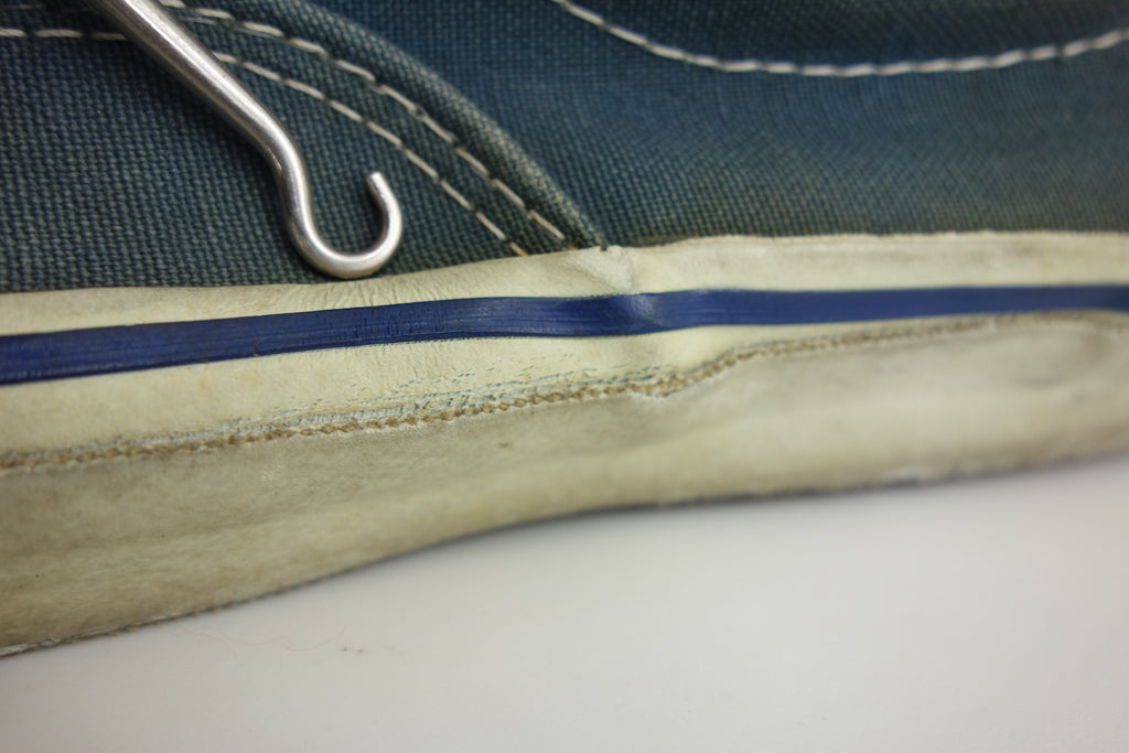 good used condition. the white rubber first foxing stripe area is somewhat dry however remains soft. some stress cracking & separation from uppers at bends. the left collar shows vinyl splits at the base however intact.