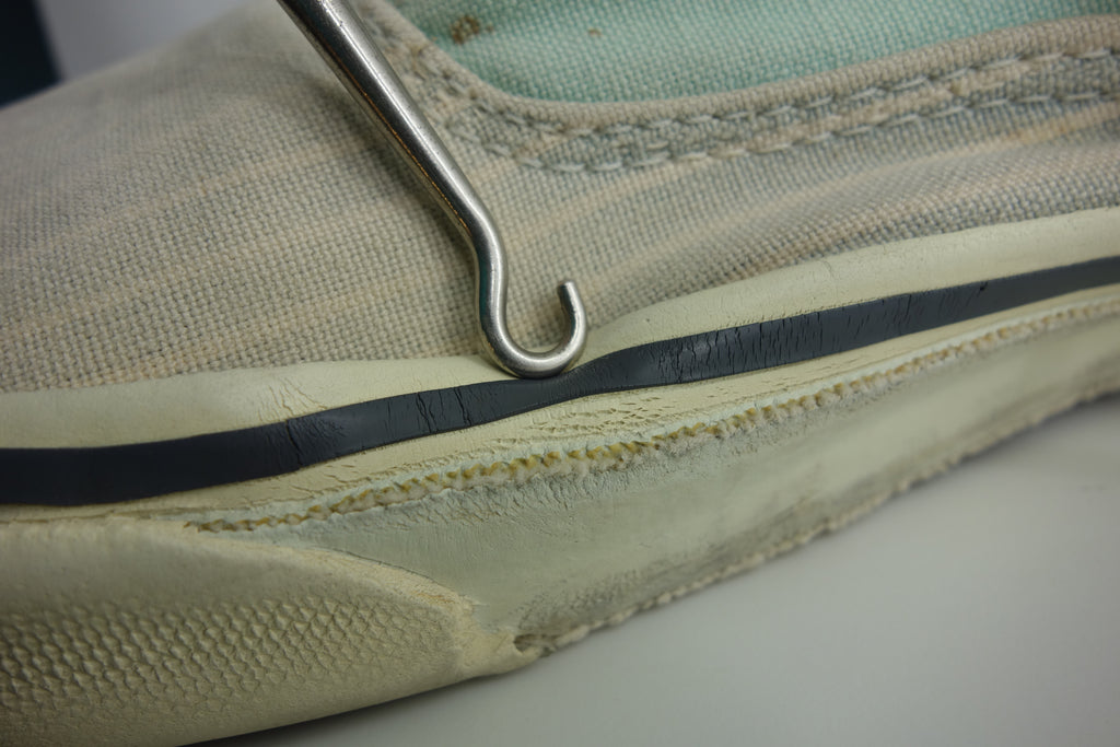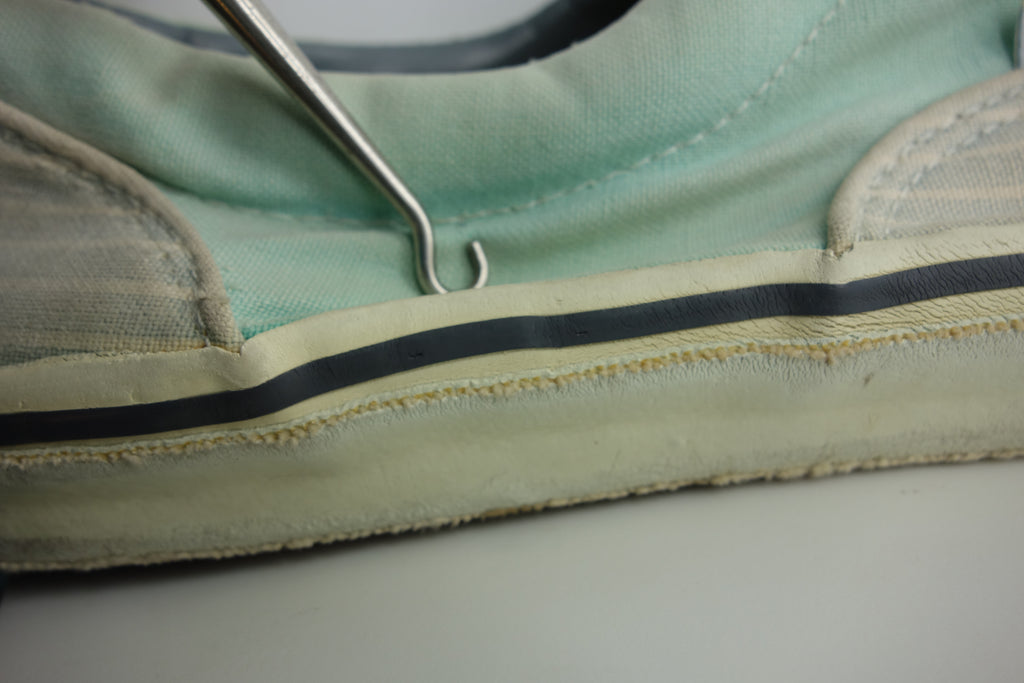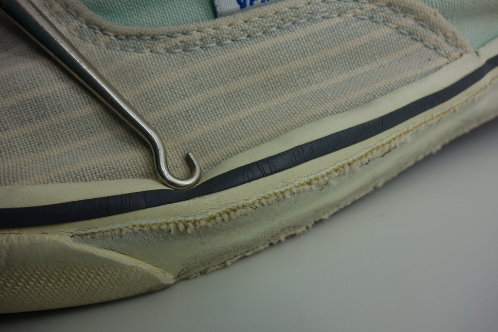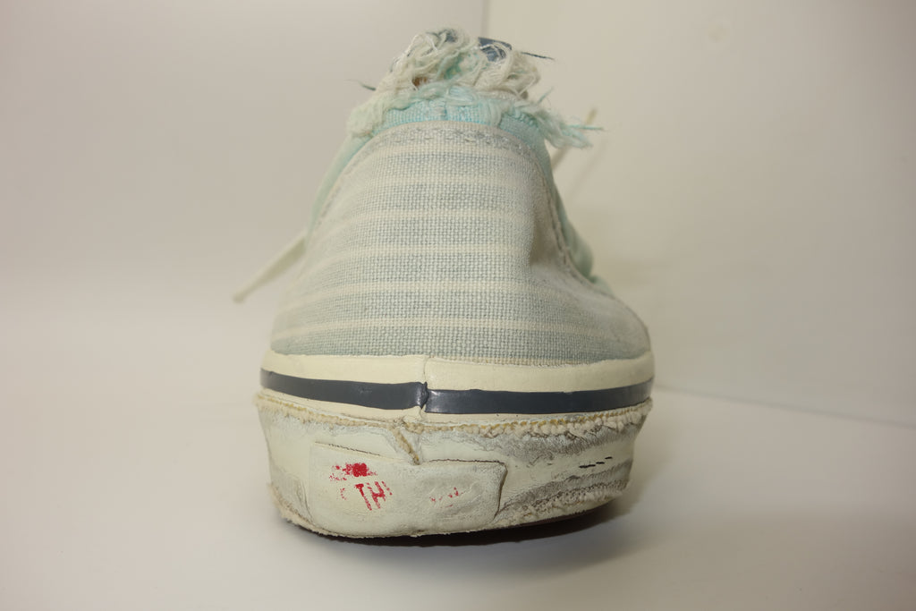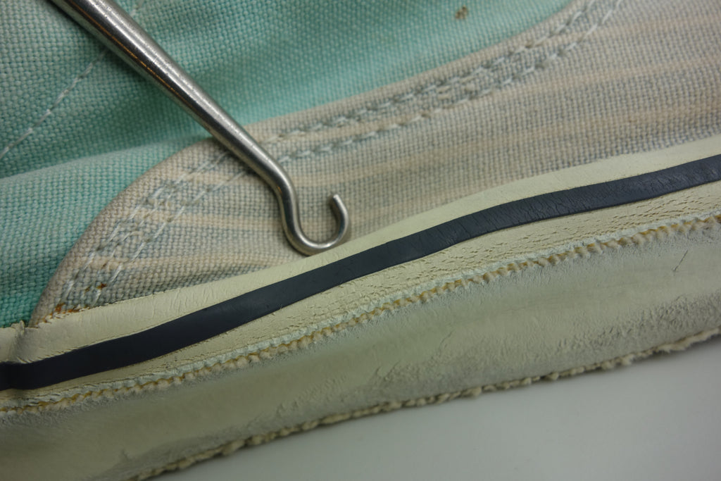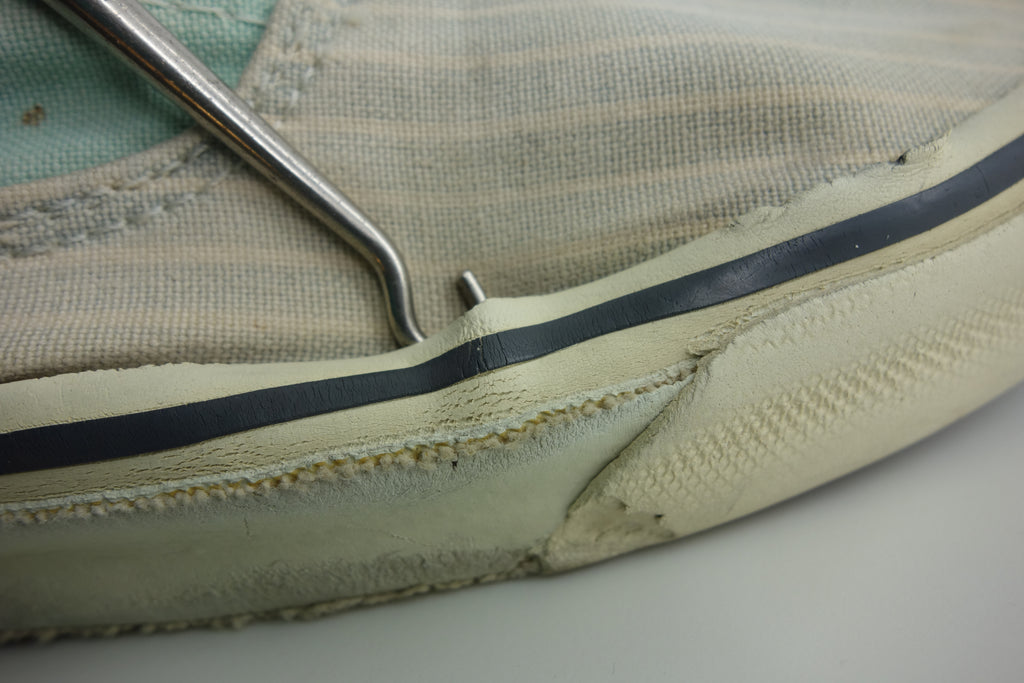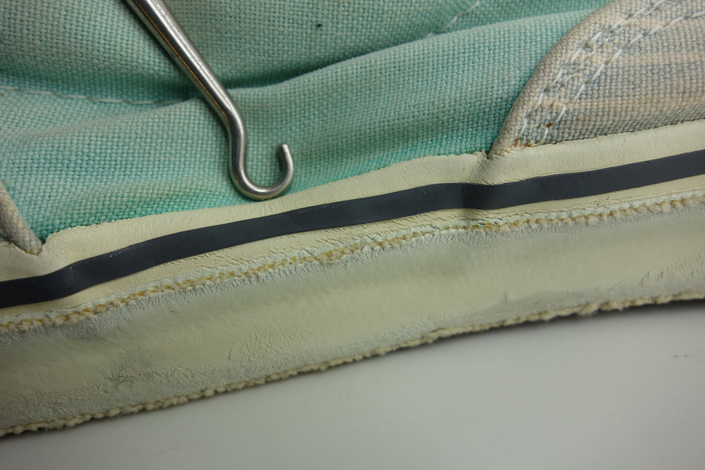 decent used condition. all rubber remains soft & flexible with widespread separation from uppers & stress cracking from crush injury. the internal toe caps are both missing with wear through to canvas. internal heel counters show splits as does the vinyl collar which is pretty pulped, exposing foam fiber fill.