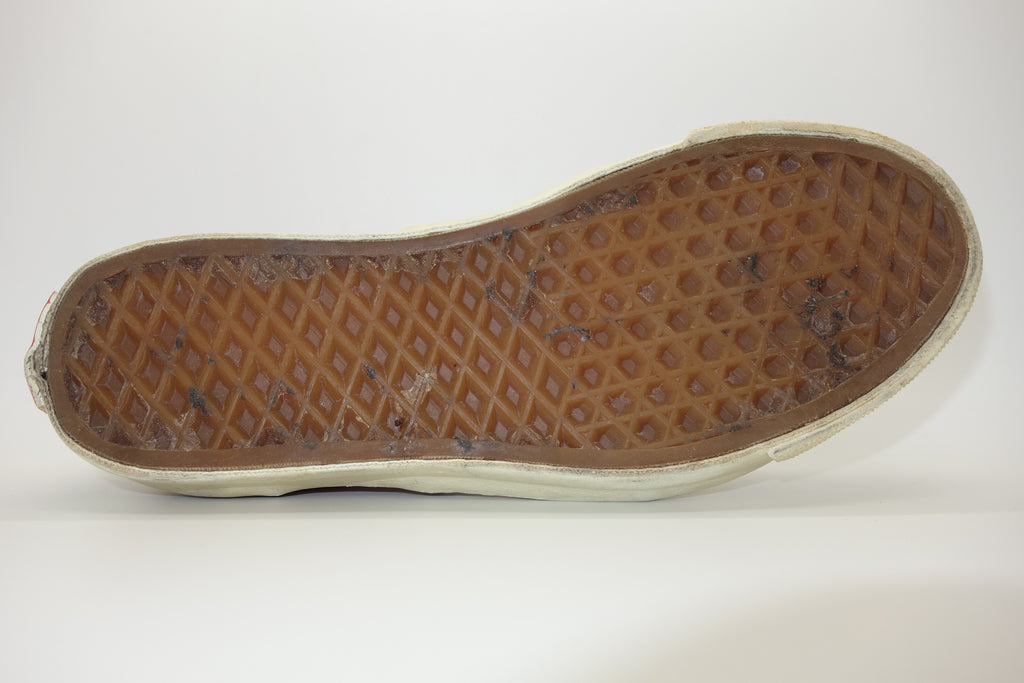 excellent used condition. all rubber remains soft & flexible despite widespread dryness to the left shoe. the first foxing on the left shoe is crusty more than it is hard however may crack over time. some stress cracking from crush injury. no original laces. wear at own risk